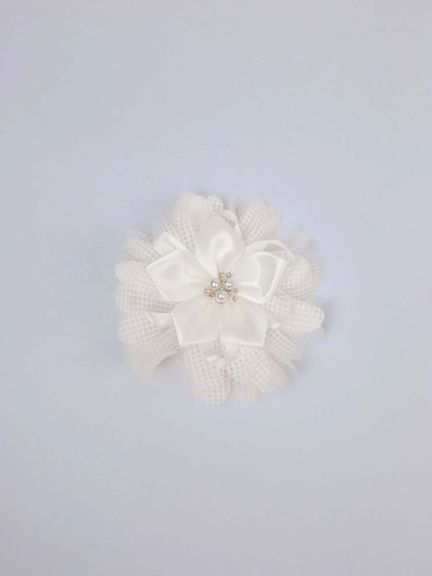Элегантный белый бантик с цветком из атласных лепестков и декоративными бусинами в центре. Лёгкая сетчатая окантовка придаёт изделию воздушность и изысканность. Идеально подойдёт для праздничных причёсок, утренников или торжественных мероприятий.