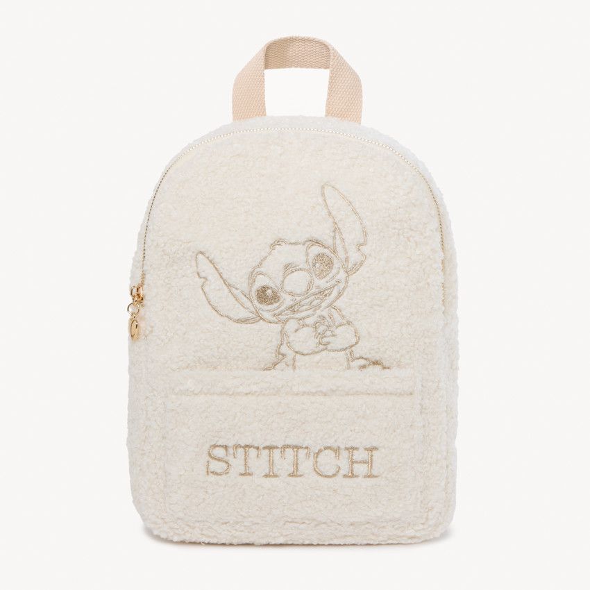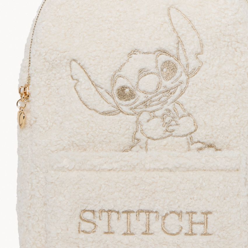 Модель оснащена верхней ручкой для переноски и застёжкой-молнией с золотистым покрытием, а бегунок в форме сердца добавляет игривости. Спереди — золотая вышивка с изображением Stitch и карман для хранения мелочей.