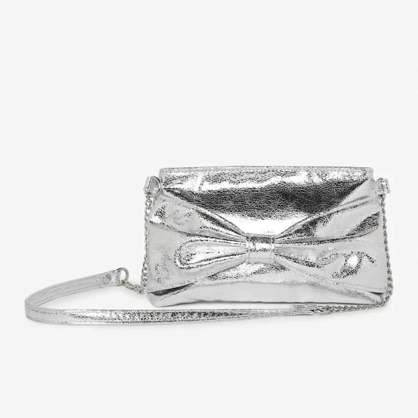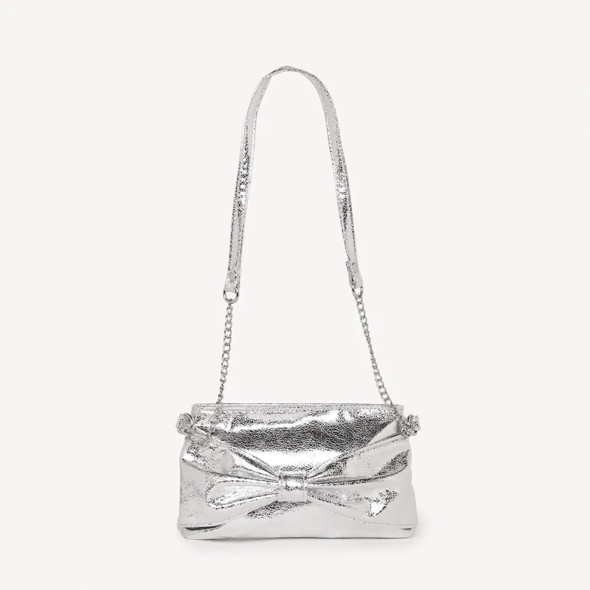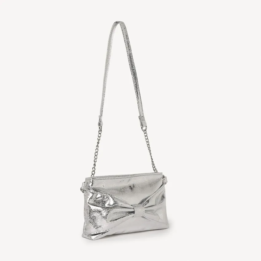 Сумка через плечо из металлизированной искусственной кожи серого цвета. На передней части украшена большим декоративным бантом. Верхняя застёжка — молния. Ремешок выполнен в виде металлической цепочки с вставками из искусственной кожи.