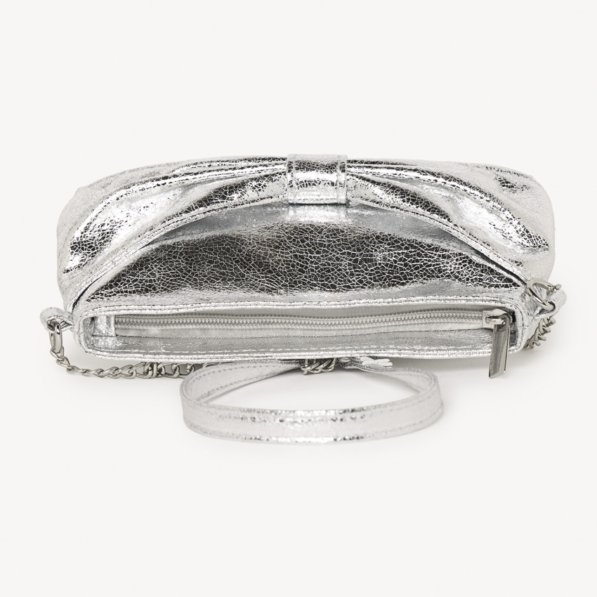 | Сумка через плечо из металлизированной искусственной кожи серого цвета. На передней части украшена большим декоративным бантом. Верхняя застёжка — молния. Ремешок выполнен в виде металлической цепочки с вставками из искусственной кожи. |