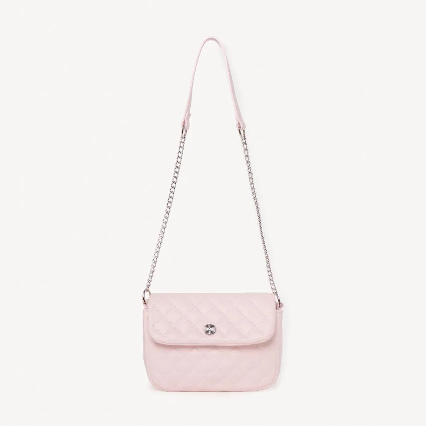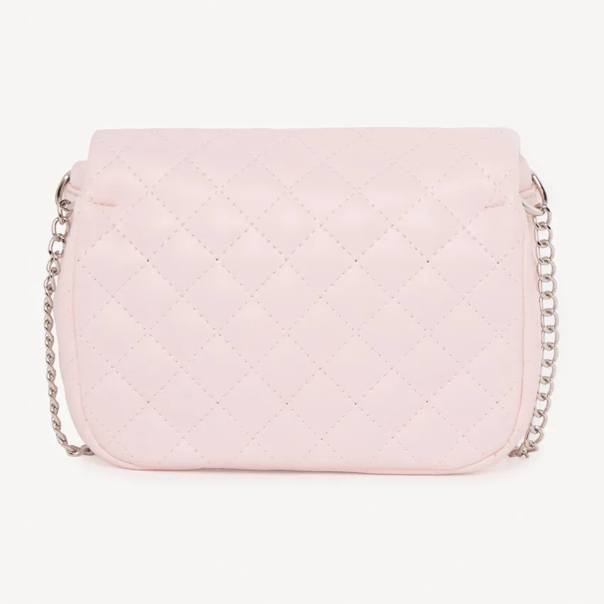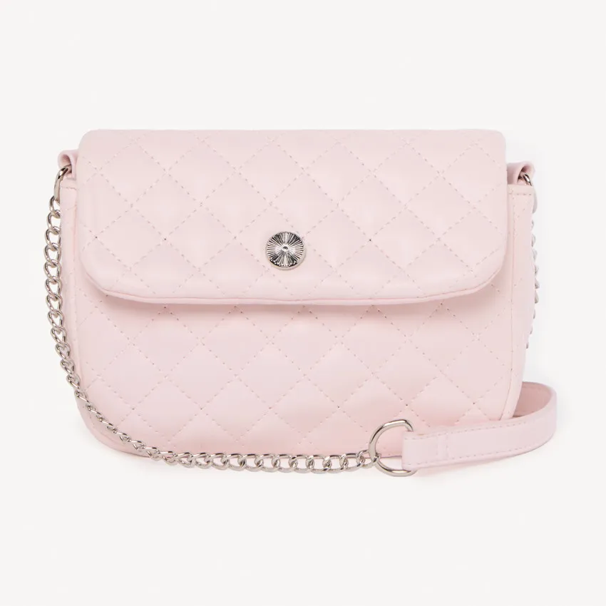 Стильная сумка через плечо станет модным дополнением детского образа. Модель выполнена из материала с эффектом стёганой кожи в нежном розовом цвете и украшена декоративной строчкой крест-накрест.
