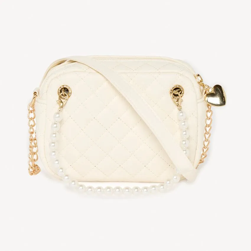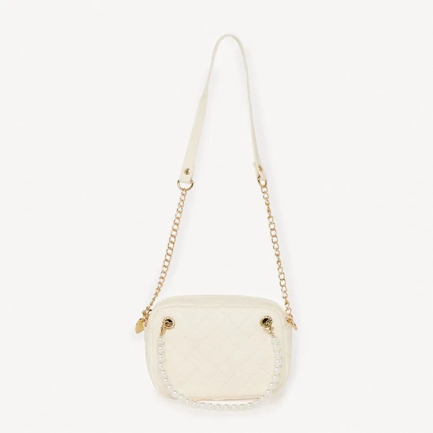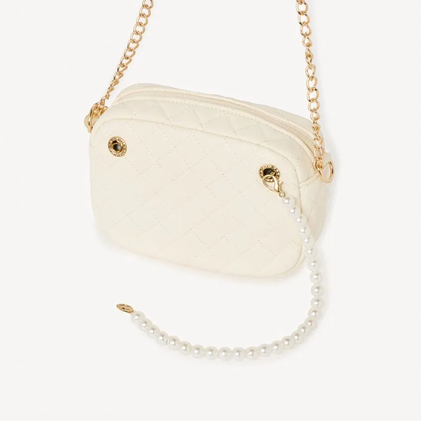 По бокам расположены золотистые люверсы с креплениями для съёмной цепочки с перламутровым эффектом — её можно легко снять или заменить, адаптируя аксессуар под любой образ.