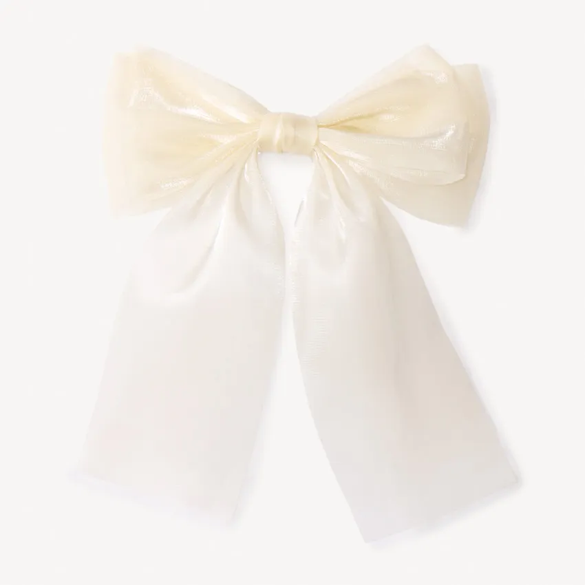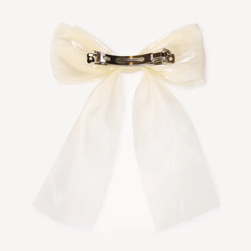 Нежный бант для волос станет красивым акцентом в образе девочки. Модель выполнена из лёгкой органзы в элегантном оттенке айвори, который отлично подходит как для повседневных, так и для праздничных нарядов.