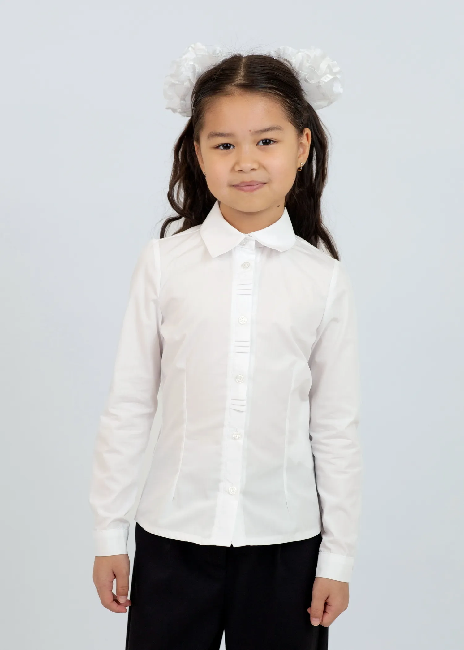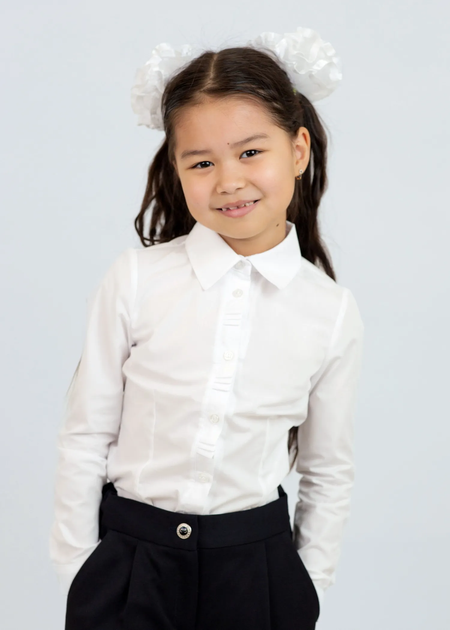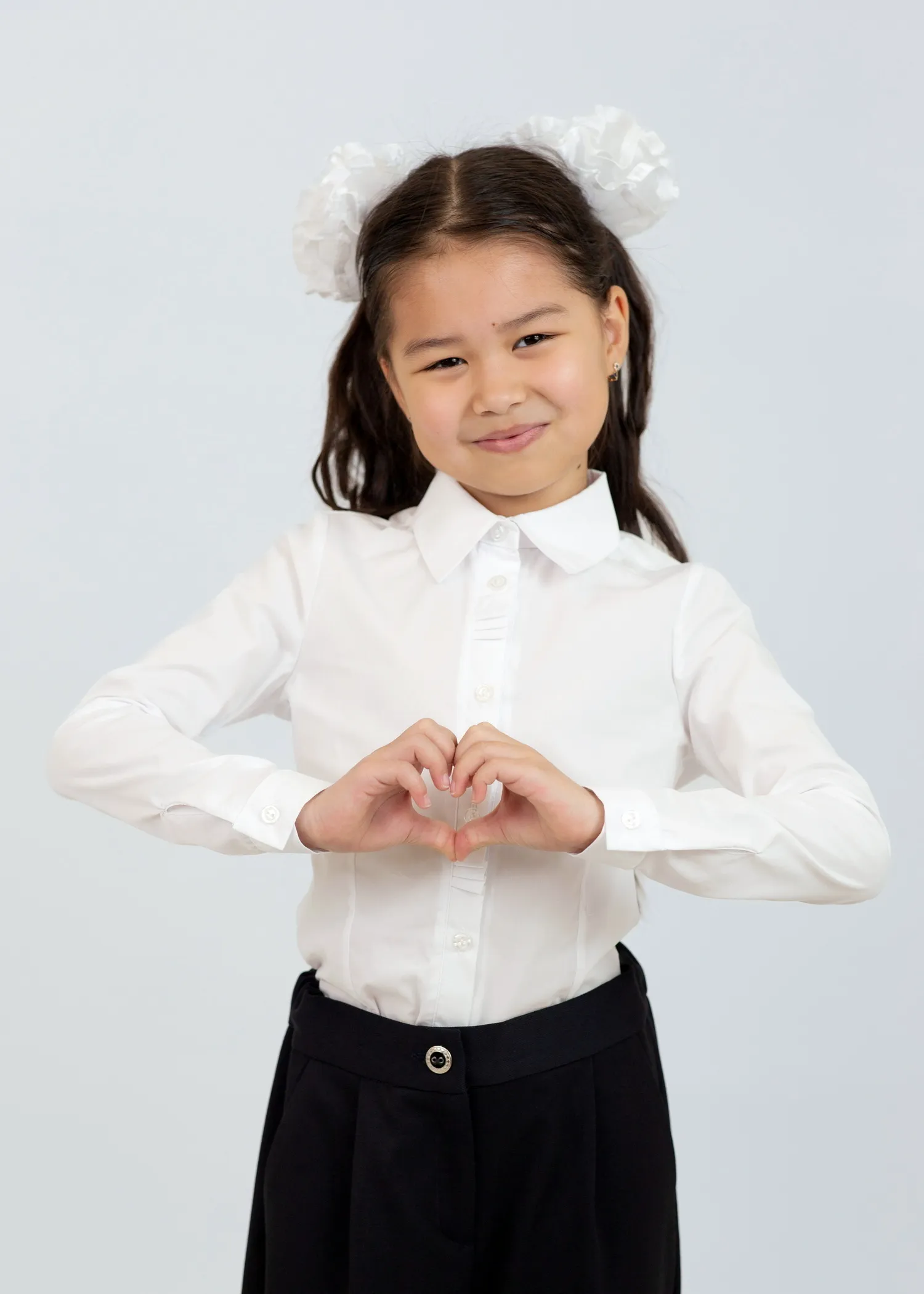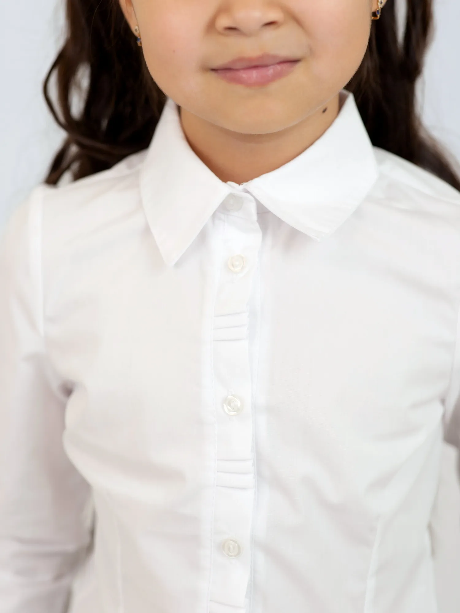 Блузка для девочек полуприлегающего силуэт представлена в белом классическом варианте.