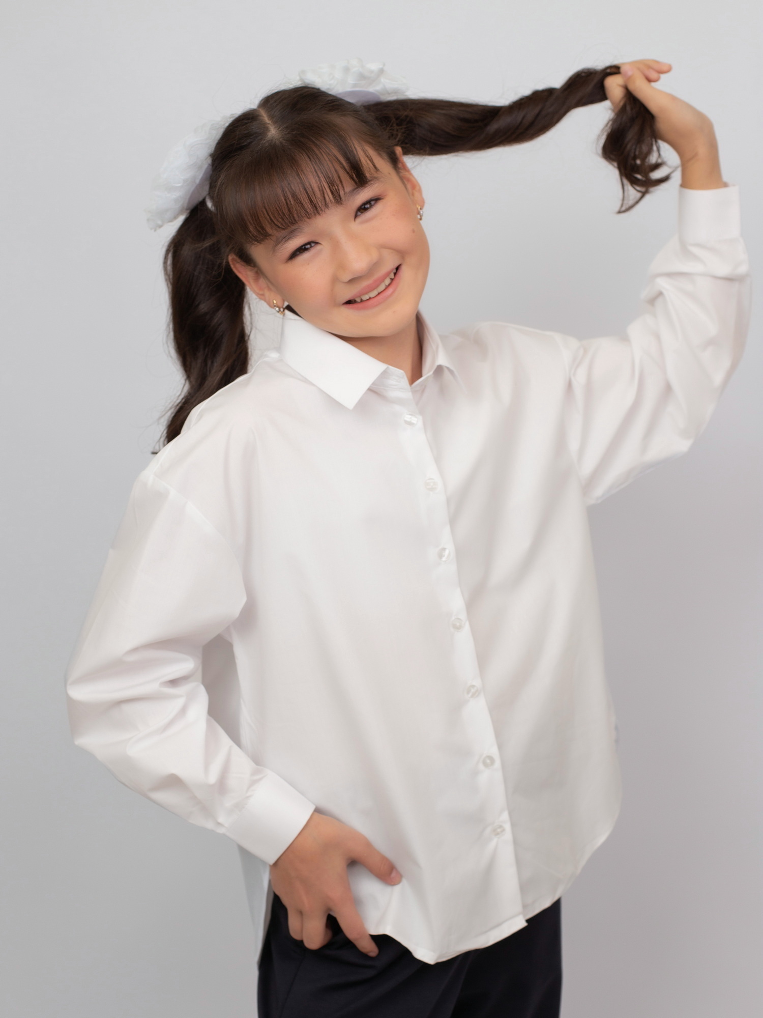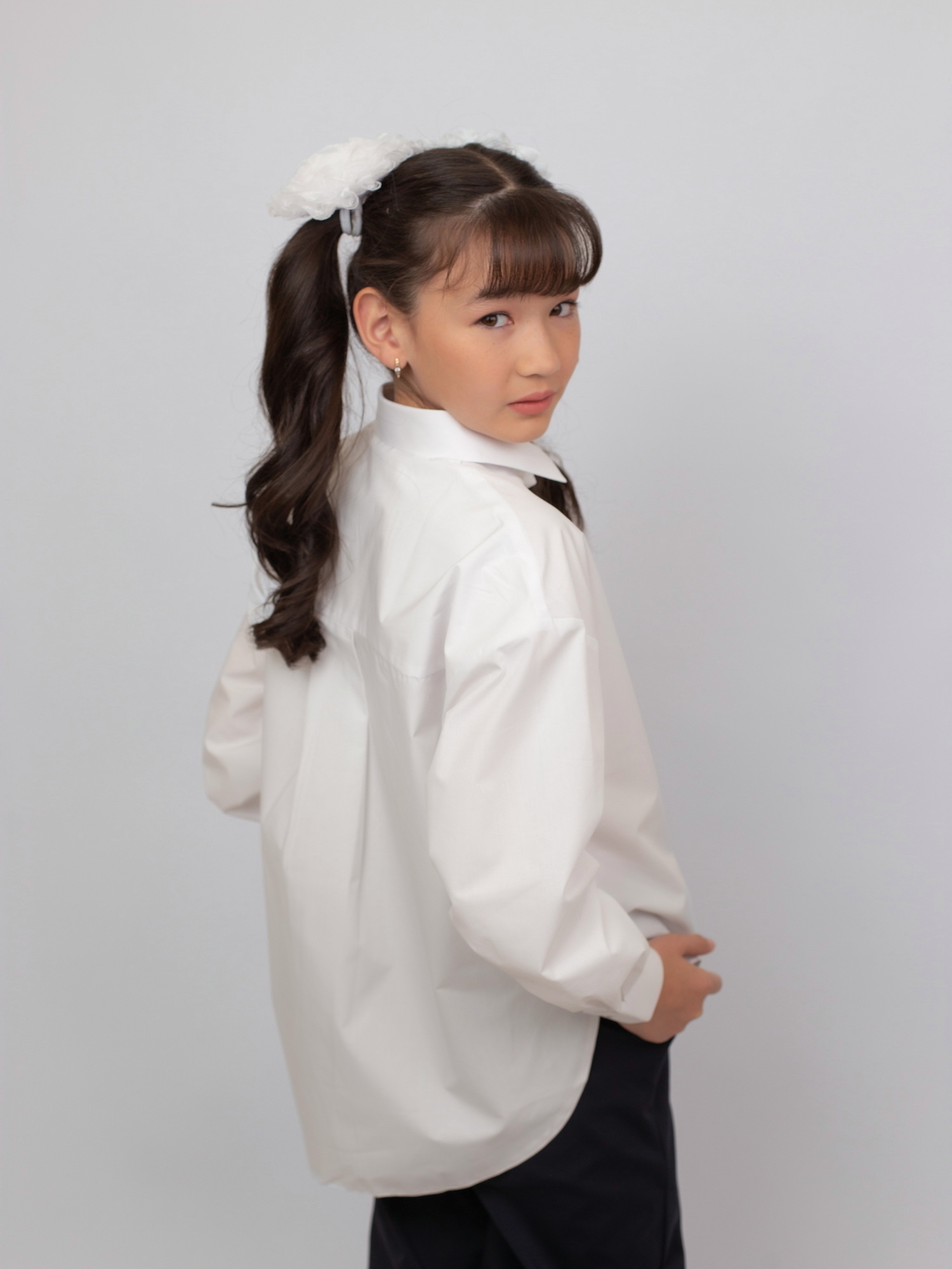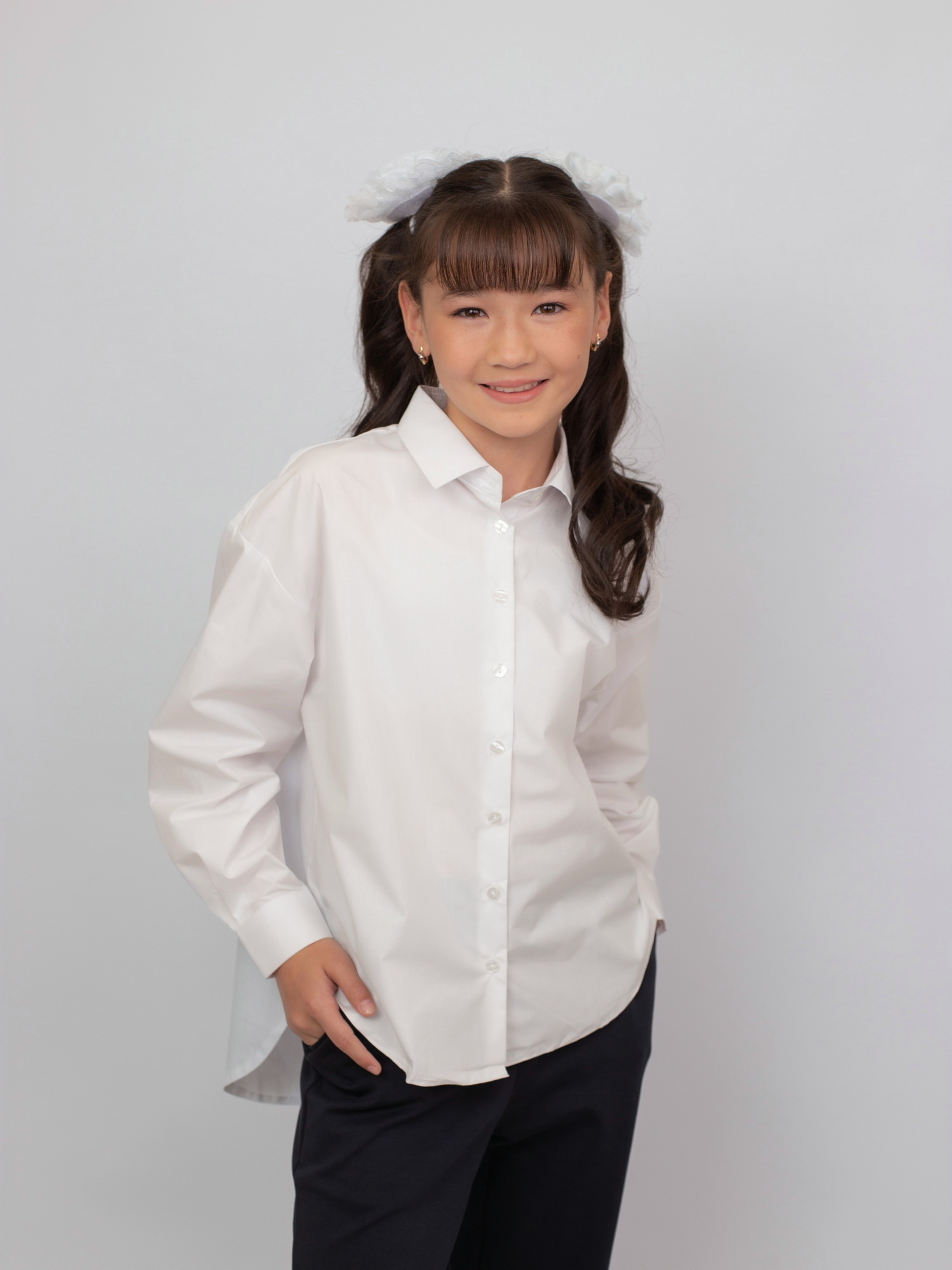 Классический воротник придаёт блузке аккуратный и строгий вид, делая её идеальным вариантом для школьной формы. Свободный крой не сковывает движения и позволяет чувствовать себя уверенно и комфортно в любой обстановке.