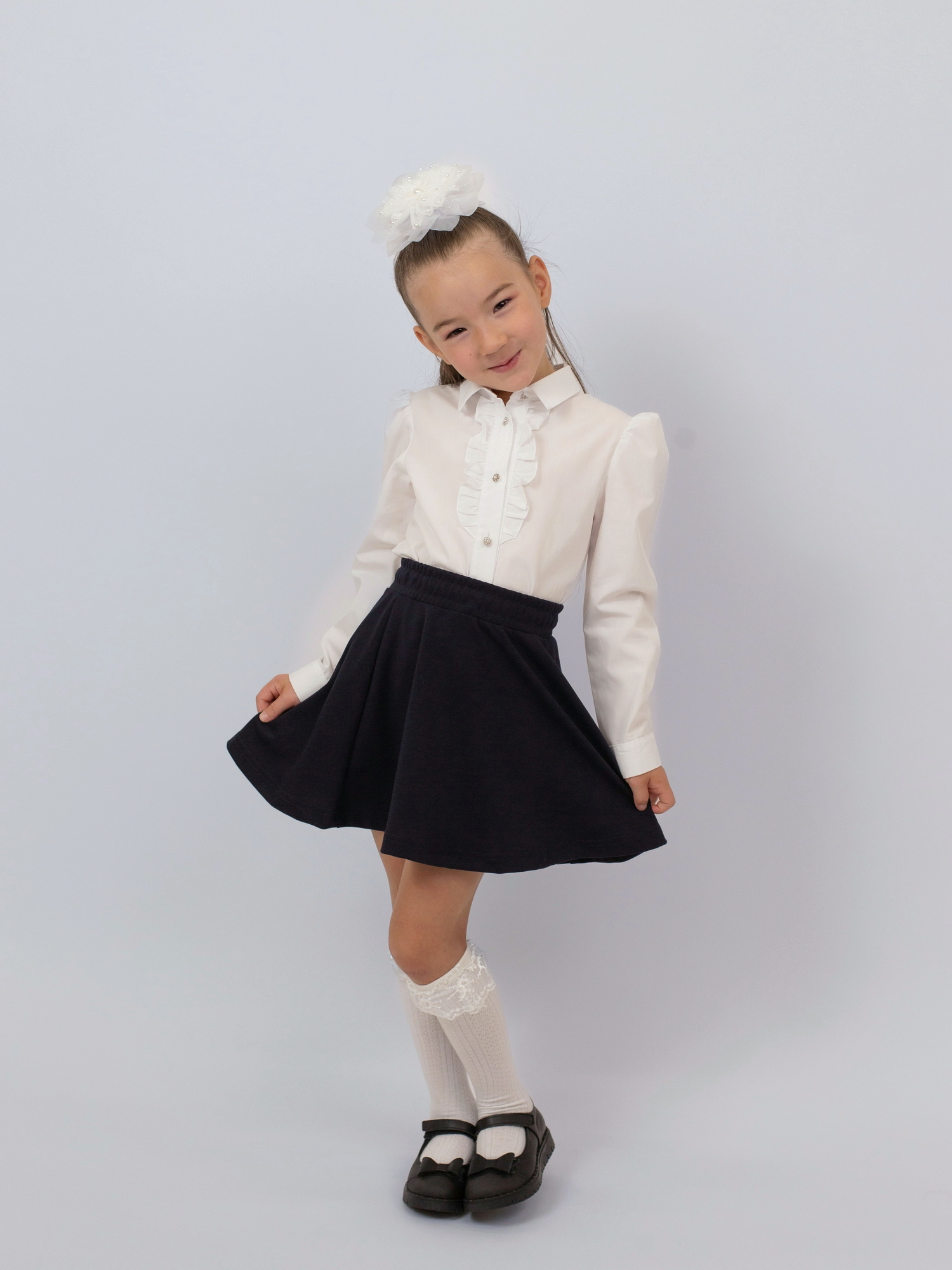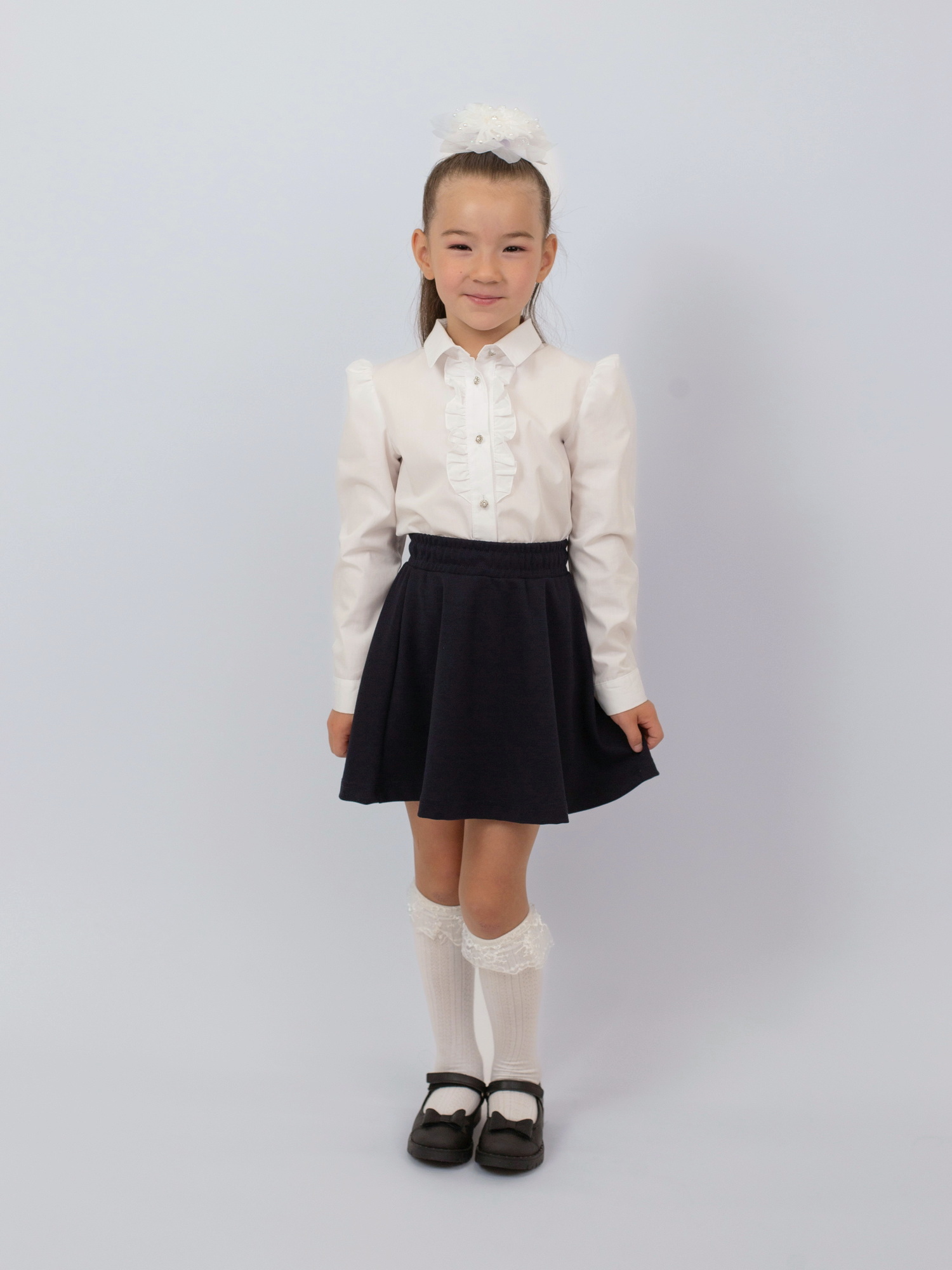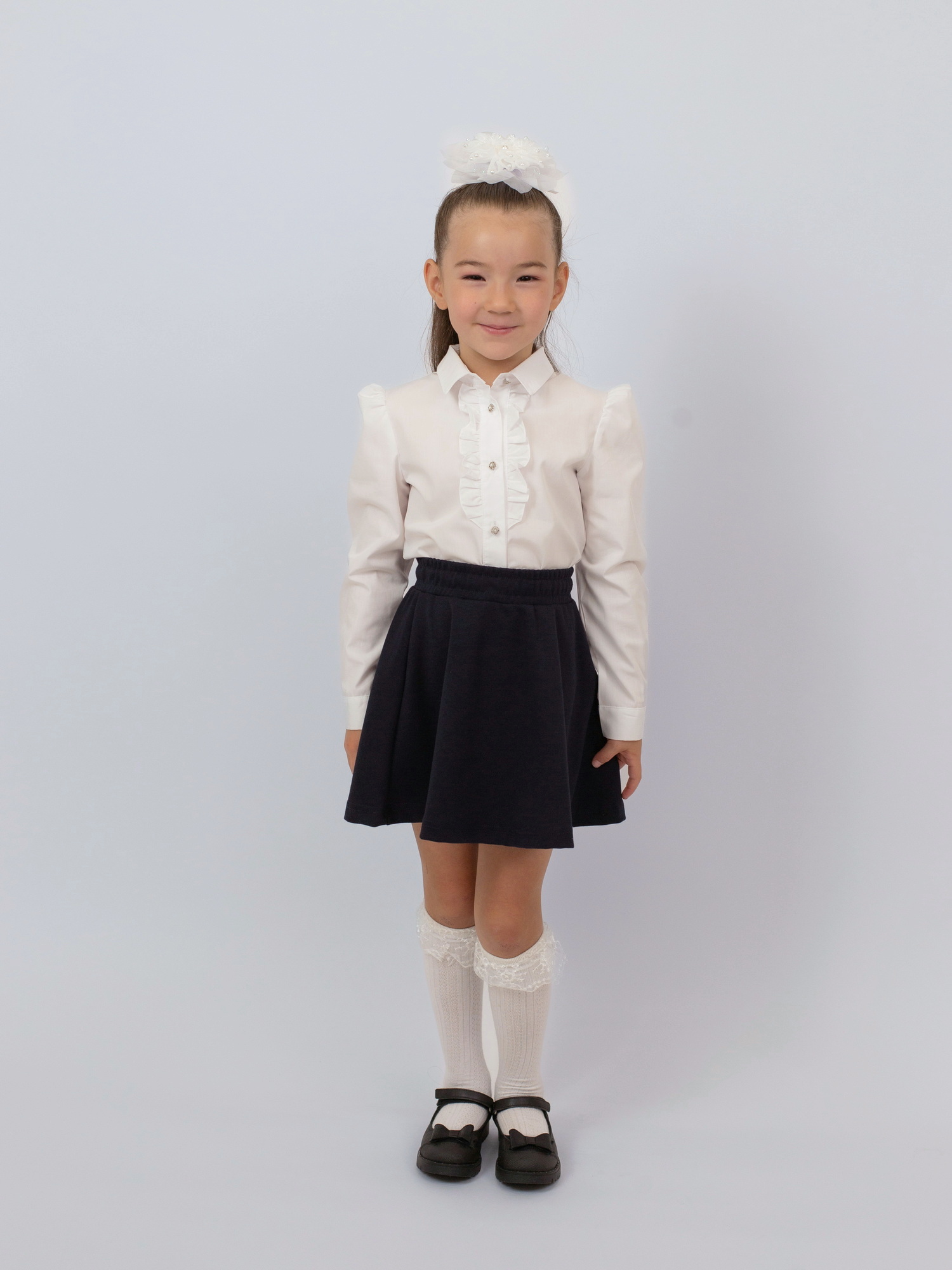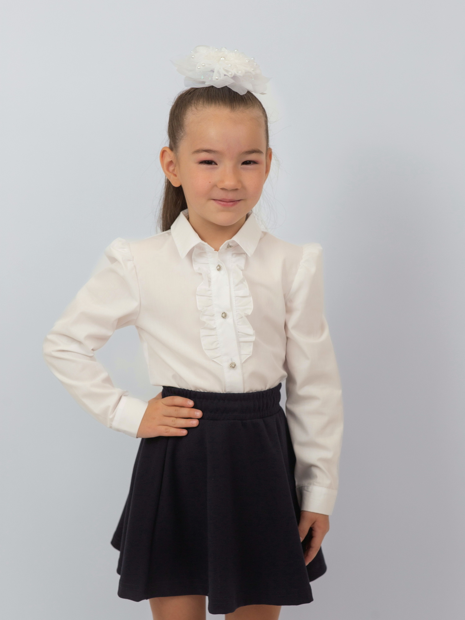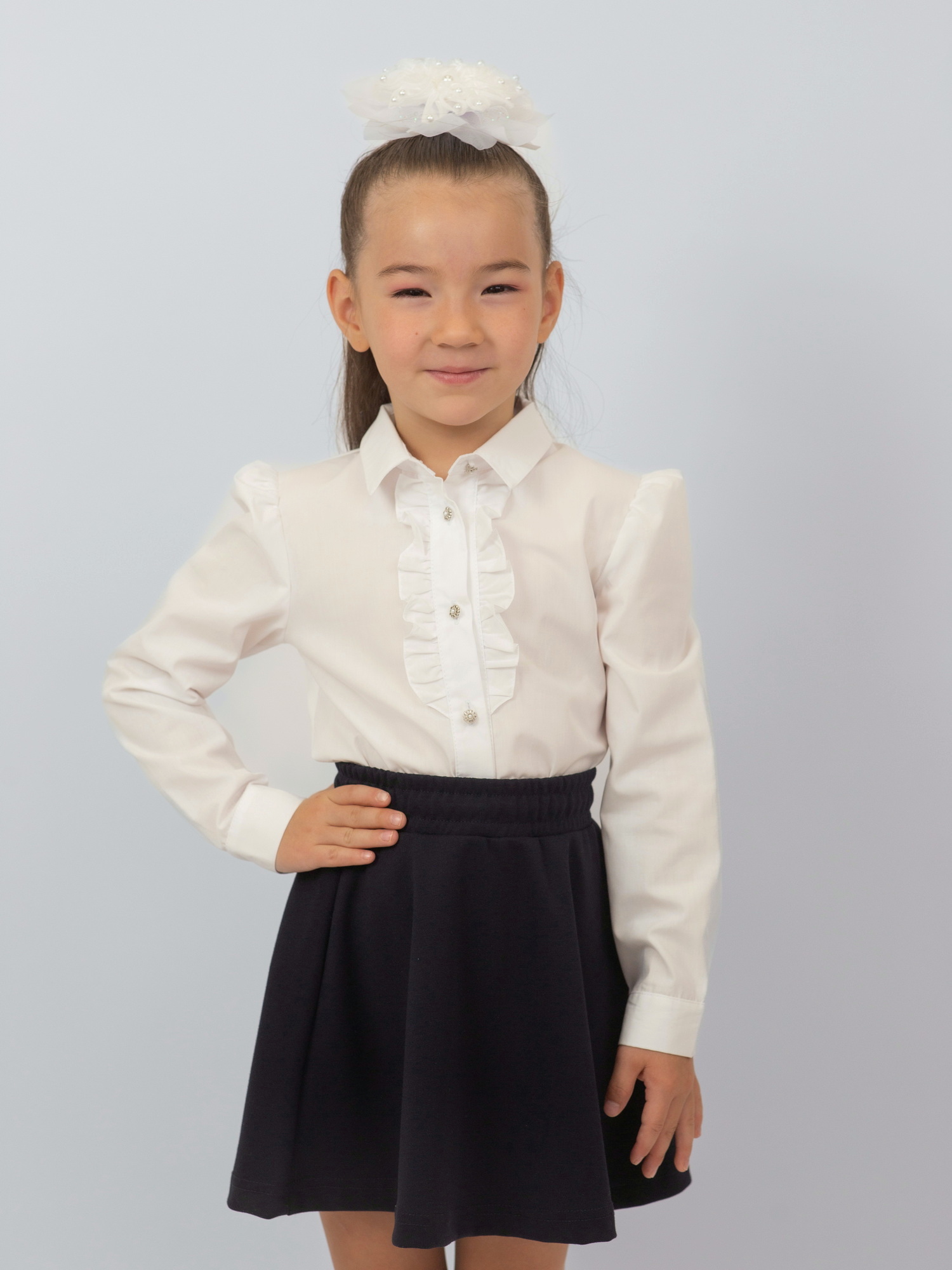 Элегантная и комфортная школьная блузка для девочки с длинными рукавами идеально подойдёт для учебных будней и торжественных мероприятий. Изготовлена из приятного к телу материала — хлопка с добавлением полиэстера, что обеспечивает удобство в носке и лёгкость в уходе. Модель украшена изящными рюшами на груди, которые придают образу утончённость и аккуратность. Прекрасный выбор для стильного и практичного школьного гардероба.
