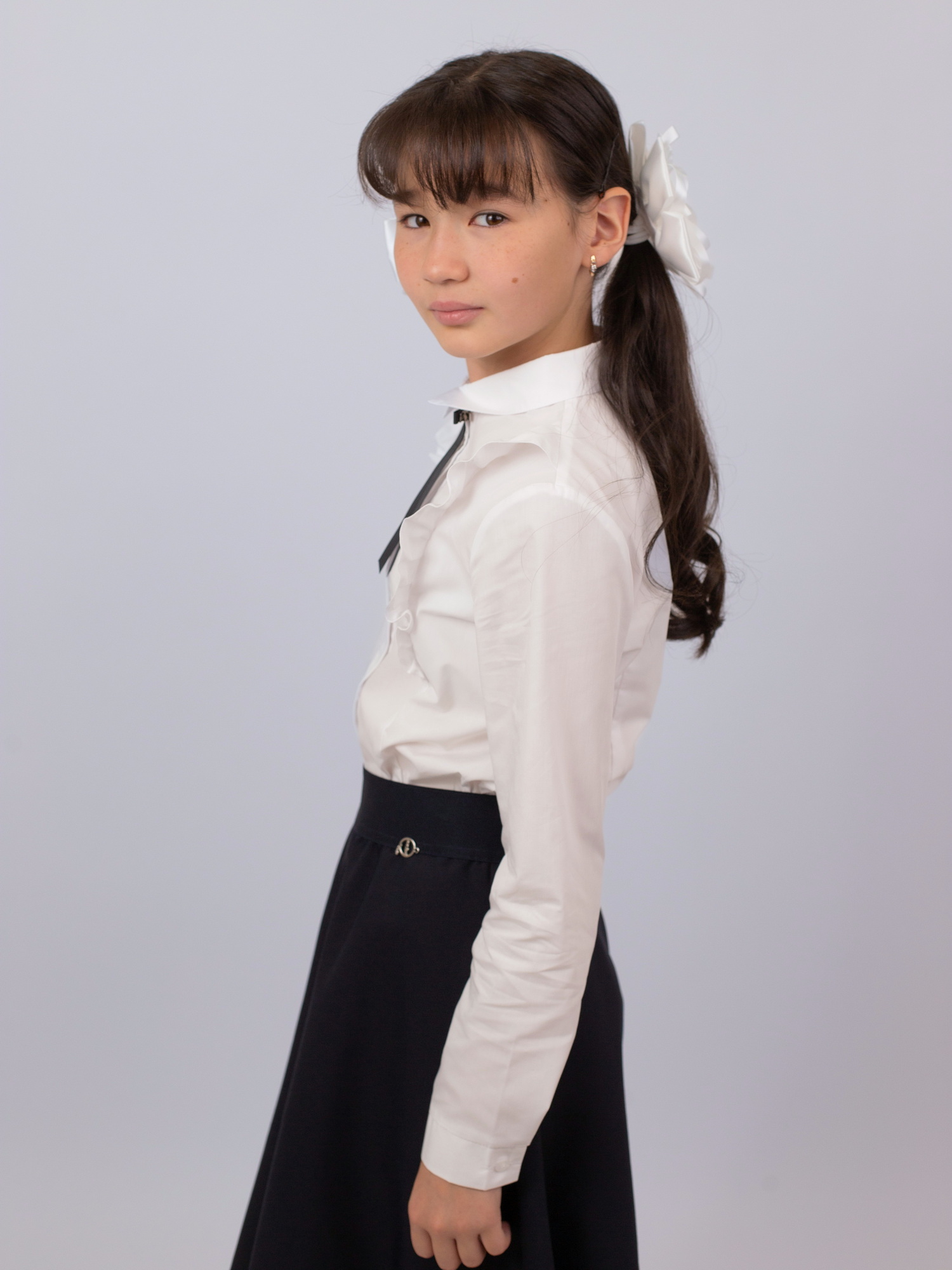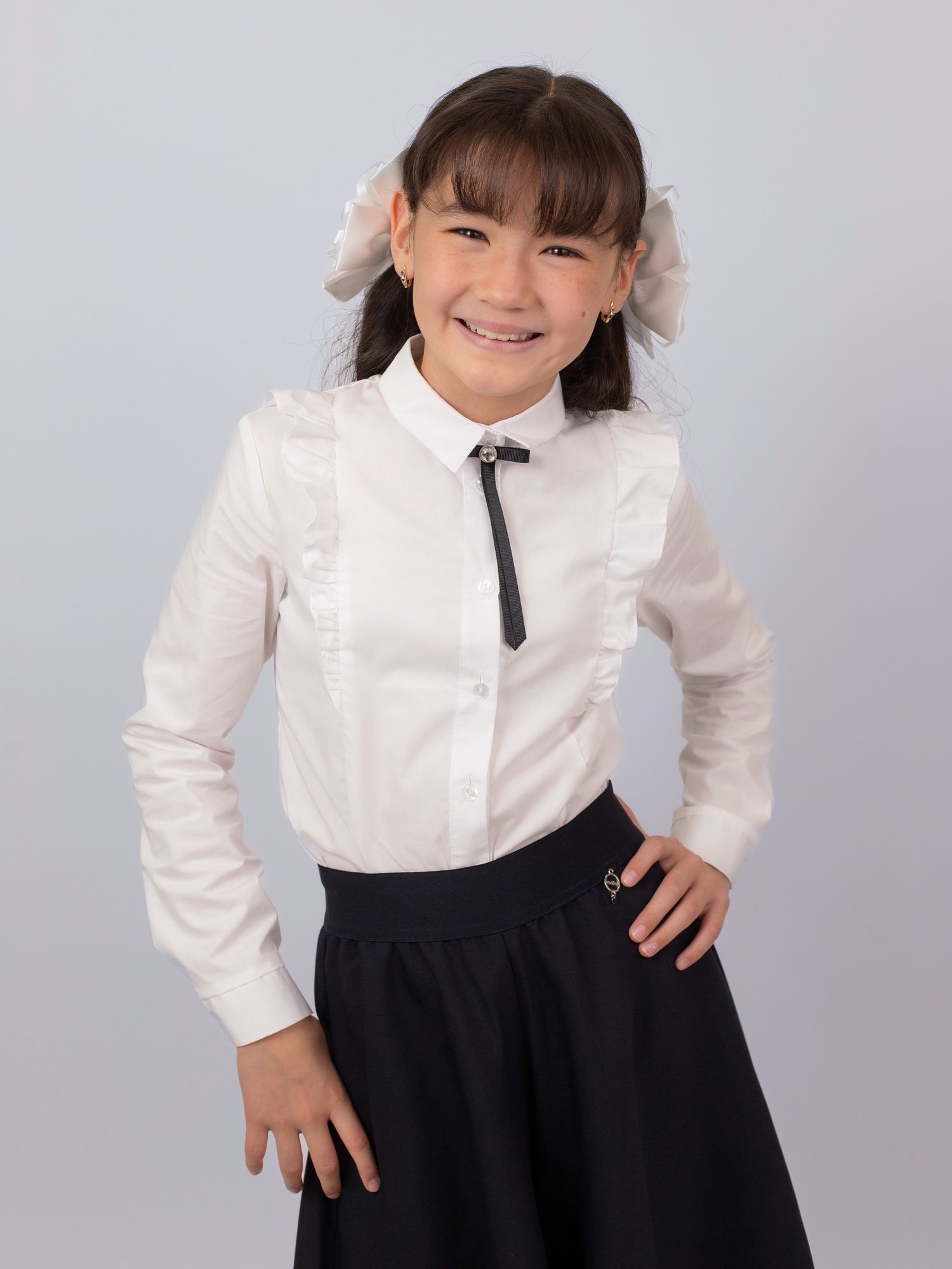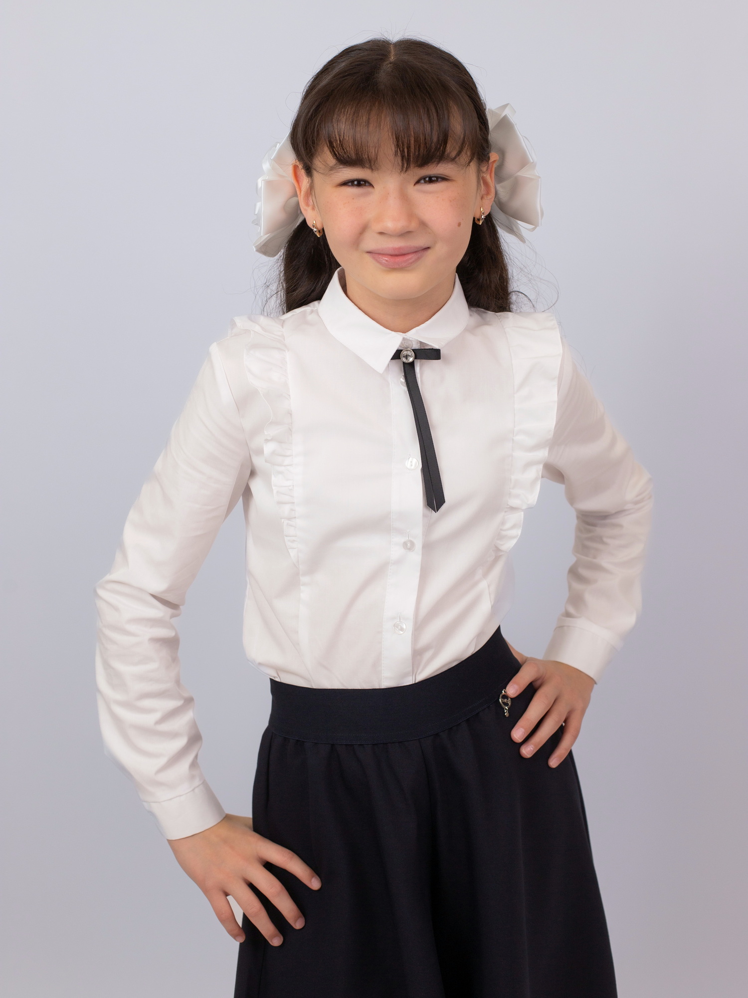 Элегантная и комфортная школьная блузка для девочки с длинными рукавами — отличный выбор для повседневной носки и торжественных школьных мероприятий. Модель выполнена из приятного к телу материала — хлопка с добавлением полиэстера, что обеспечивает комфорт в течение дня и лёгкость в уходе. Блузка украшена рюшами на груди и дополнена съёмной брошкой в виде аккуратной ленты, которая подчёркивает нарядный и утончённый образ. Идеально сочетается с классической школьной формой.