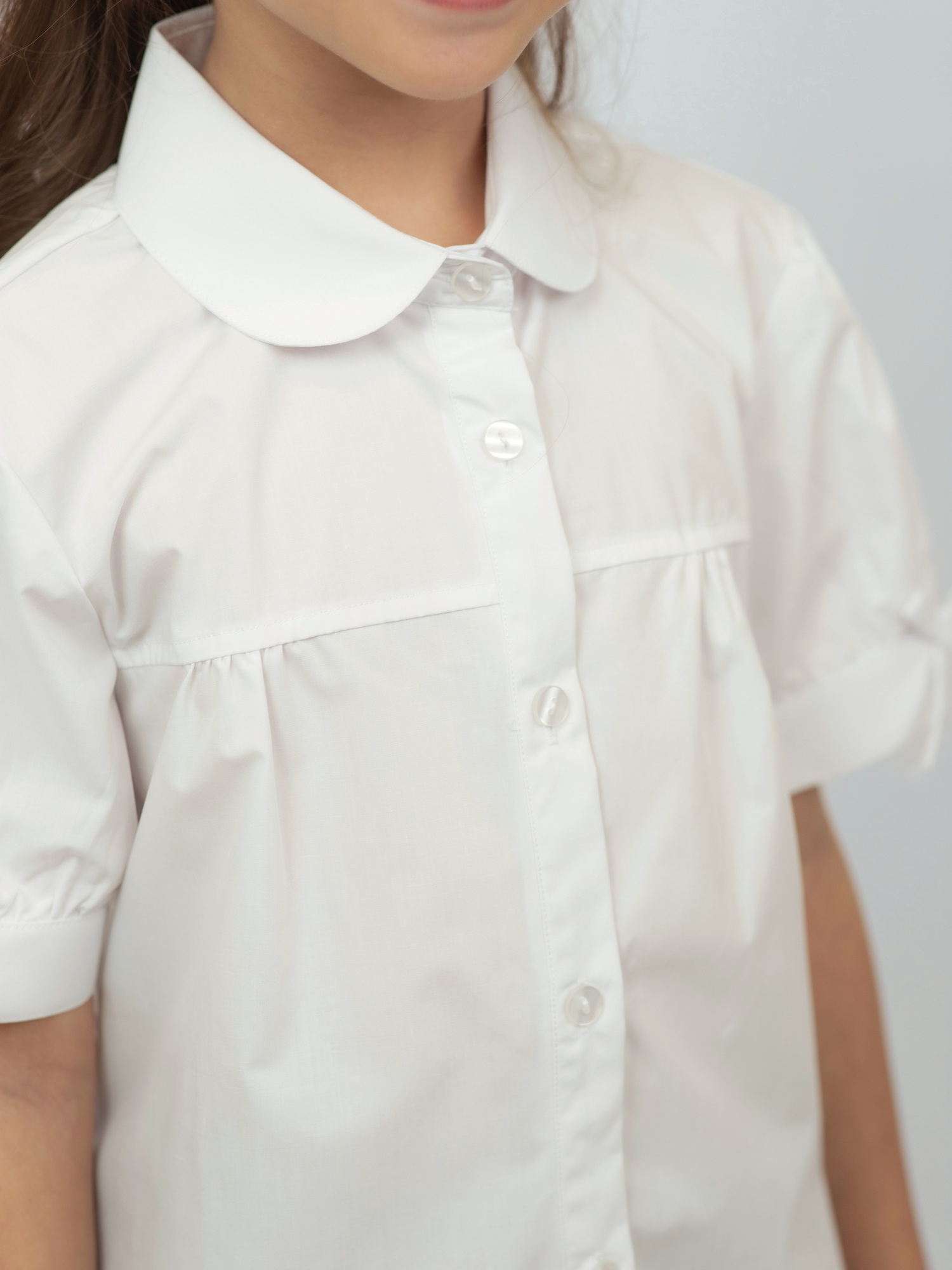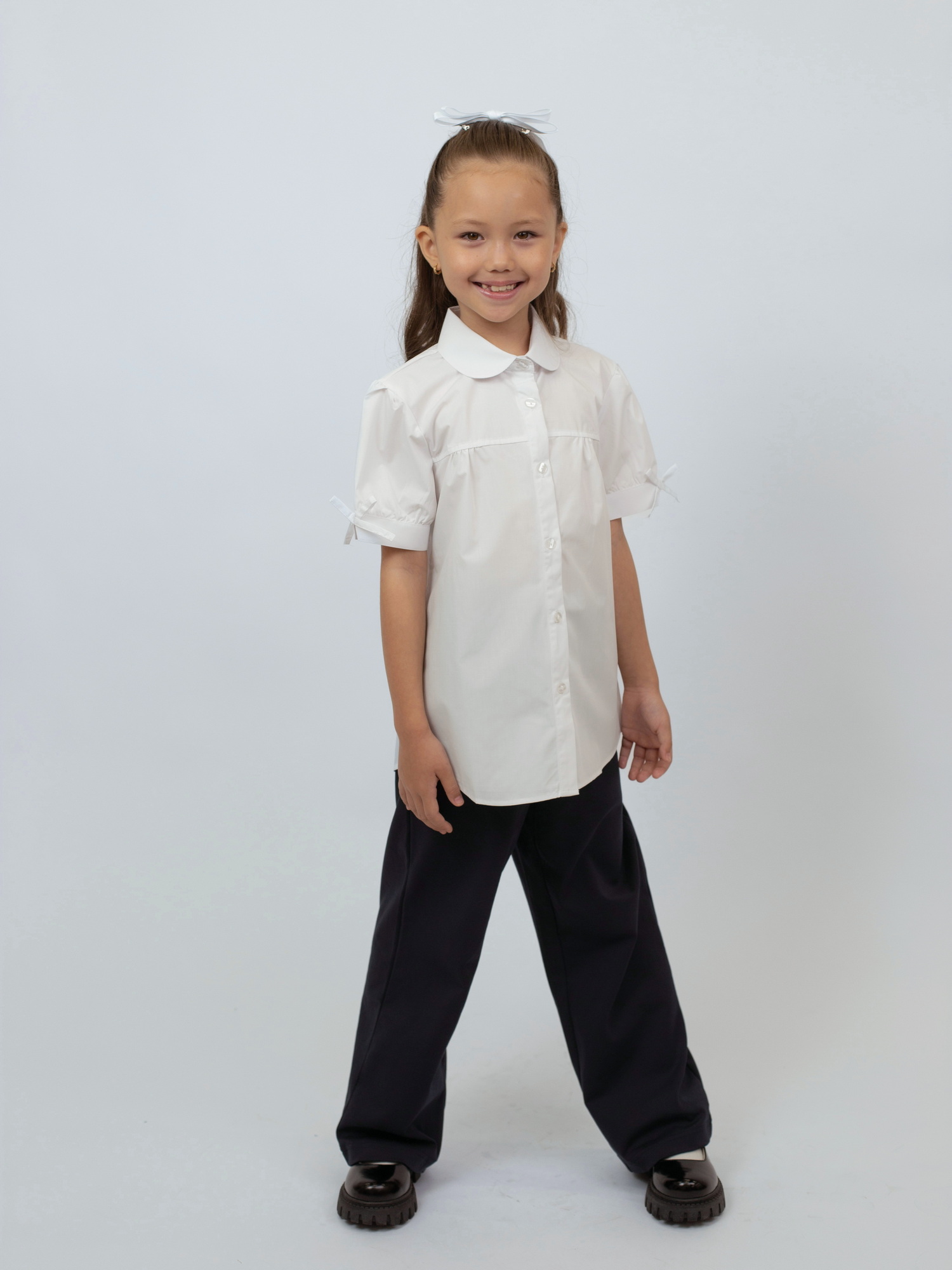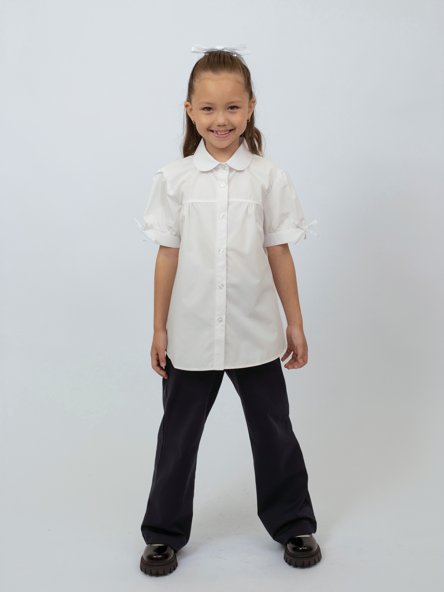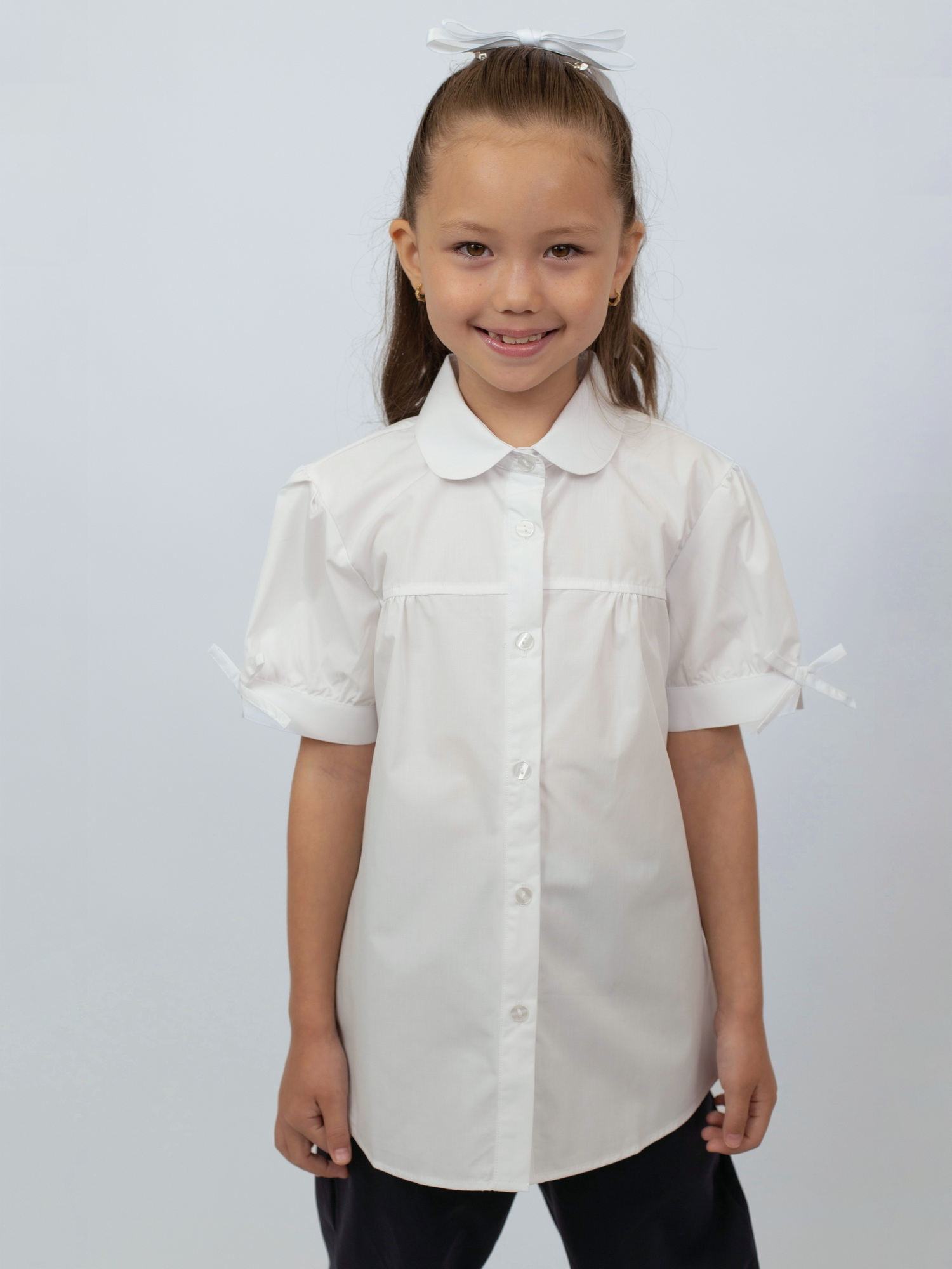 Блузка с коротким рукавом для девочки — лёгкая и нарядная модель, идеально подходящая для школьных будней и торжественных мероприятий. Выполнена из мягкого и дышащего хлопка, она обеспечивает комфорт даже в тёплую погоду.