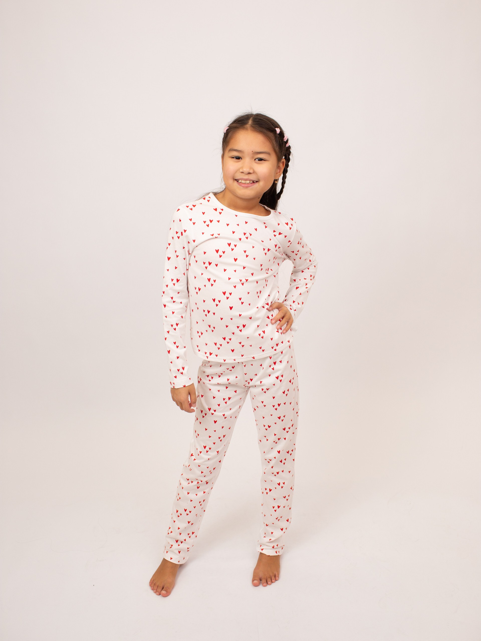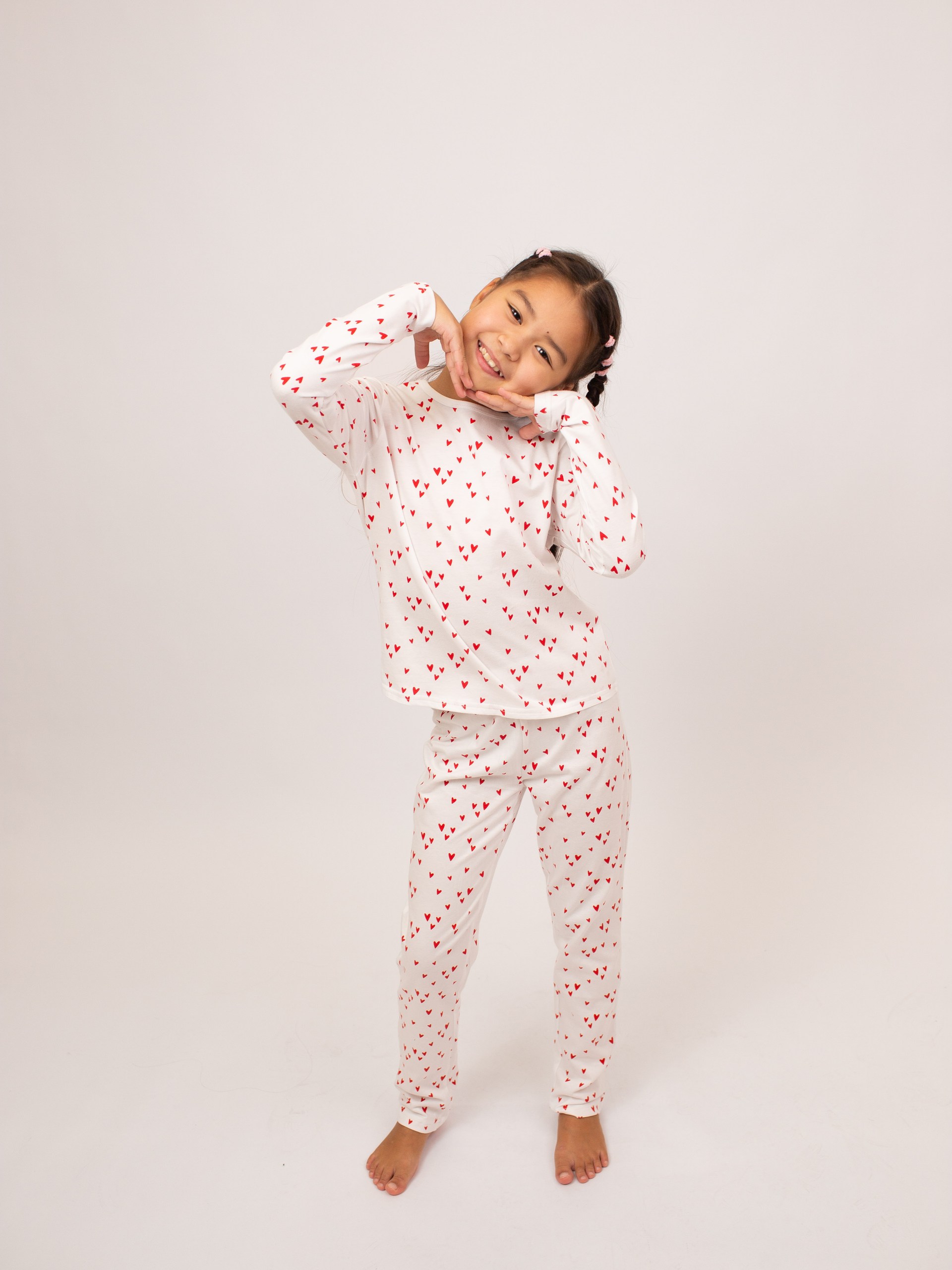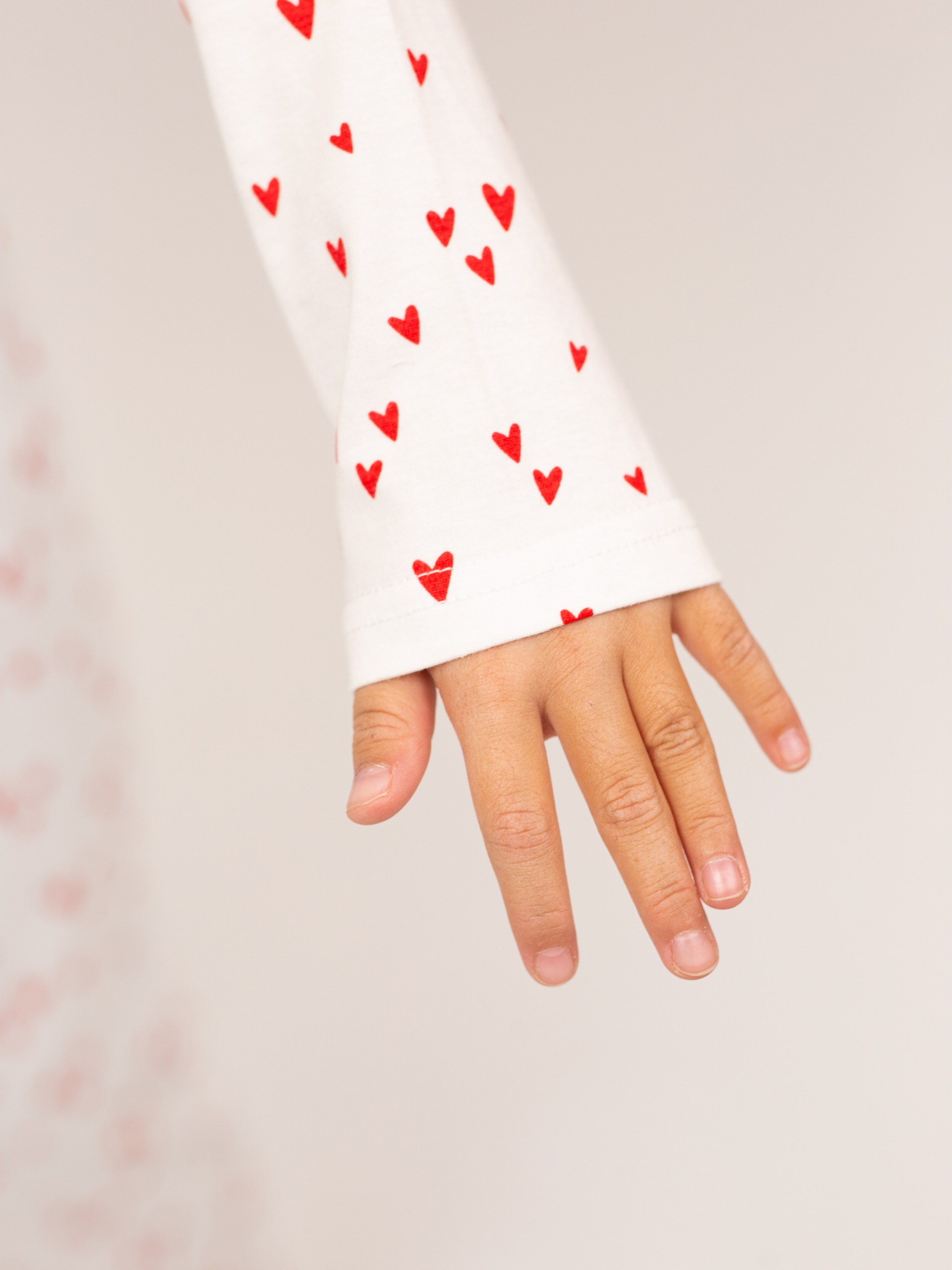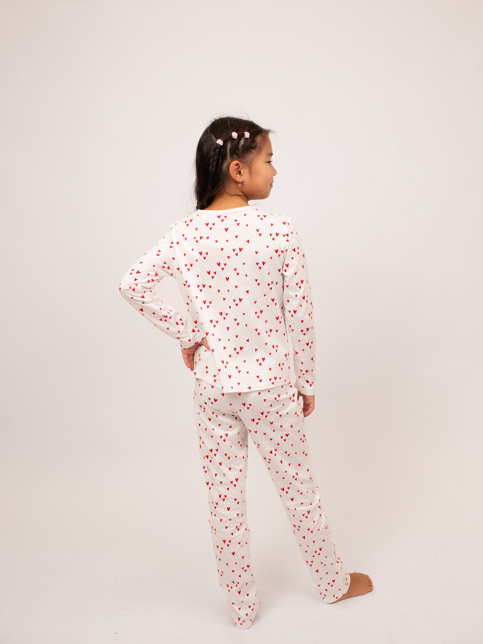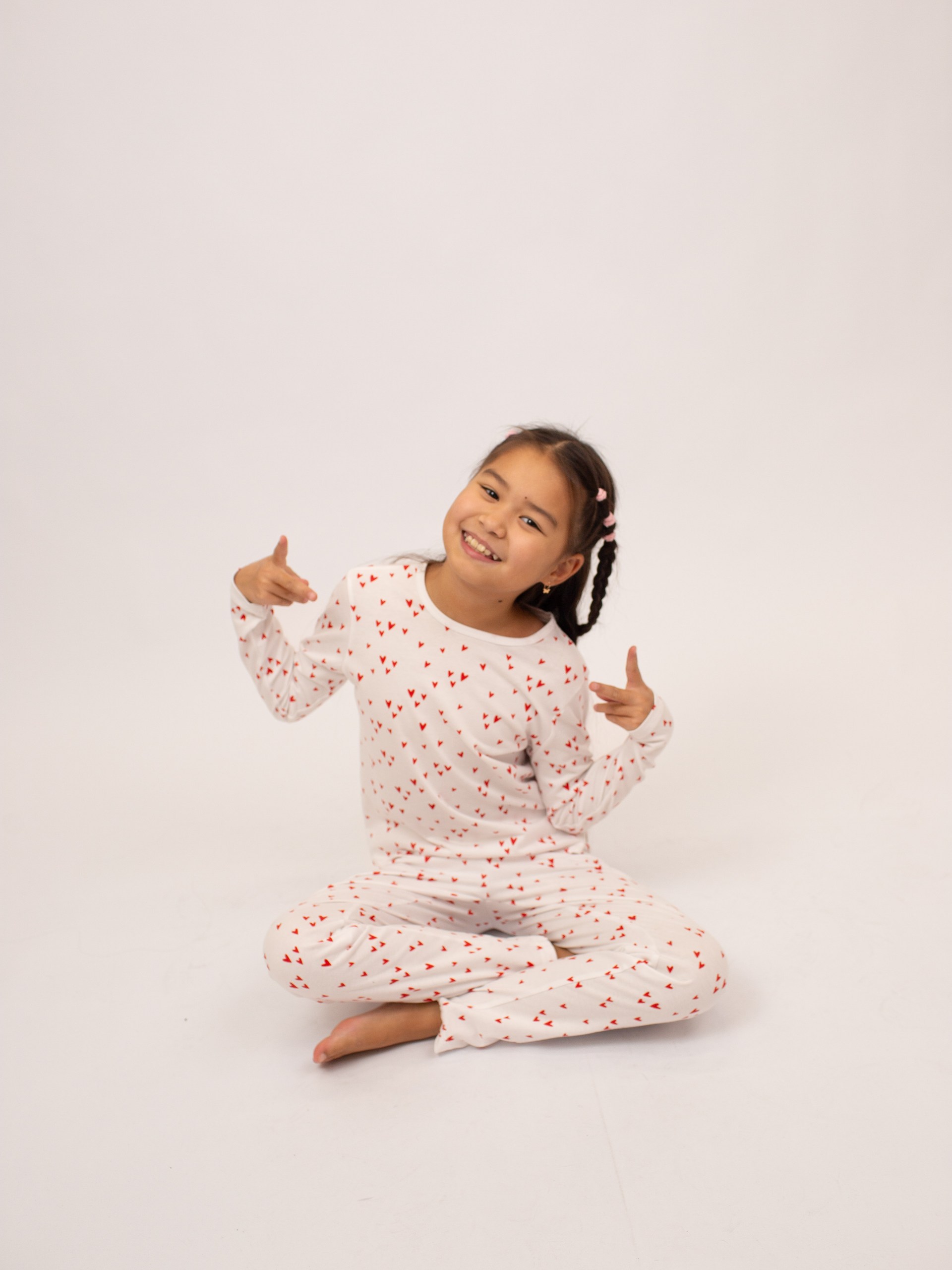 Очаровательная детская пижама с принтом в виде маленьких красных сердечек создана для сладких снов и уютных вечеров. Комплект включает лонгслив с длинными рукавами и брюки прямого кроя на мягкой резинке. Изготовлена из нежного и дышащего хлопка, приятного к телу и безопасного для детской кожи. Пижама обеспечивает комфорт, не сковывает движений и идеально подходит как для сна, так и для домашнего отдыха.