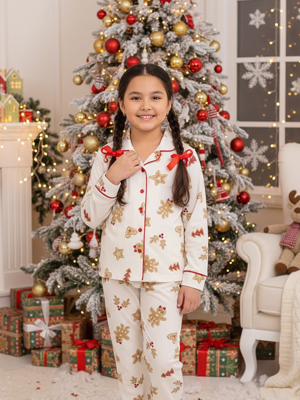 Пижама для девочки с длинным рукавом из мягкого 100% хлопка — идеальный выбор для уютных зимних вечеров. Украшена ярким новогодним принтом по всей поверхности, создающим праздничное настроение. Верх на пуговицах с классическим отложным воротником, низ на мягкой резинке — для максимального комфорта во сне и дома.