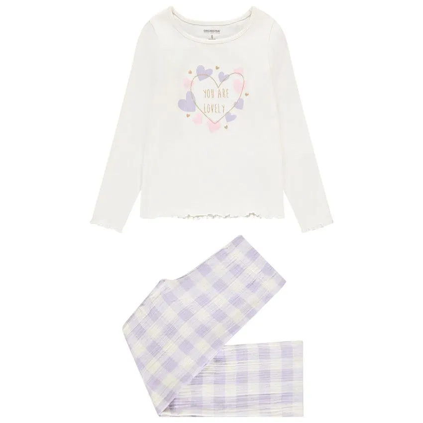 Пижама для девочек из мягкого трикотажа: лонгслив с центральным принтом, украшенным пайетками, и брюки на завязке. Верх: 95% хлопок, 5% эластан. Низ: 100% хлопок. Материал дышащий и приятный к телу, не сковывает движений и хорошо переносит стирки. Подходит для сна и домашнего отдыха.