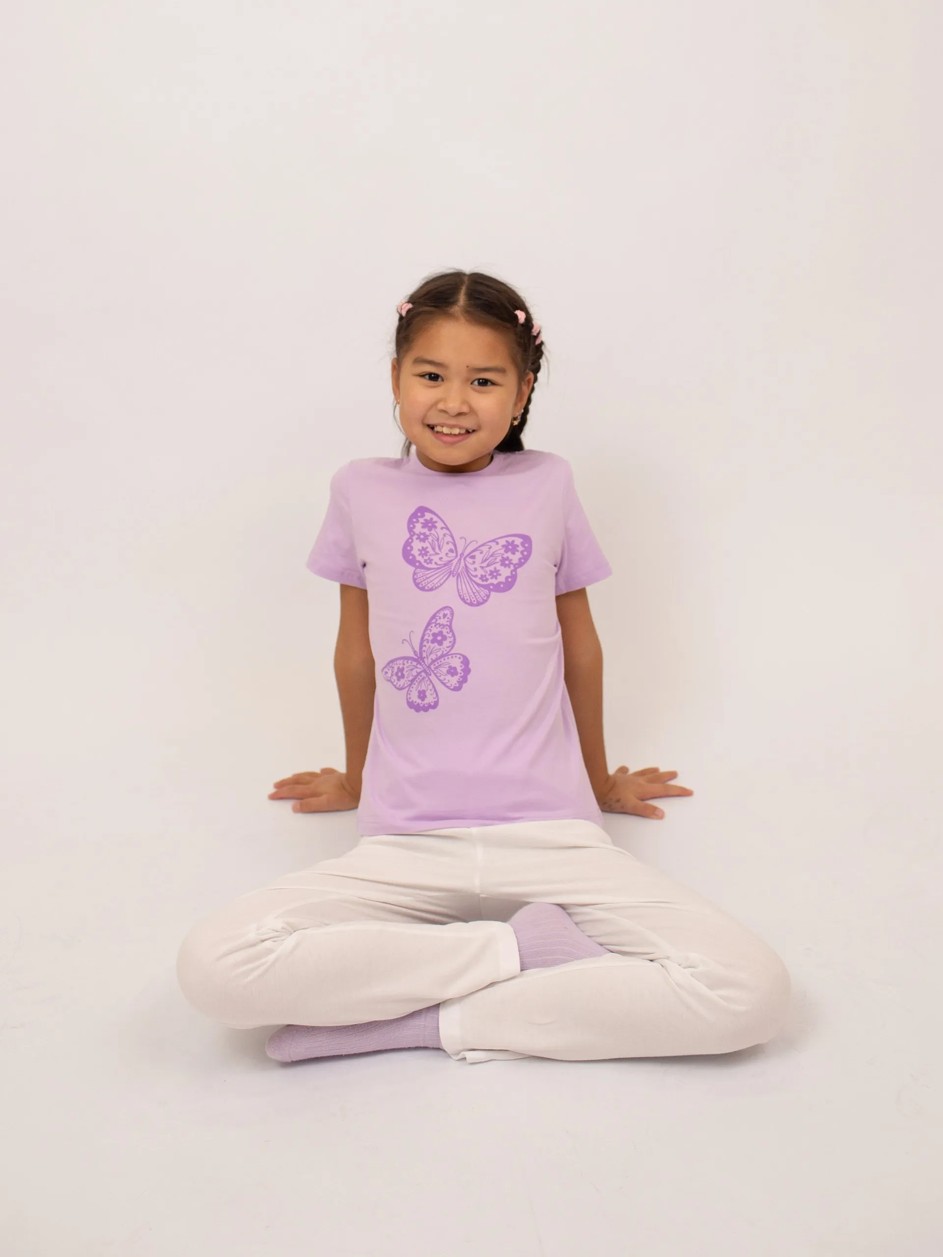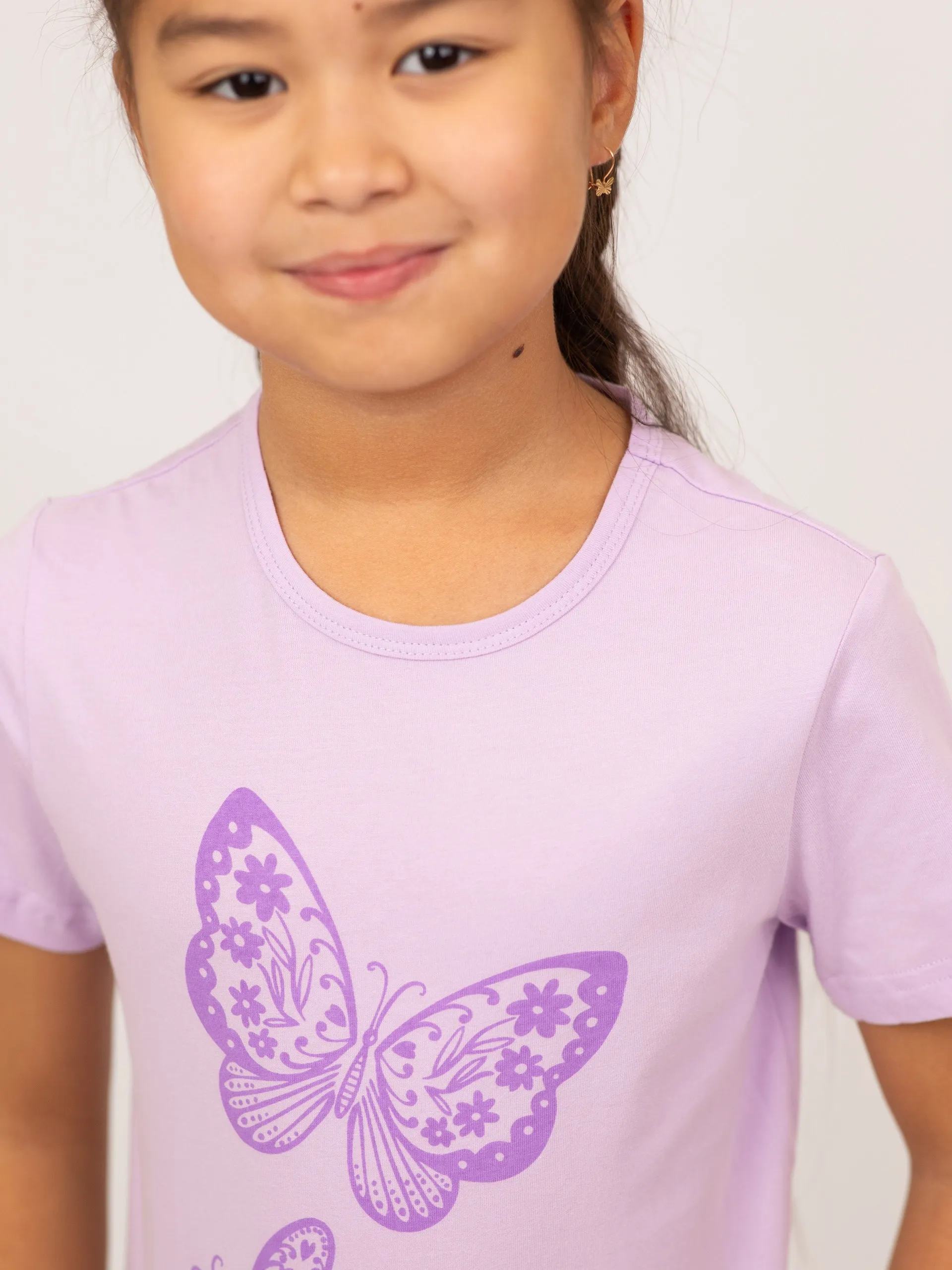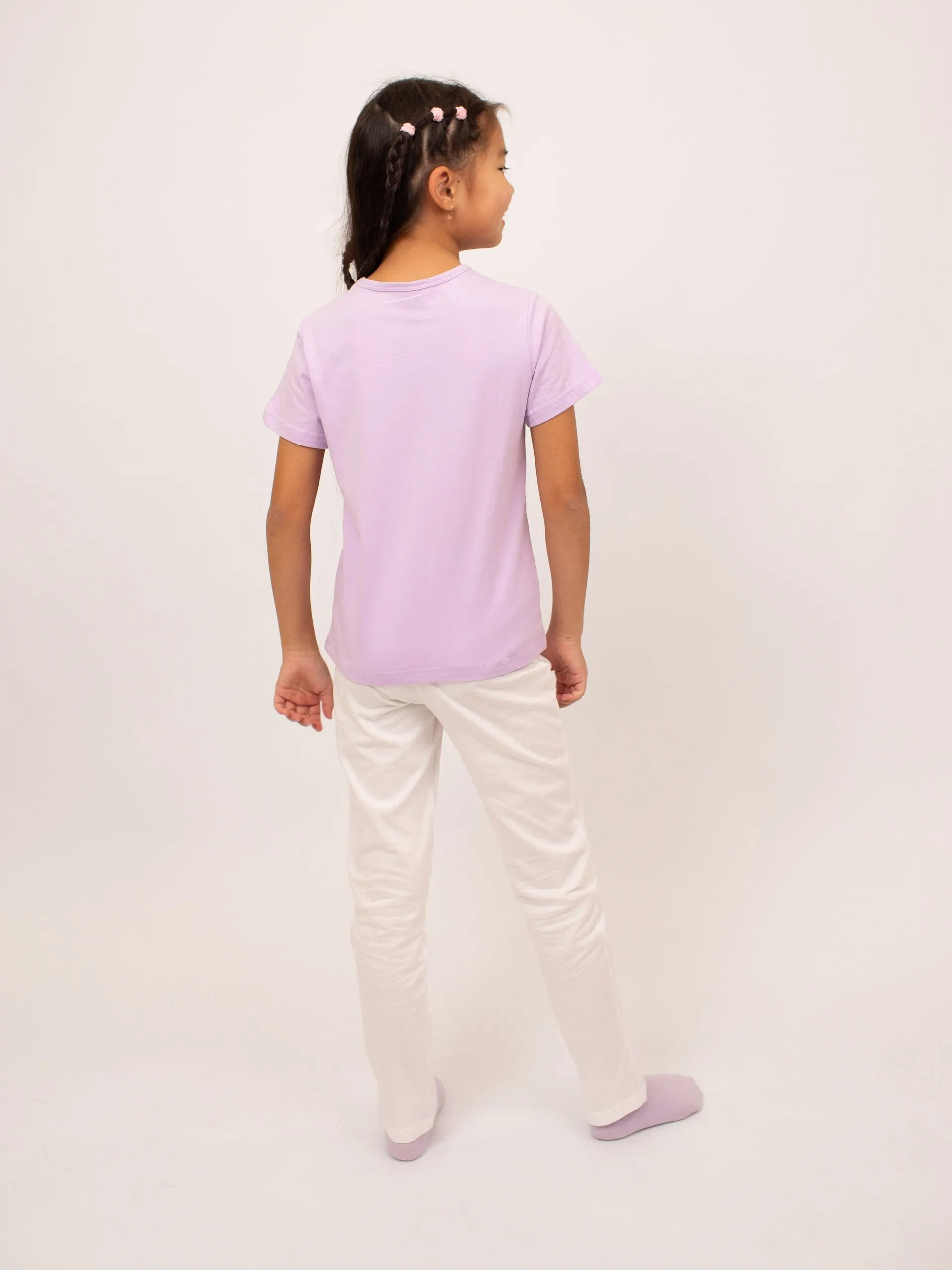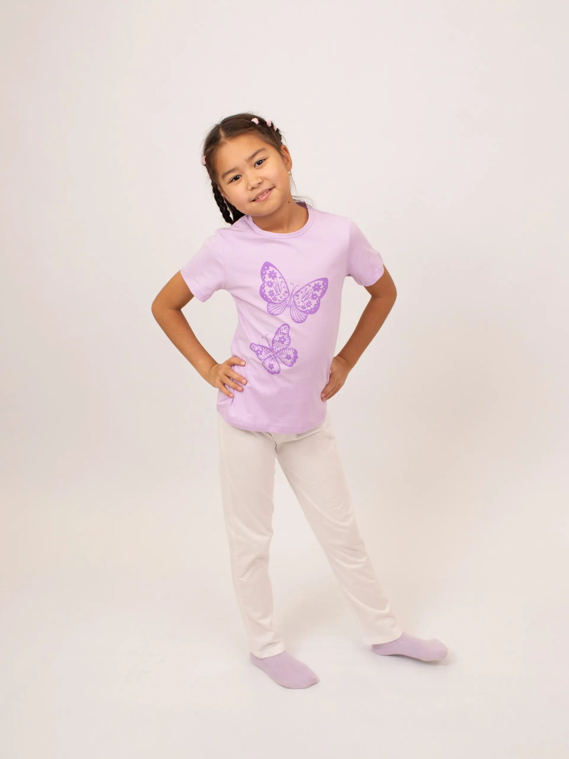Детская пижама из мягкого хлопка подарит комфорт и уют во время сна. Комплект состоит из футболки с коротким рукавом и брюк прямого кроя. Футболка украшена нежным принтом с бабочками, создающим лёгкое и радостное настроение. Брюки на мягком эластичном поясе обеспечивают удобную посадку и свободу движений. Дышащая ткань приятна к телу и идеально подходит для сна и домашнего отдыха.
