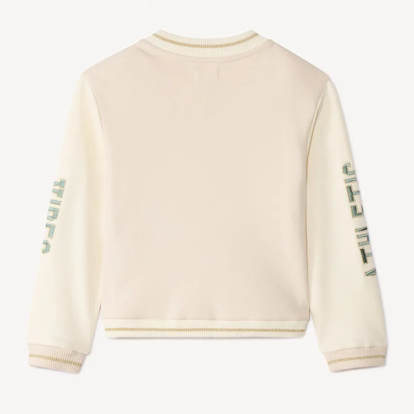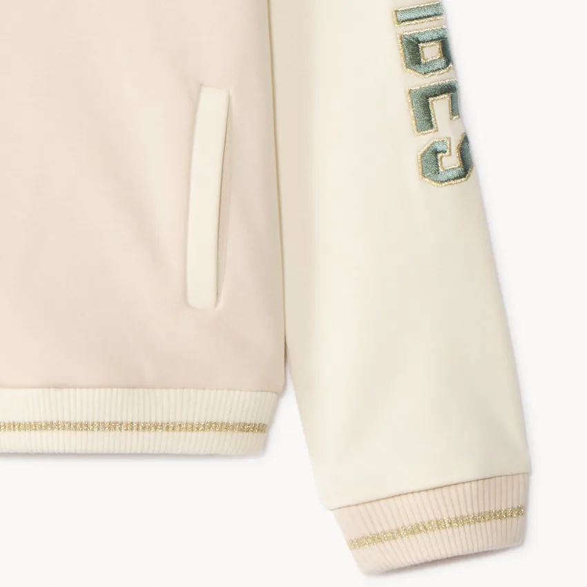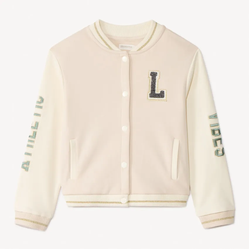 Бомбер из мягкого флиса sherpa в бежевом цвете — уютная и стильная модель для прохладных дней. Воротник из «тедди» оформлен золотистым люрекс-кантом, который повторяется на манжетах, поясе и декоративных отделках, добавляя наряду лёгкое сияние. Рукава украшены контрастной зелёной вышивкой и буквами, а на груди расположен вышитый патч с буквой L. Спереди — удобная застёжка на кнопки и два прорезных кармана. Спинка остаётся лаконичной и однотонной, сохраняя аккуратный силуэт.
