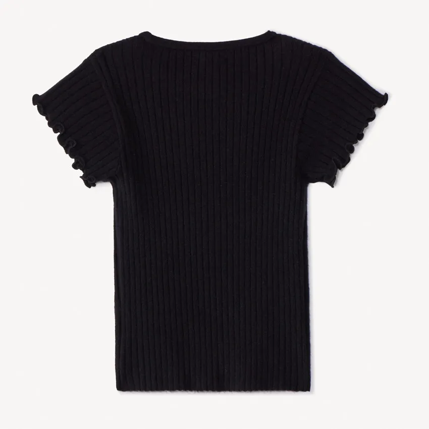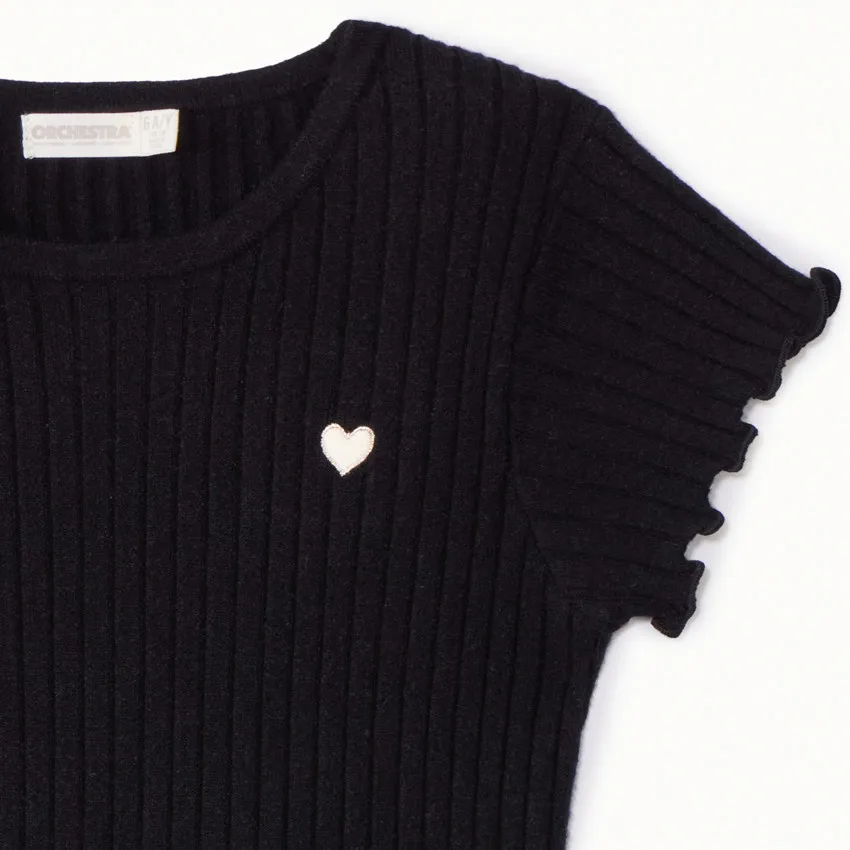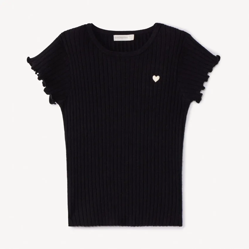 Мягкий и эластичный джемпер из рубчатого трикотажа — идеальный базовый элемент летнего гардероба. Модель с короткими рукавами и круглым вырезом горловины. Низ и рукава украшены волнистой отделкой бурдонным швом, придающей образу нежность и игривость. Изюминка дизайна — вышивка в виде сердца золотым люрексом сбоку. Состав: 95% хлопок, 5% эластан — мягко тянется и хорошо садится по фигуре.