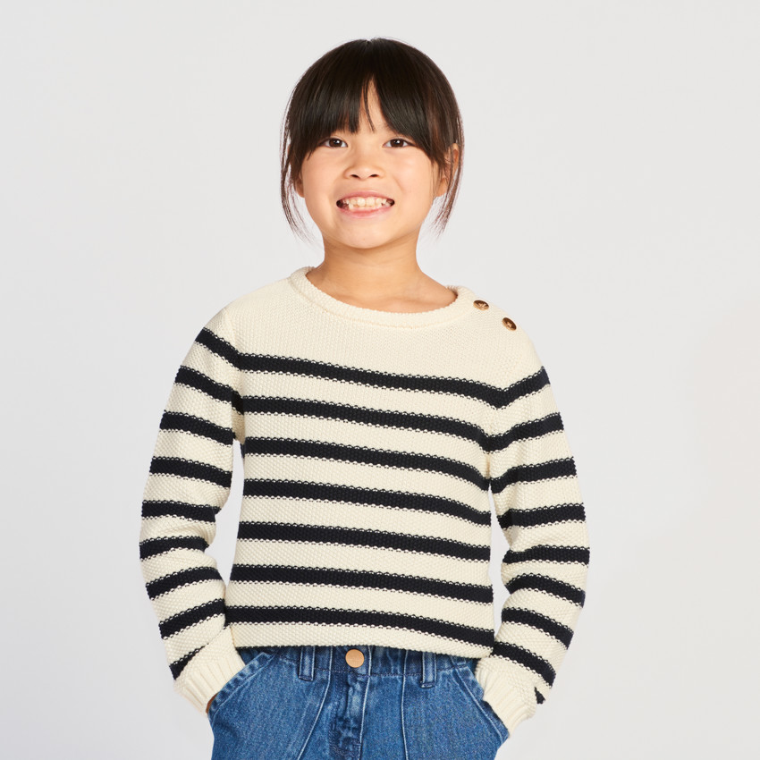 Джемпер с длинными рукавами из трикотажа. Выполнен в цвете экрю с чёрными полосками по всей поверхности. Круглый вырез горловины, на плече декоративные пуговицы под рог. Манжеты связаны резинкой для удобной посадки.