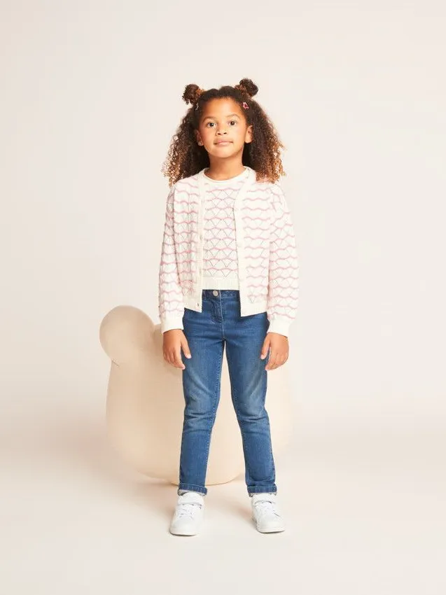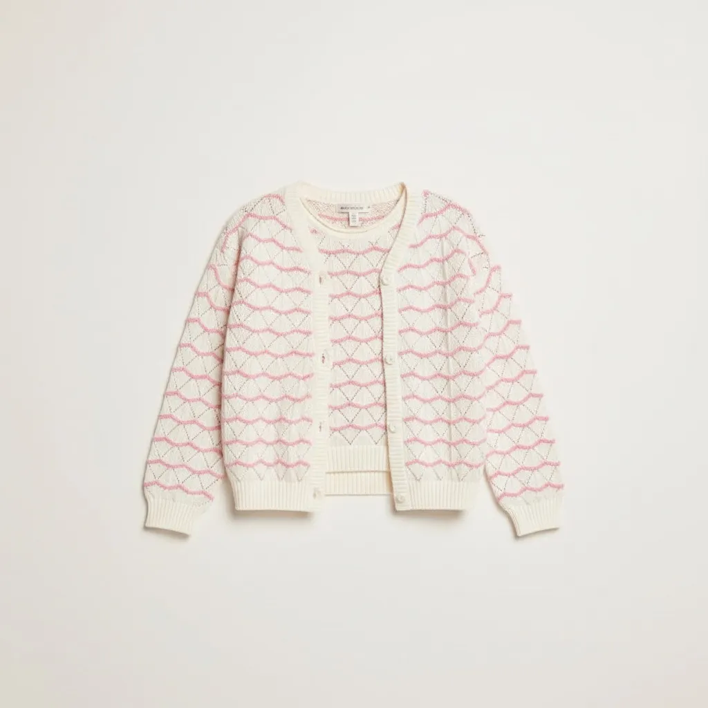 Ребристая текстура ткани и принт в виде зигзага по всей поверхности придают комплекту модный и выразительный вид. Кардиган застёгивается на пуговицы, что делает его удобным и практичным, а топ отлично дополняет образ. Комплект легко сочетается с джинсами, юбками и шортами, подойдёт для прогулок и повседневной носки.