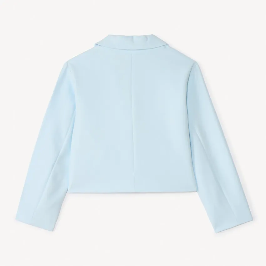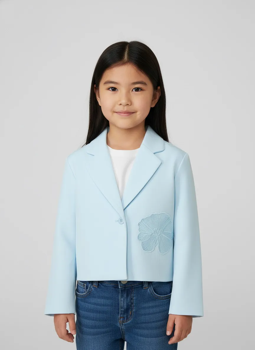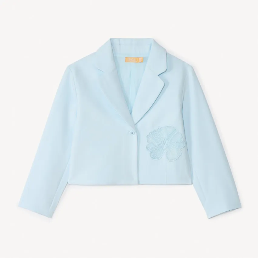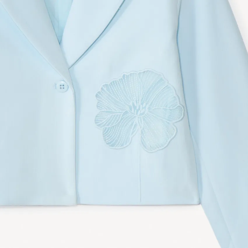 Пиджак с классическим воротником с лацканами и застежкой на пуговицы выглядит элегантно и аккуратно. Вышитая цветочная нашивка с левой стороны добавляет нежности и делает модель более выразительной.