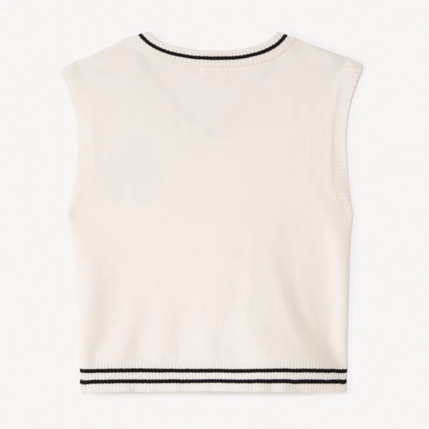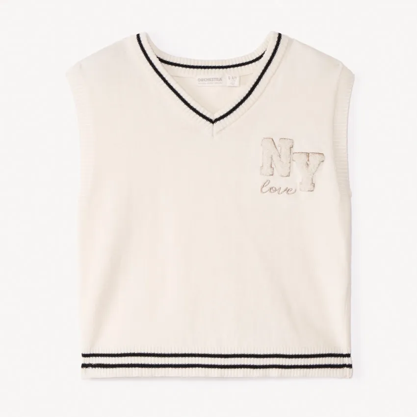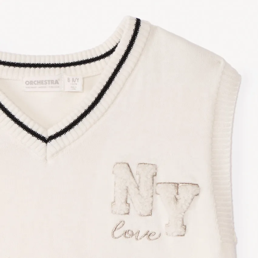 Жилет без рукавов из трикотажа цвета экрю. Вырез «V» и проймы выполнены в рубчик с контрастной отделкой тёмно-синего цвета. Спереди на груди вышитый патч «NY» с объёмным эффектом и золотистой отделкой. Нижний край в рубчик с двойными контрастными полосами тёмно-синего цвета. Спинка однотонная.