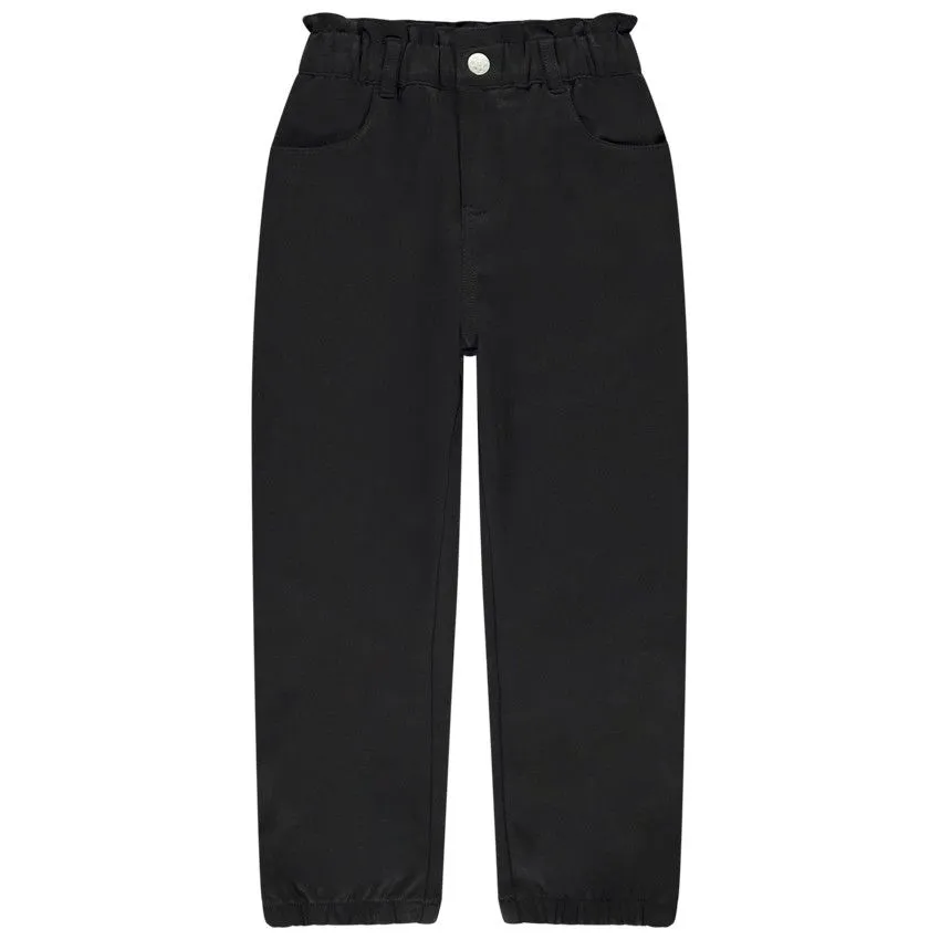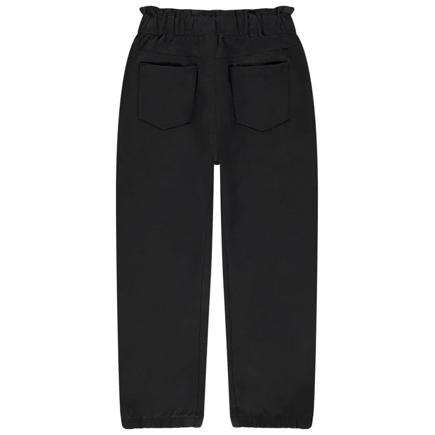 Брюки из плотной ткани черного цвета. Широкий эластичный пояс с воланами, можно отрегулировать внутри. Спереди застёжка на молнию и пуговицу. Есть два боковых кармана и один сзади. Удобные и стильные – подойдут и на каждый день, и на выход.