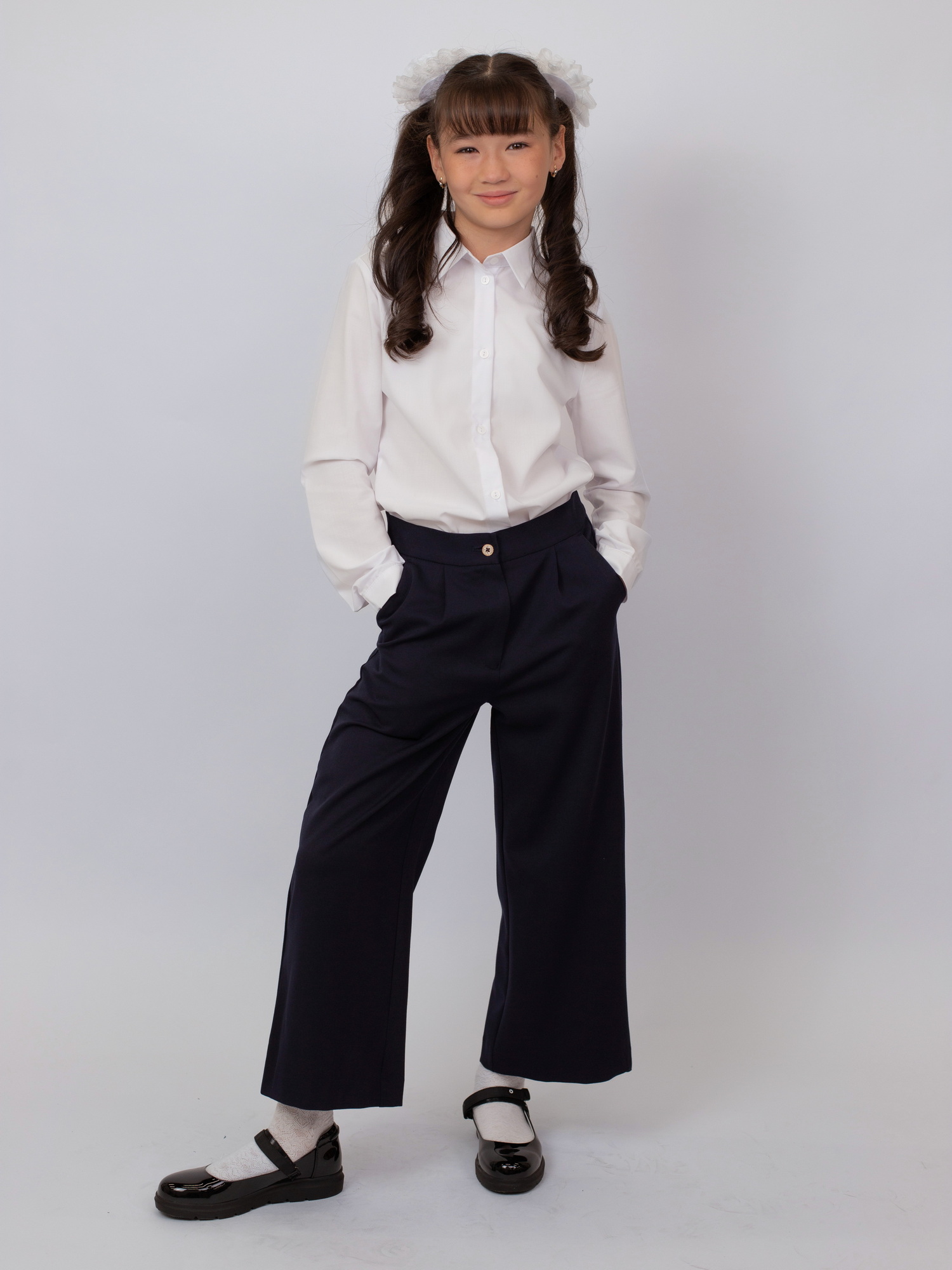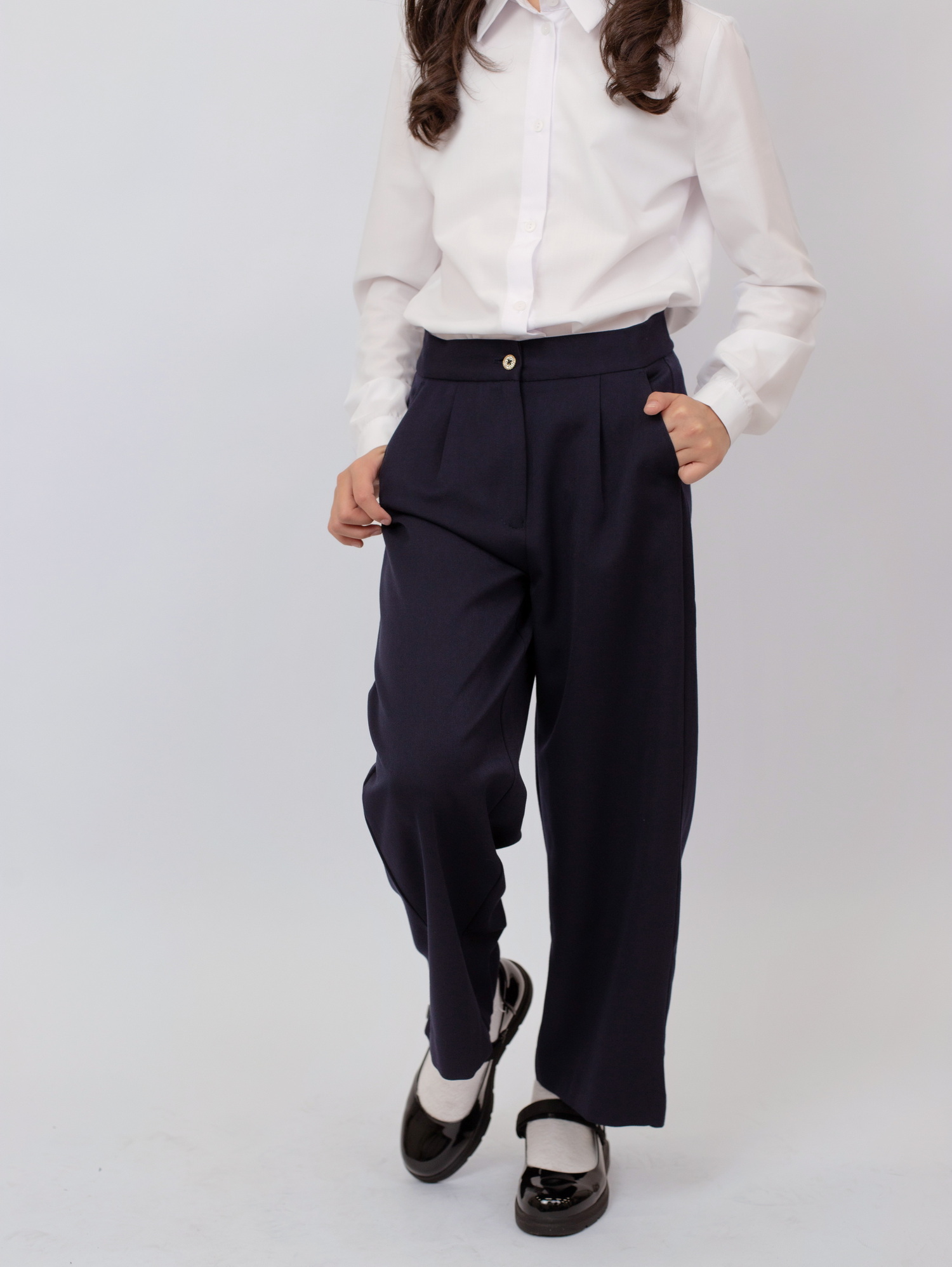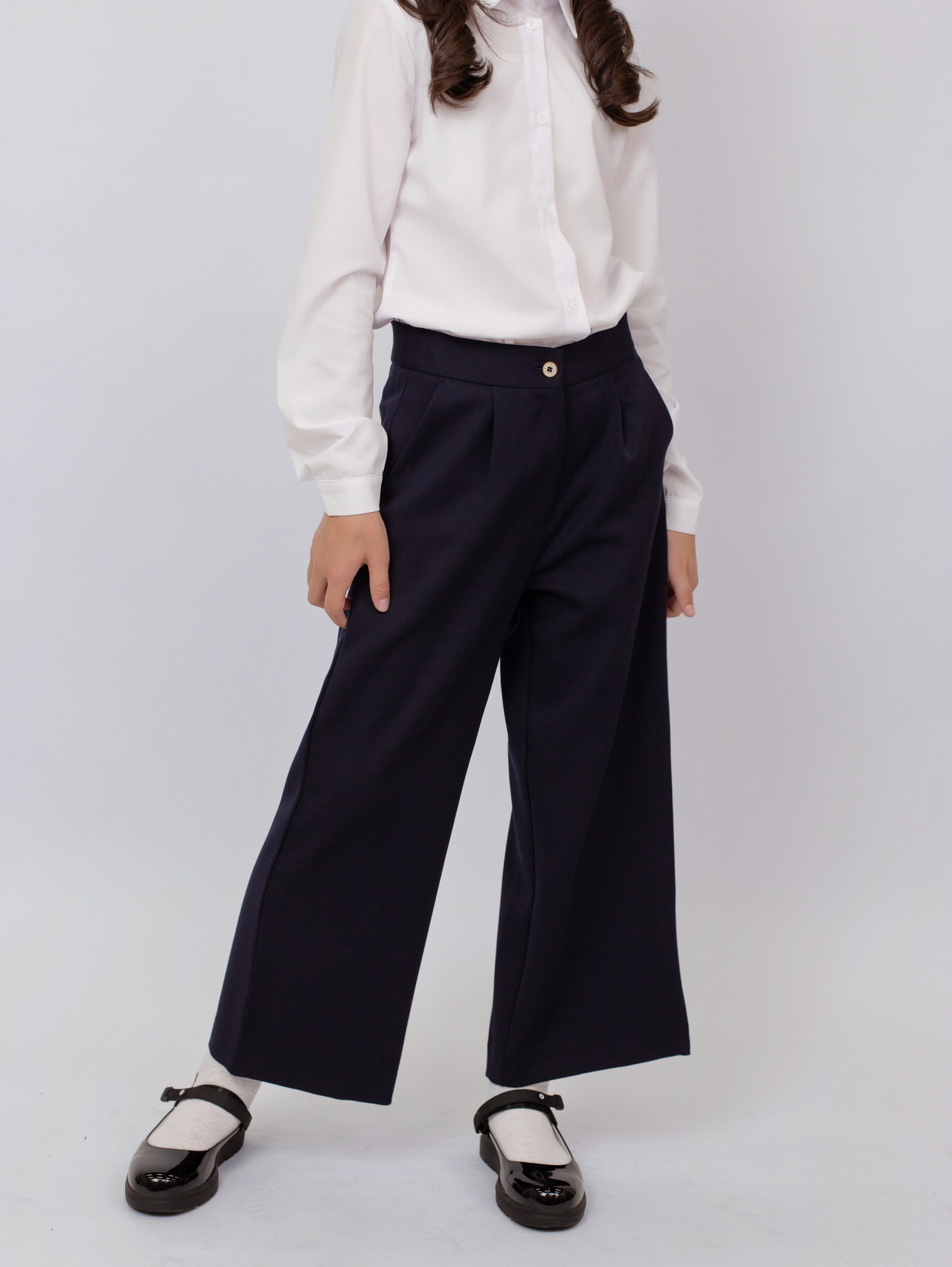 Модель застёгивается на пуговицу и дополнена эластичной резинкой на поясе, что обеспечивает надёжную посадку и удобство при носке. Широкий крой придаёт образу современный вид и позволяет сочетать брюки как с классическими рубашками и блузками, так и с повседневной школьной одеждой.