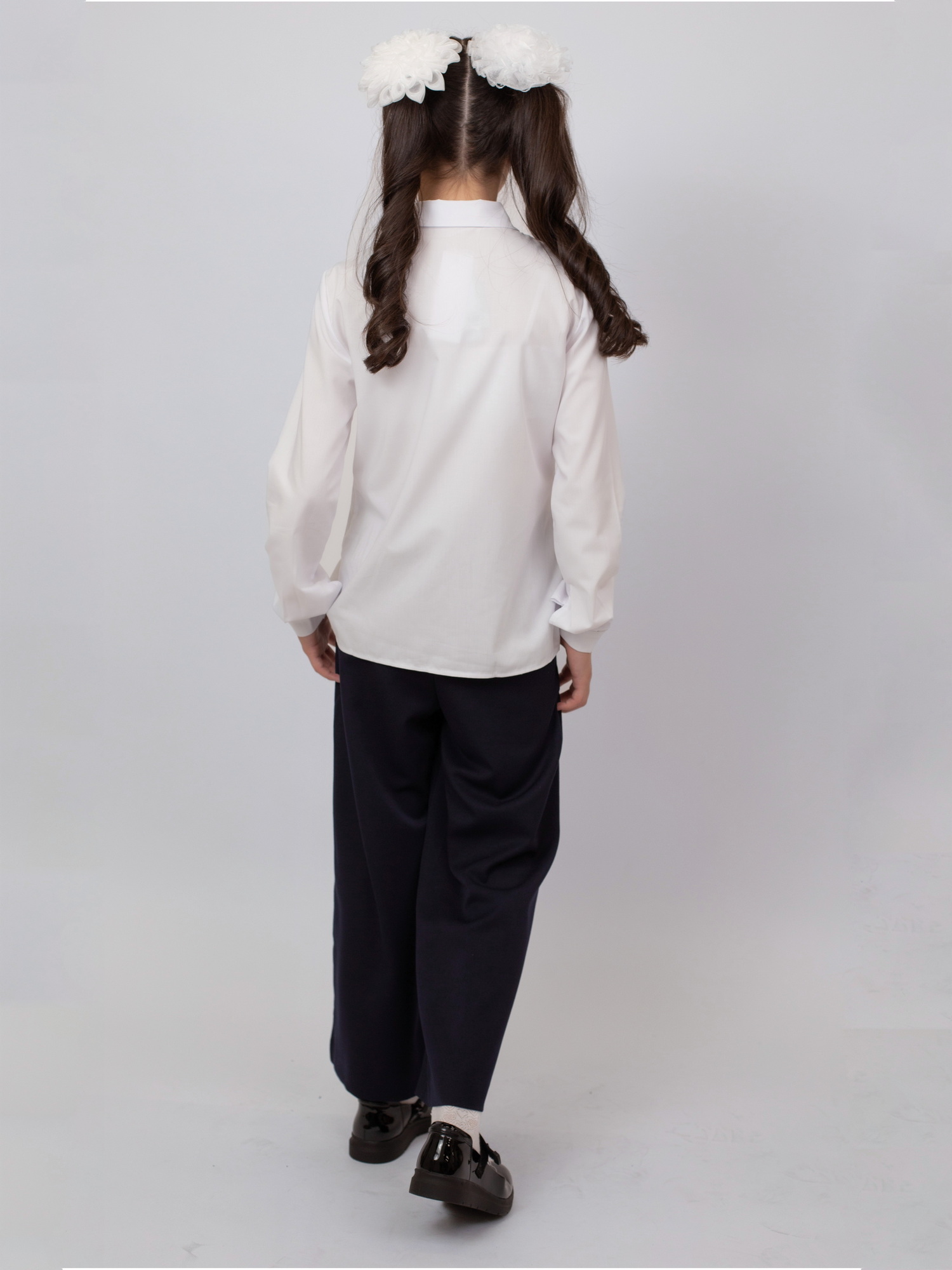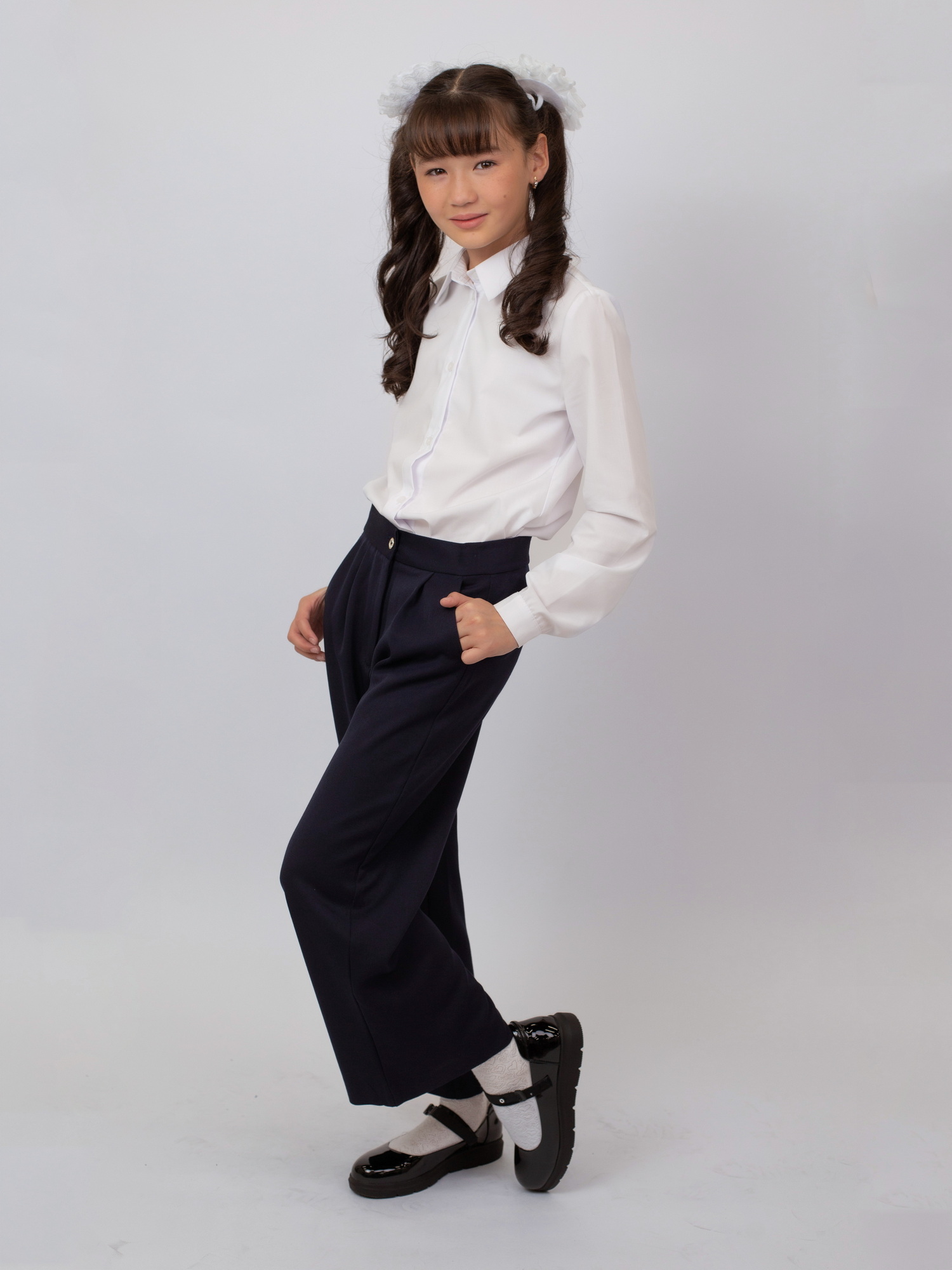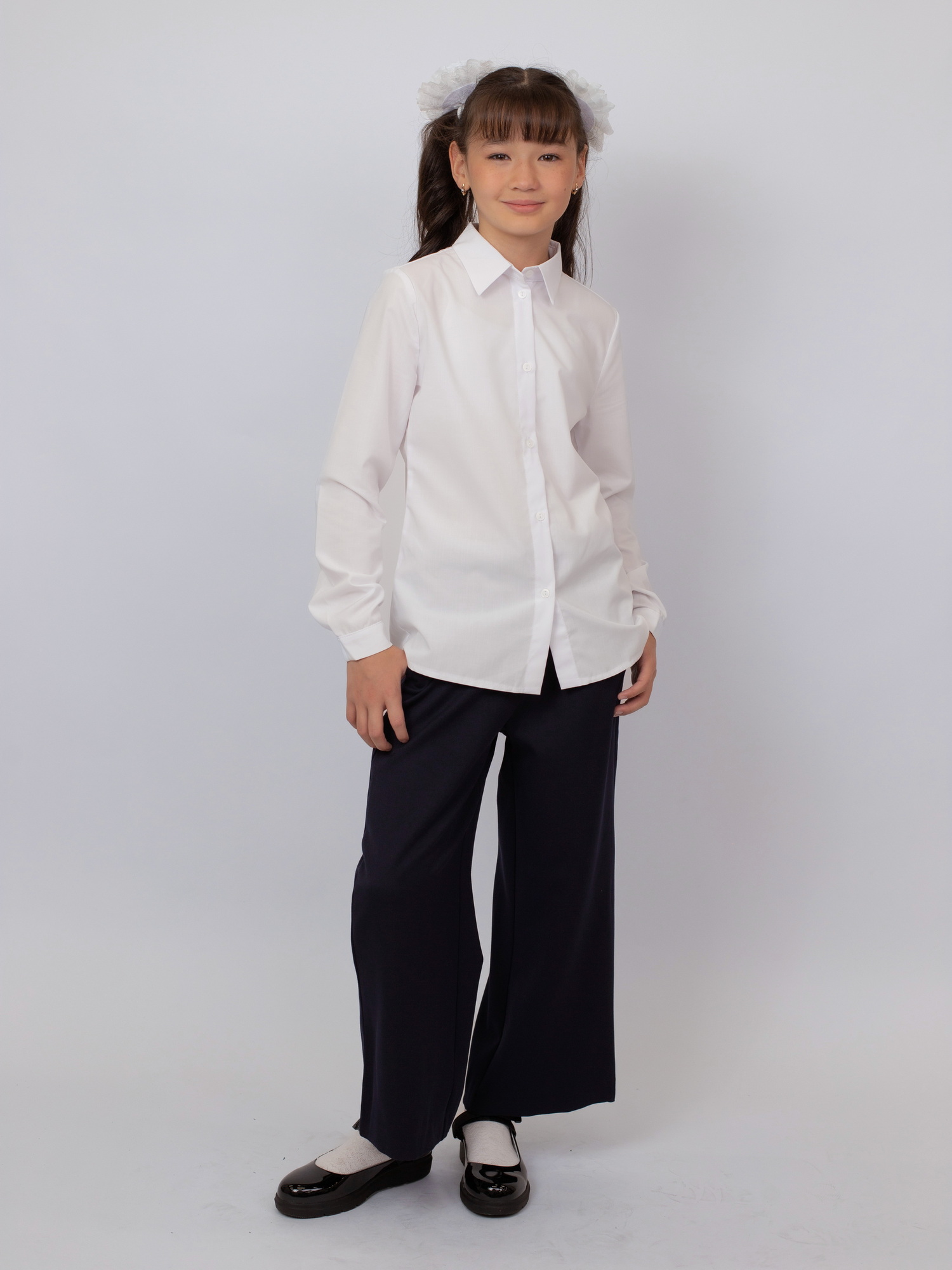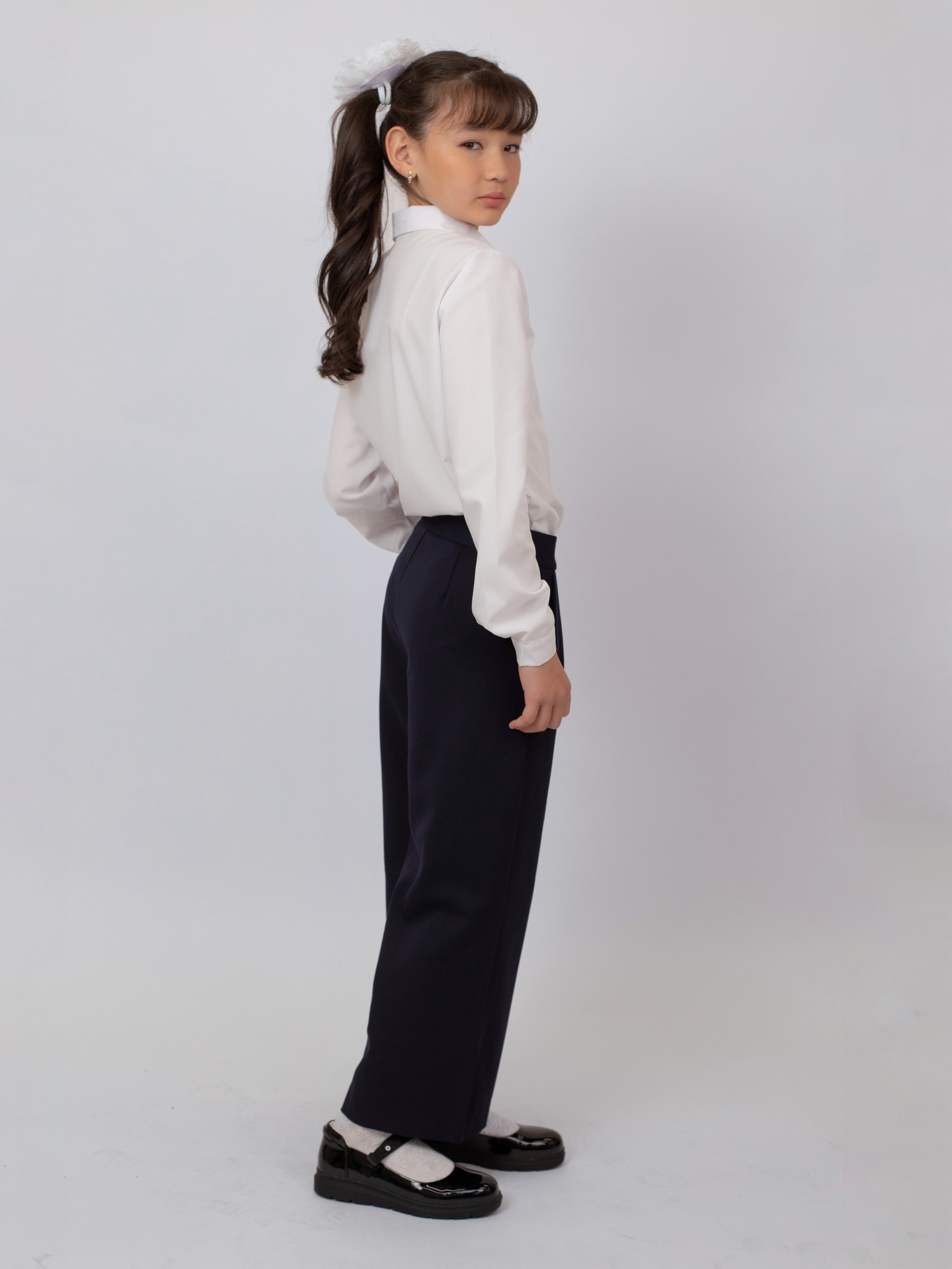 Модель застёгивается на пуговицу и дополнена эластичной резинкой на поясе, что обеспечивает надёжную посадку и удобство при носке. Широкий крой придаёт образу современный вид и позволяет сочетать брюки как с классическими рубашками и блузками, так и с повседневной школьной одеждой.