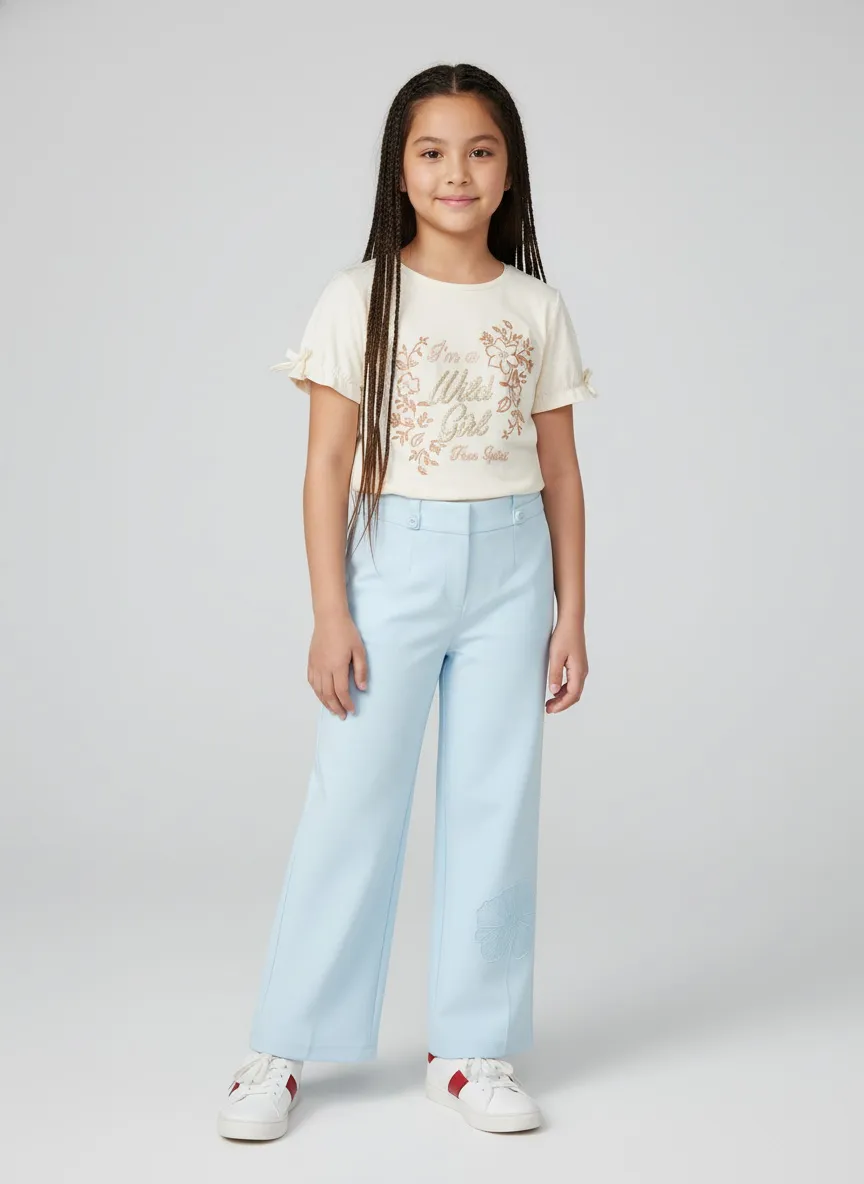 Снизу на левой брючине вышит цветок, который добавляет модели нежный и оригинальный штрих. Ткань с составом 72% полиэстер, 22% вискоза и 6% эластан приятна на ощупь, хорошо держит форму и обеспечивает комфорт в течение дня.