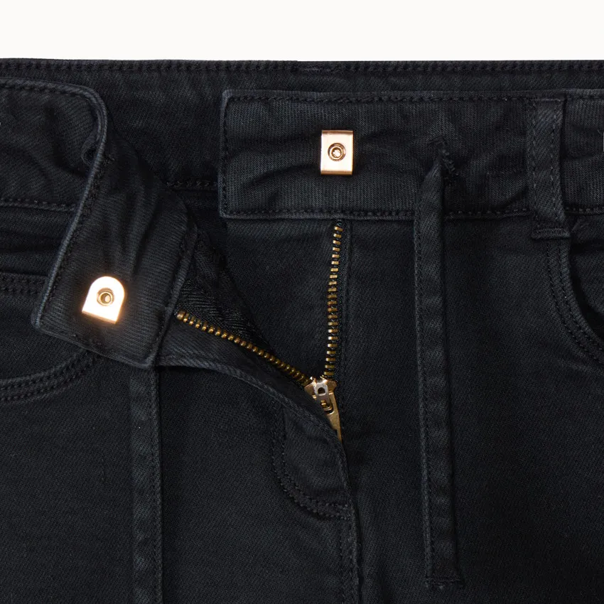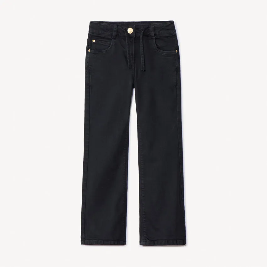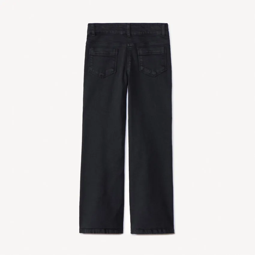 Широкие джинсы из денима однотонного цвета. Пояс регулируется изнутри с помощью эластичных лент и пуговиц. Снаружи — шлёвки для ремня. Спереди застёжка на молнию и крючок, дополнена декоративным шнурком. Два передних кармана с заклёпками, маленький карман для мелочей и два накладных кармана сзади. Удобный и модный вариант на каждый день.