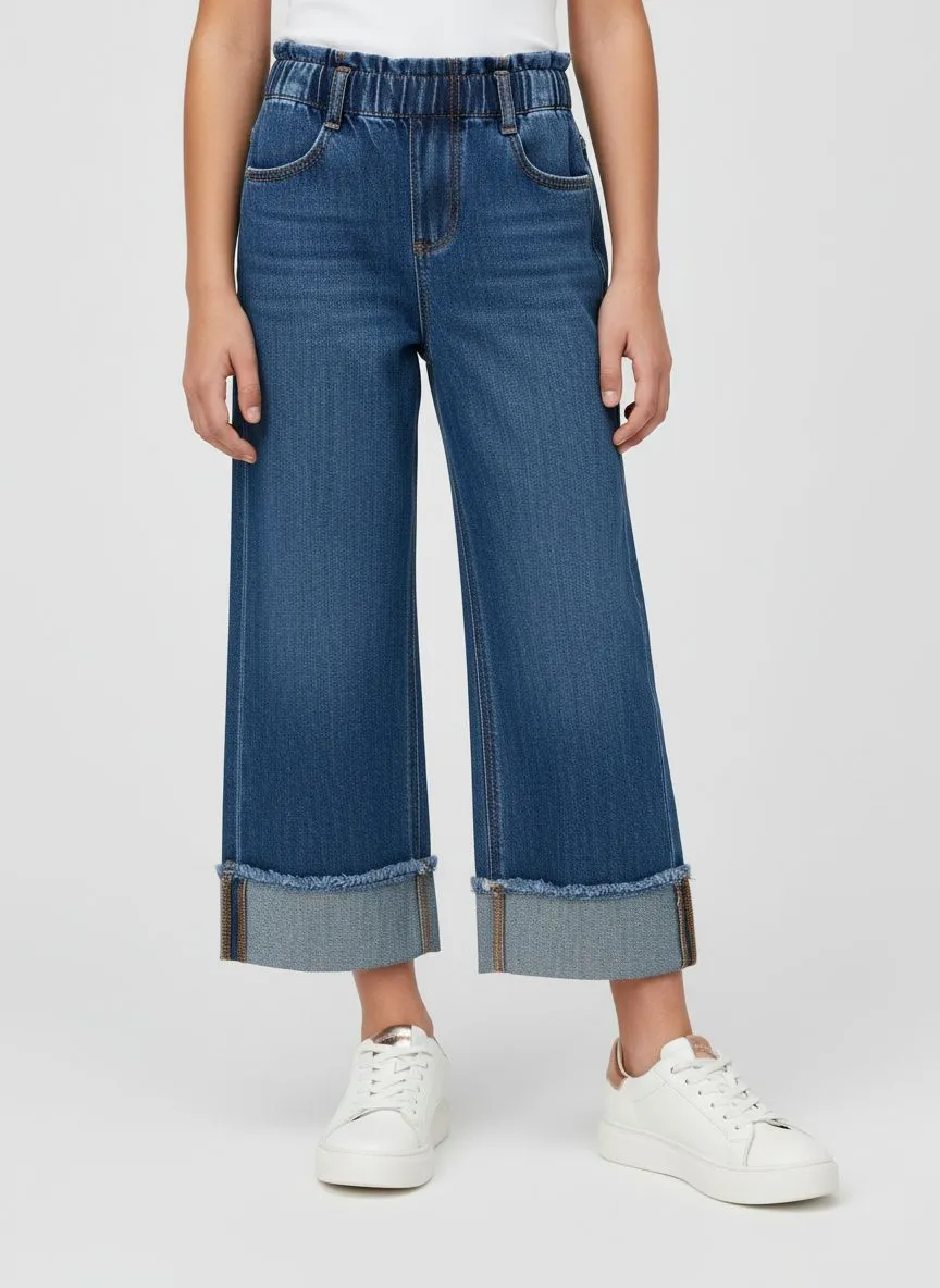 Стильные джинсы для девочек из плотного и мягкого денима — практичный вариант на каждый день. Удобный эластичный пояс обеспечивает комфортную посадку и не сдавливает живот, а прямой крой дарит свободу движений. Классические карманы добавляют функциональности, а аккуратные подвороты с эффектом необработанного края подчёркивают модный образ. Джинсы легко сочетаются с футболками, рубашками и свитшотами и подойдут для прогулок,  и повседневных образов.
