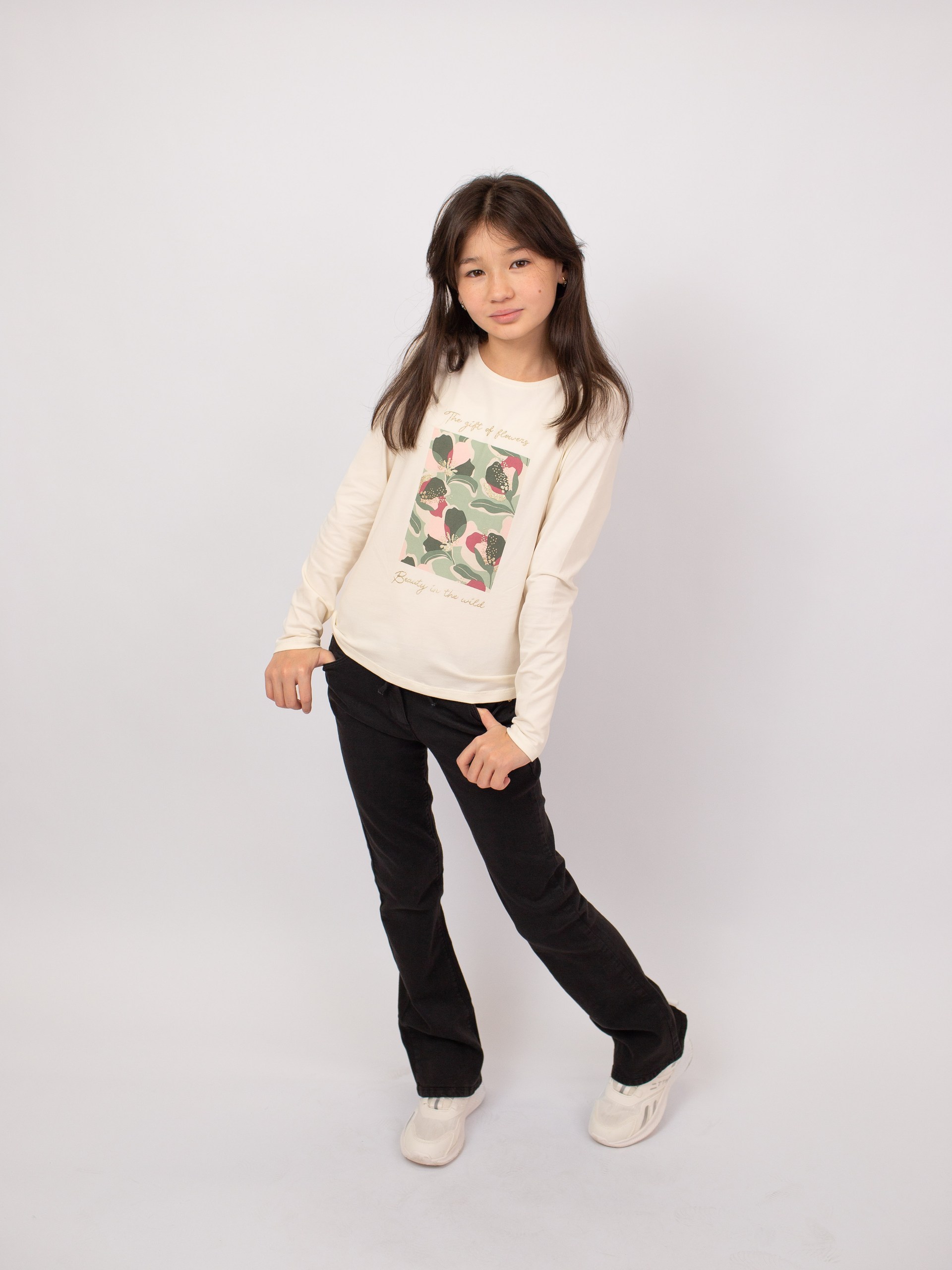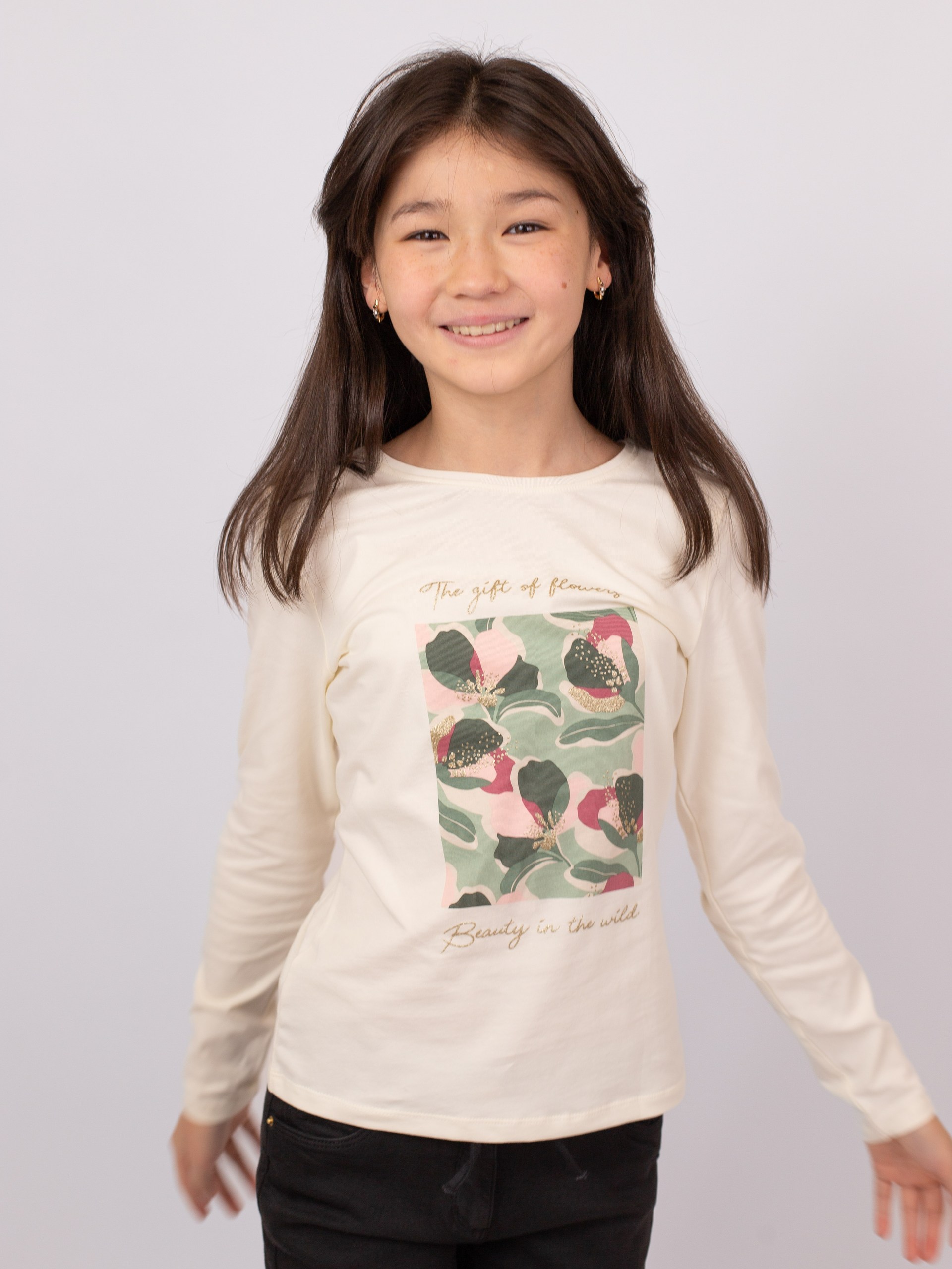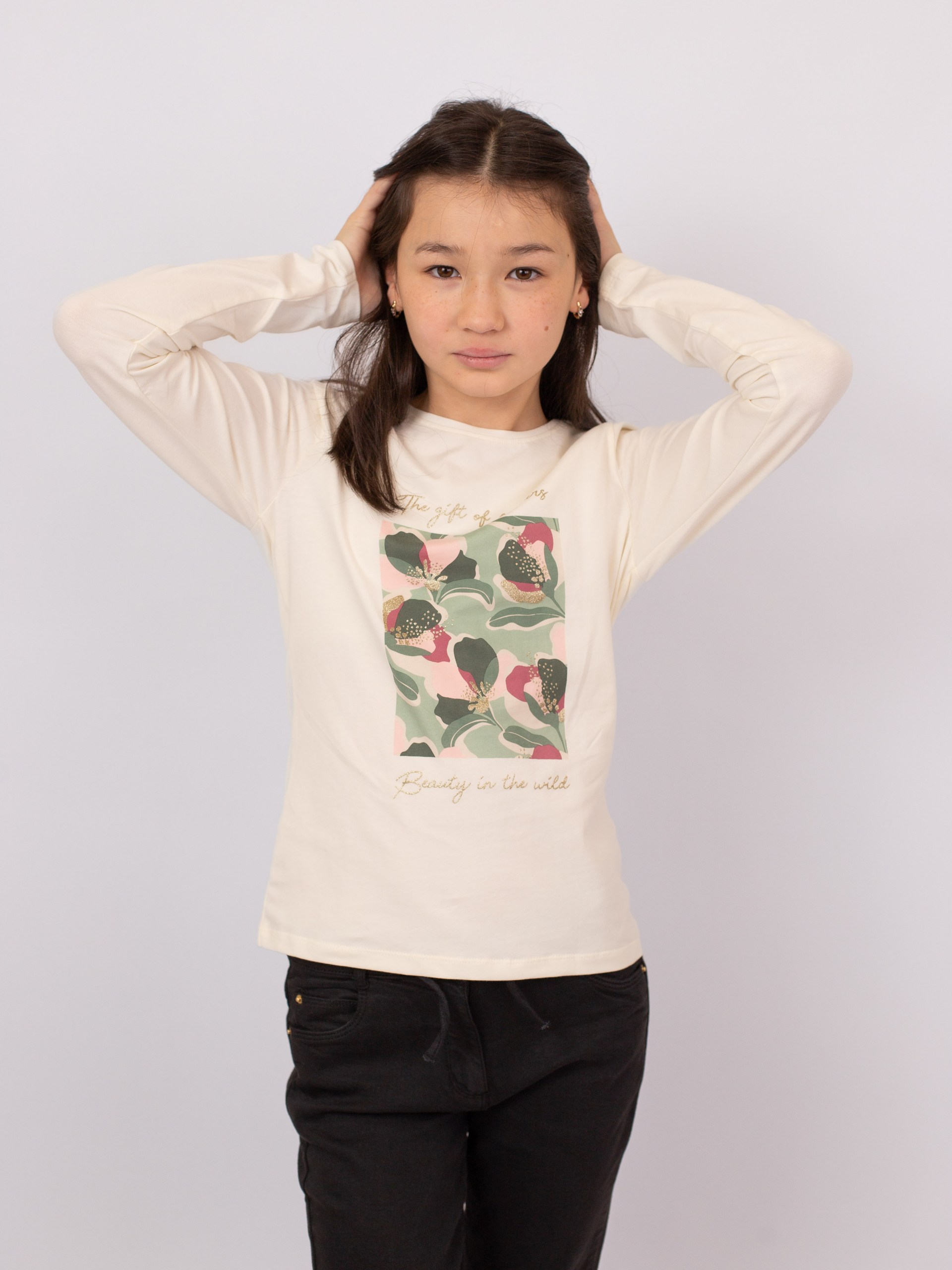 Лонгслив из мягкого трикотажа цвета экрю с круглым вырезом и длинными рукавами. Перед оформлен нежным цветочным принтом с блестящими деталями, придающими образу лёгкий акцент. Спинка — однотонная, без декора. Удобная и универсальная модель для повседневных образов.