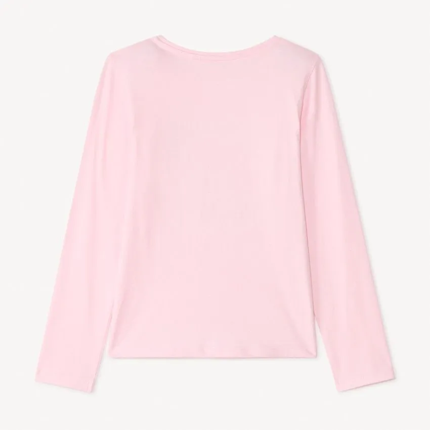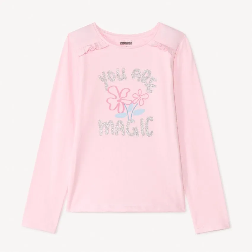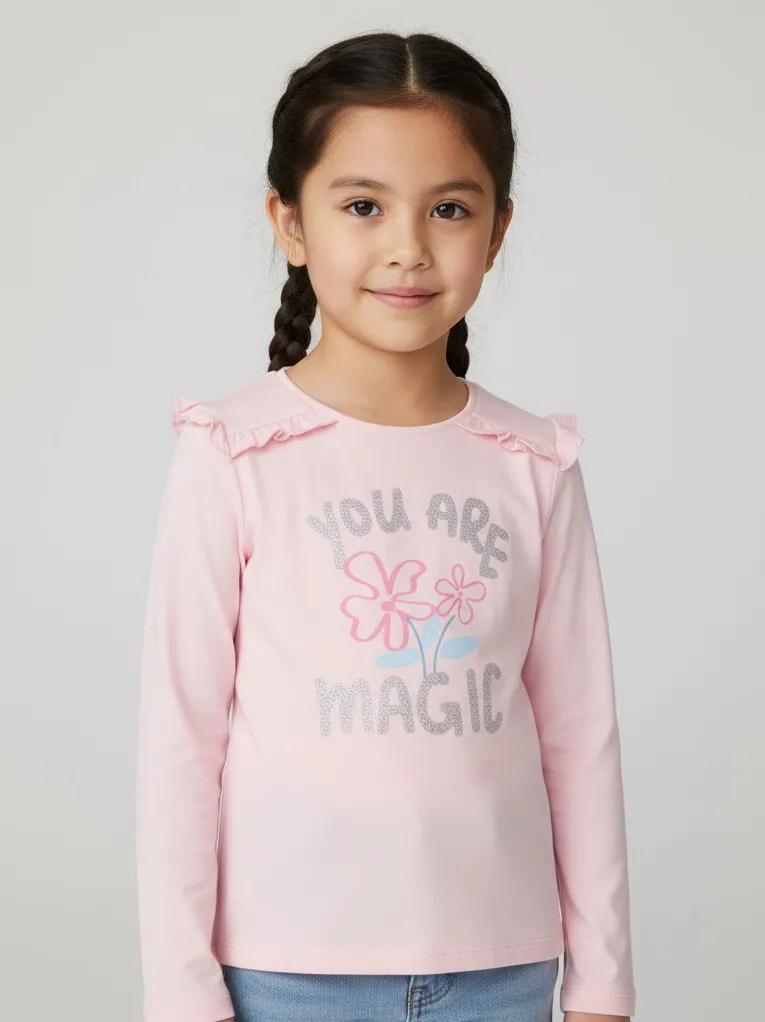 По центру расположен принт с пайетками, который добавляет модели сияния и праздничного настроения. Такая футболка отлично подойдёт для прогулок, школы и активного отдыха, сочетаясь с джинсами, юбками или леггинсами.