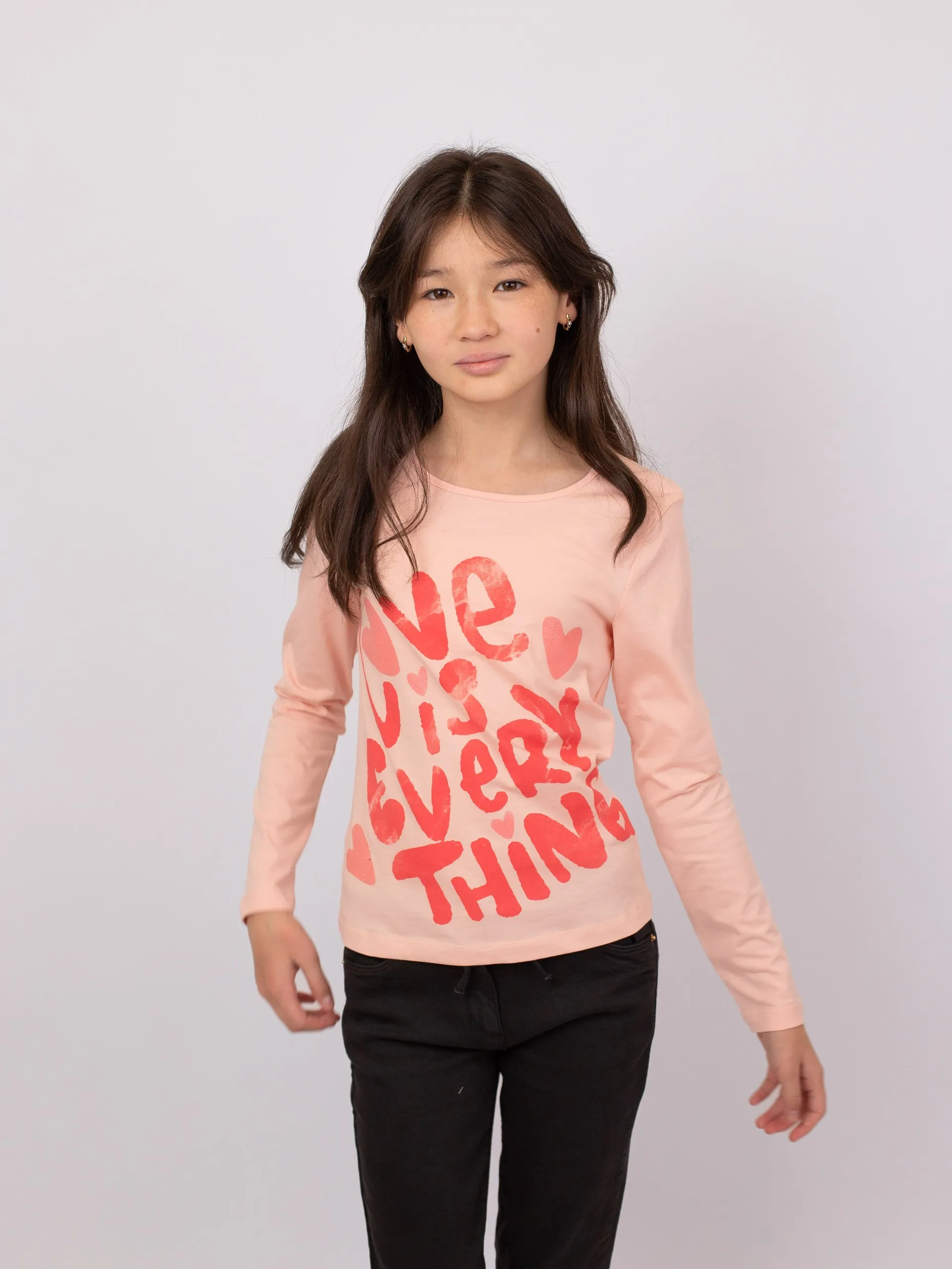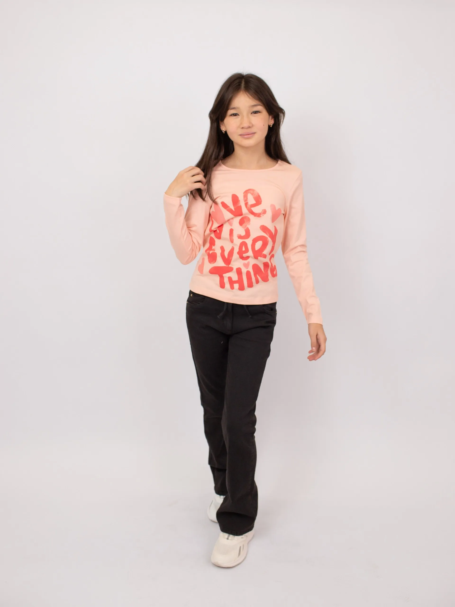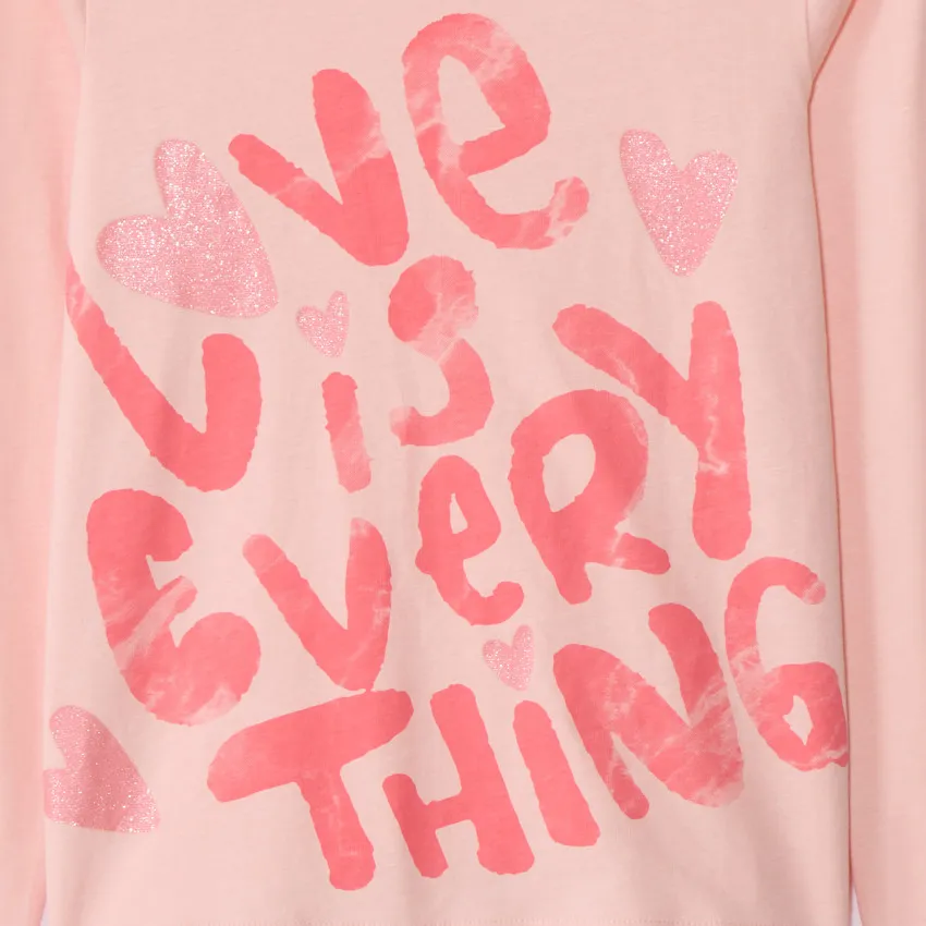 Футболка для девочки из мягкого хлопка. Модель однотонная, с декоративным принтом спереди, украшенным блестящими деталями.