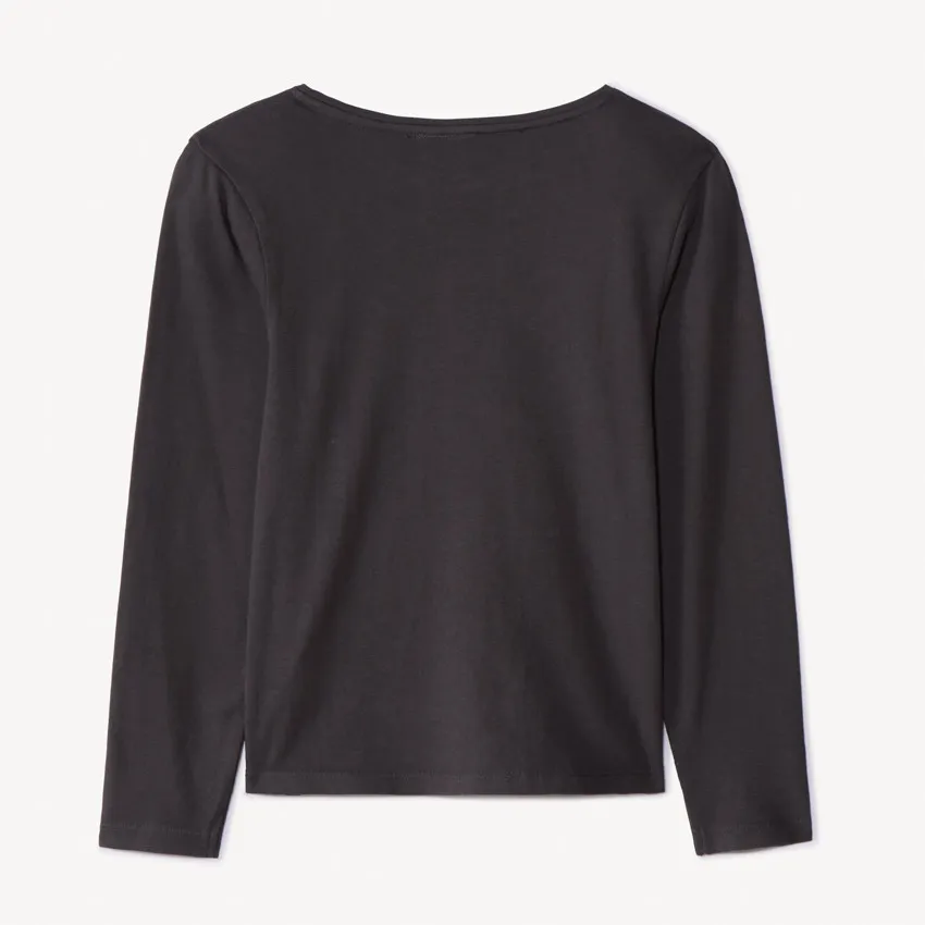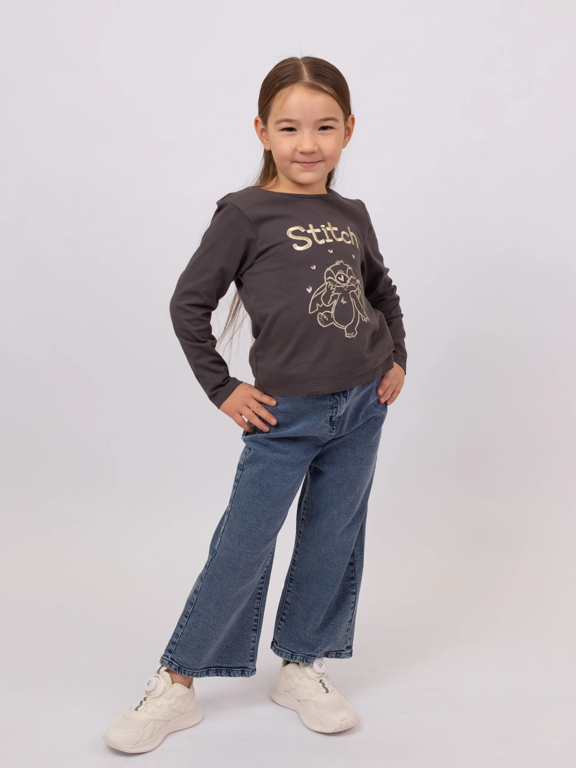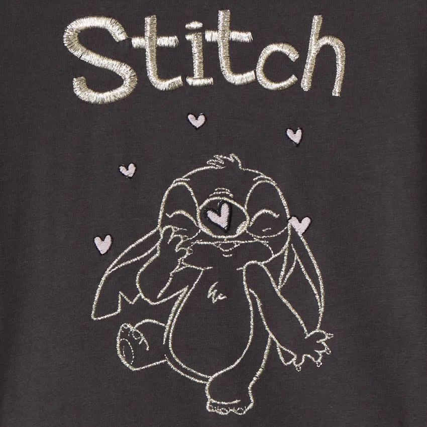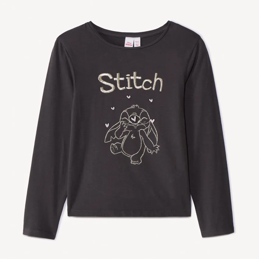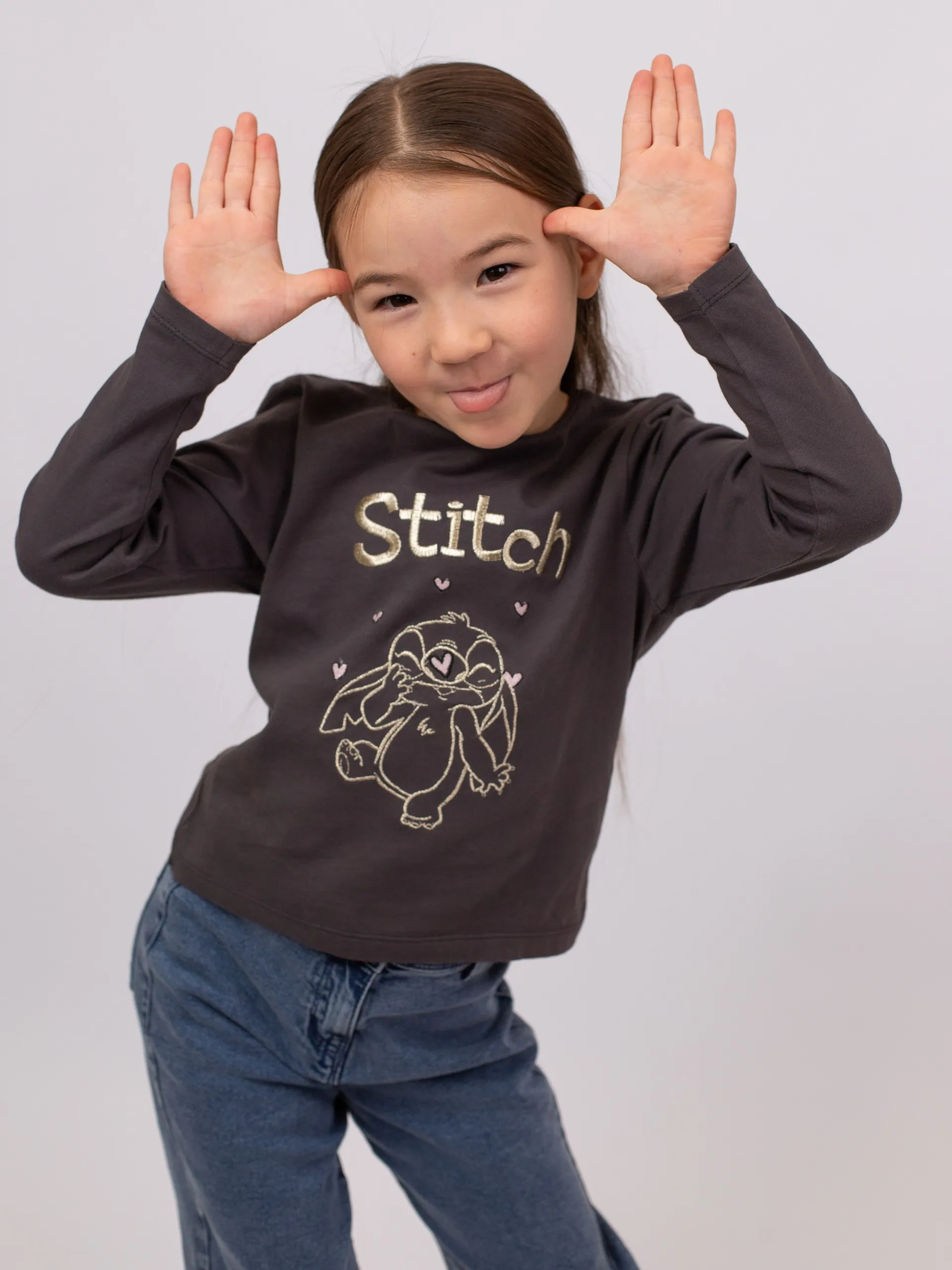 Футболка с длинными рукавами из трикотажа. Выполнена в однотонном сером цвете. Спереди украшена золотистым блестящим принтом с вышивкой персонажа Stitch Disney. Круглый вырез горловины, спинка однотонная.