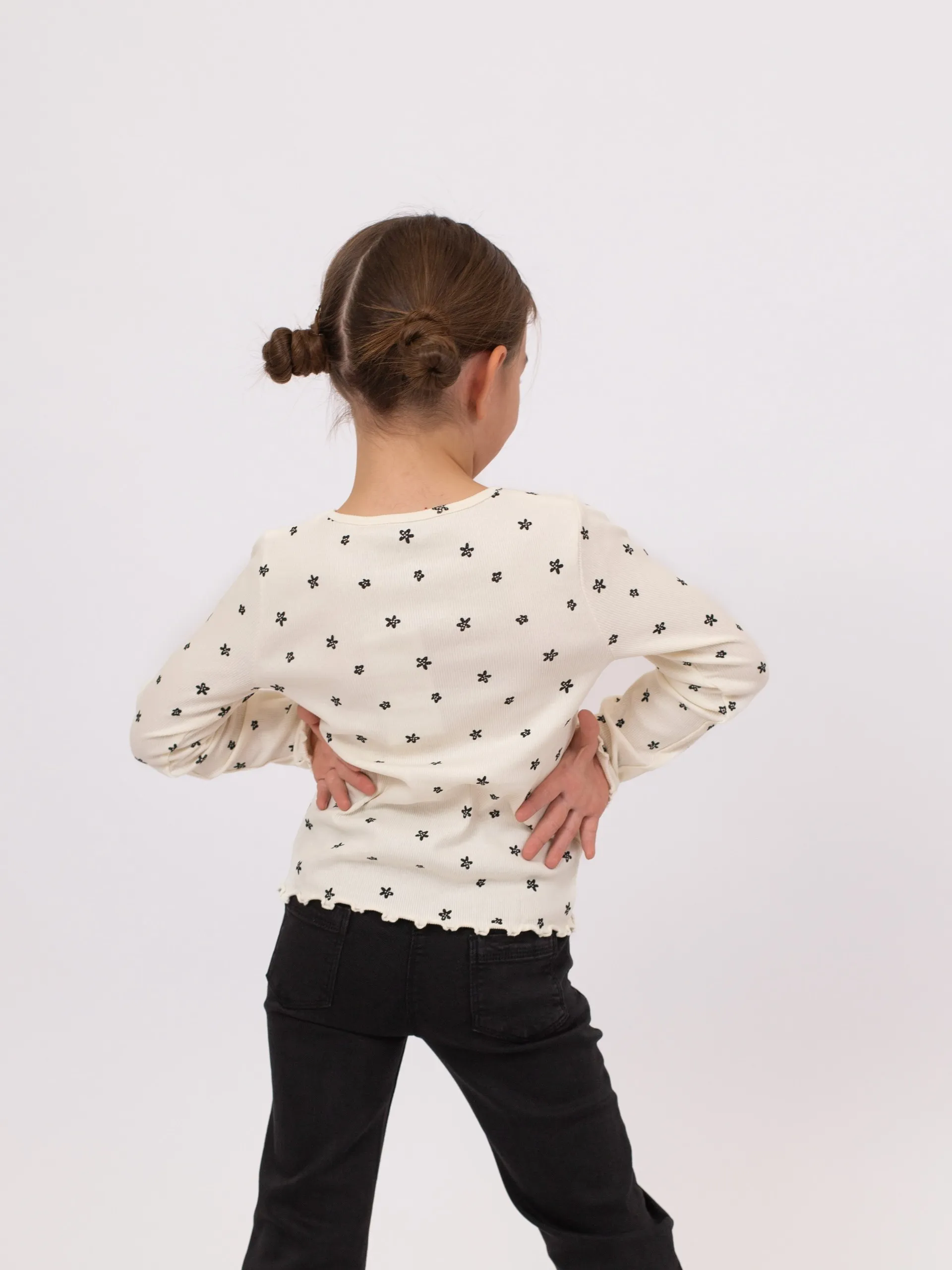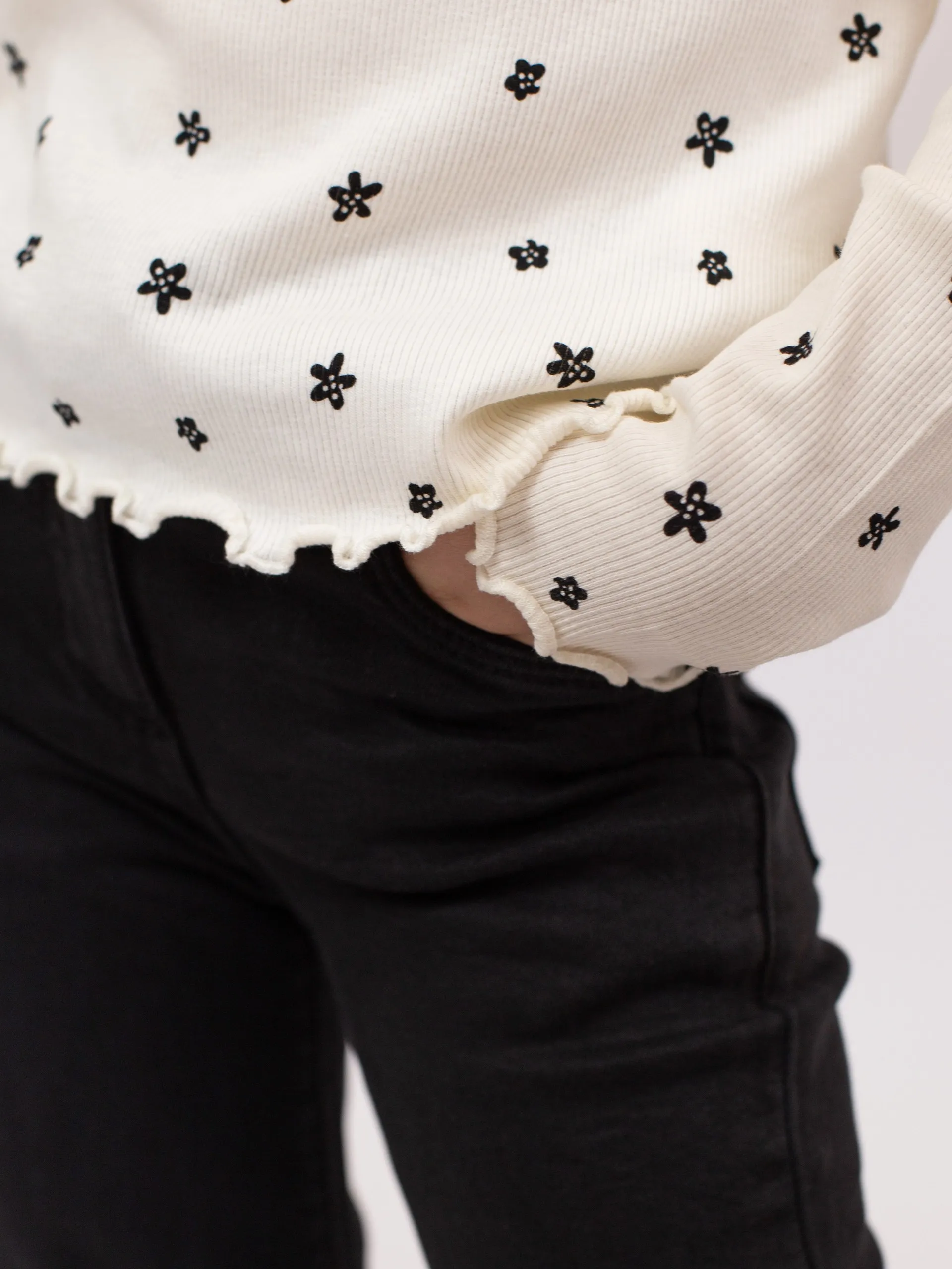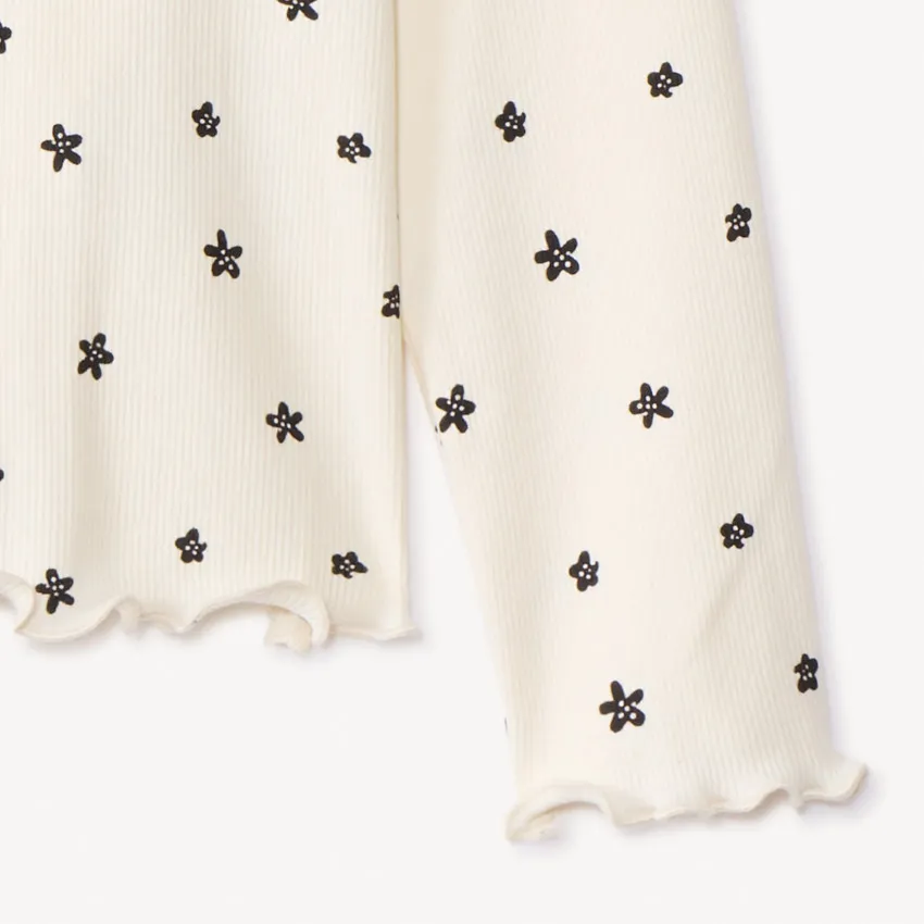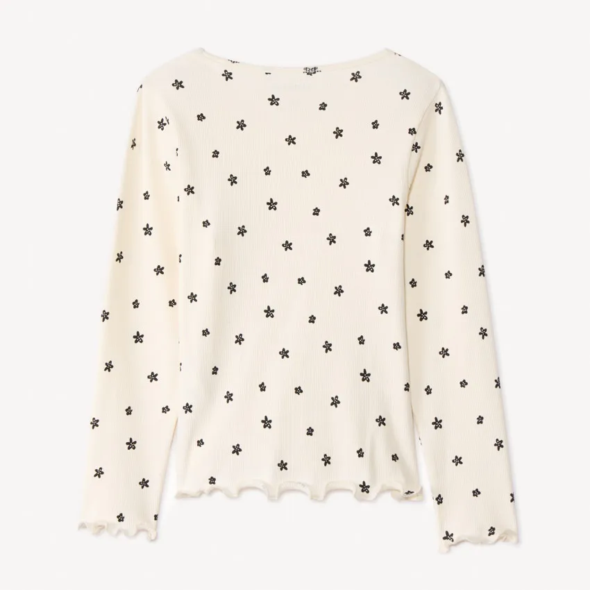 Лонгслив из трикотажа в рубчик цвета экрю с цветочным принтом по всей поверхности. Модель с круглым вырезом, волнистой отделкой низа и манжет. Уютный и нежный вариант для повседневного образа.