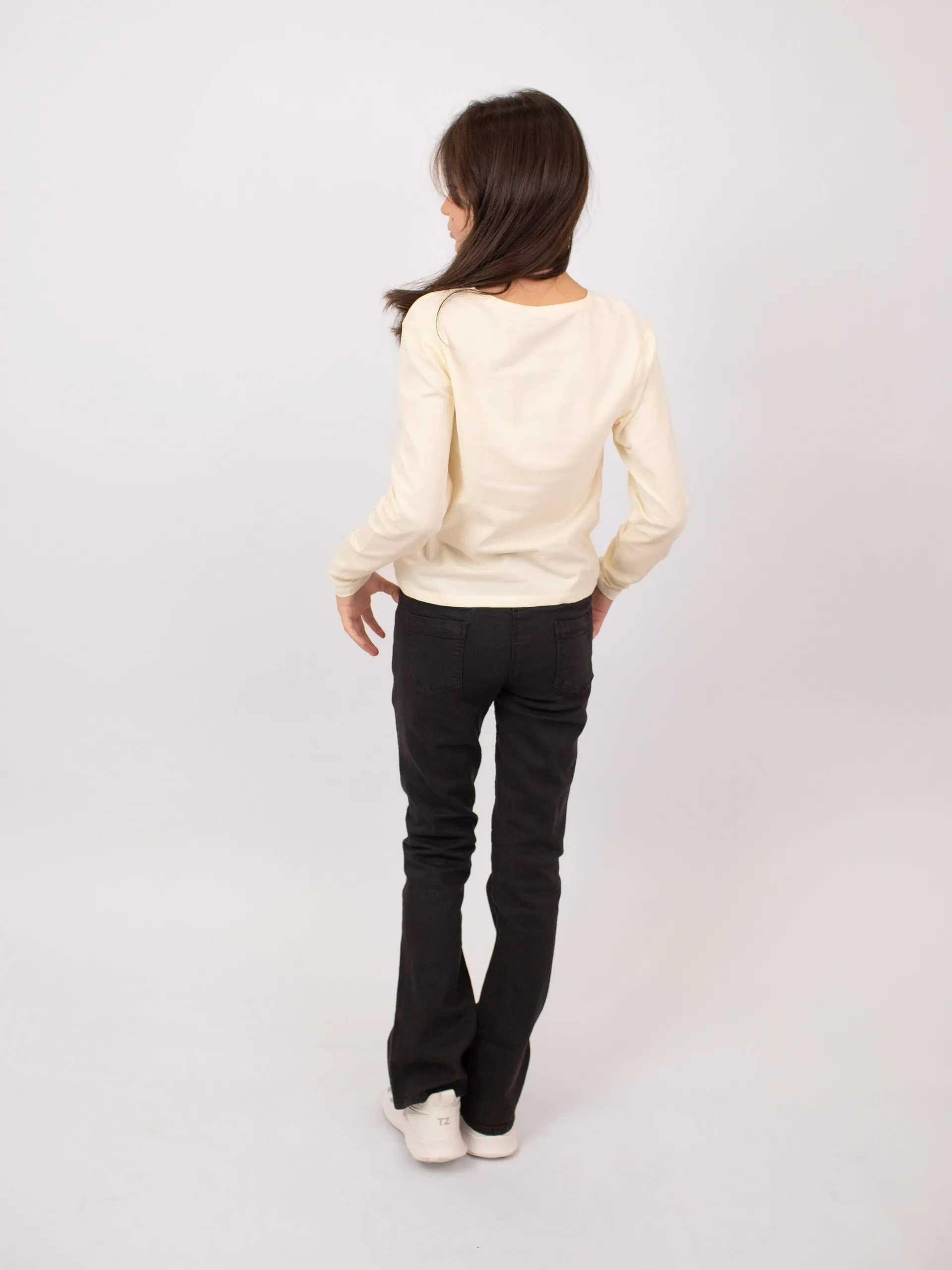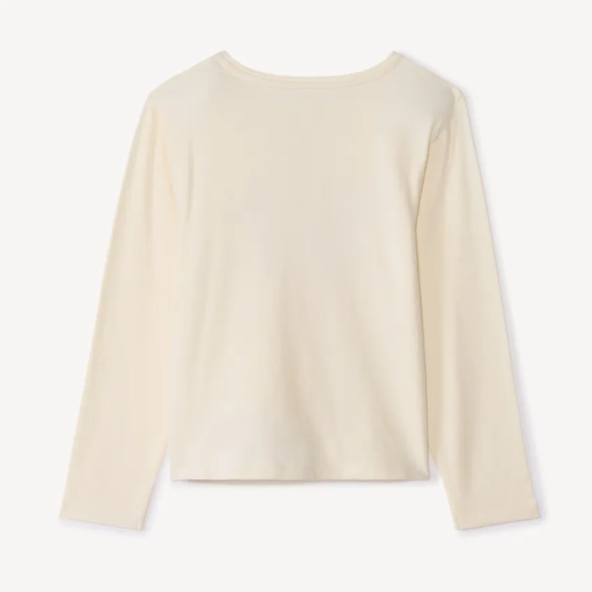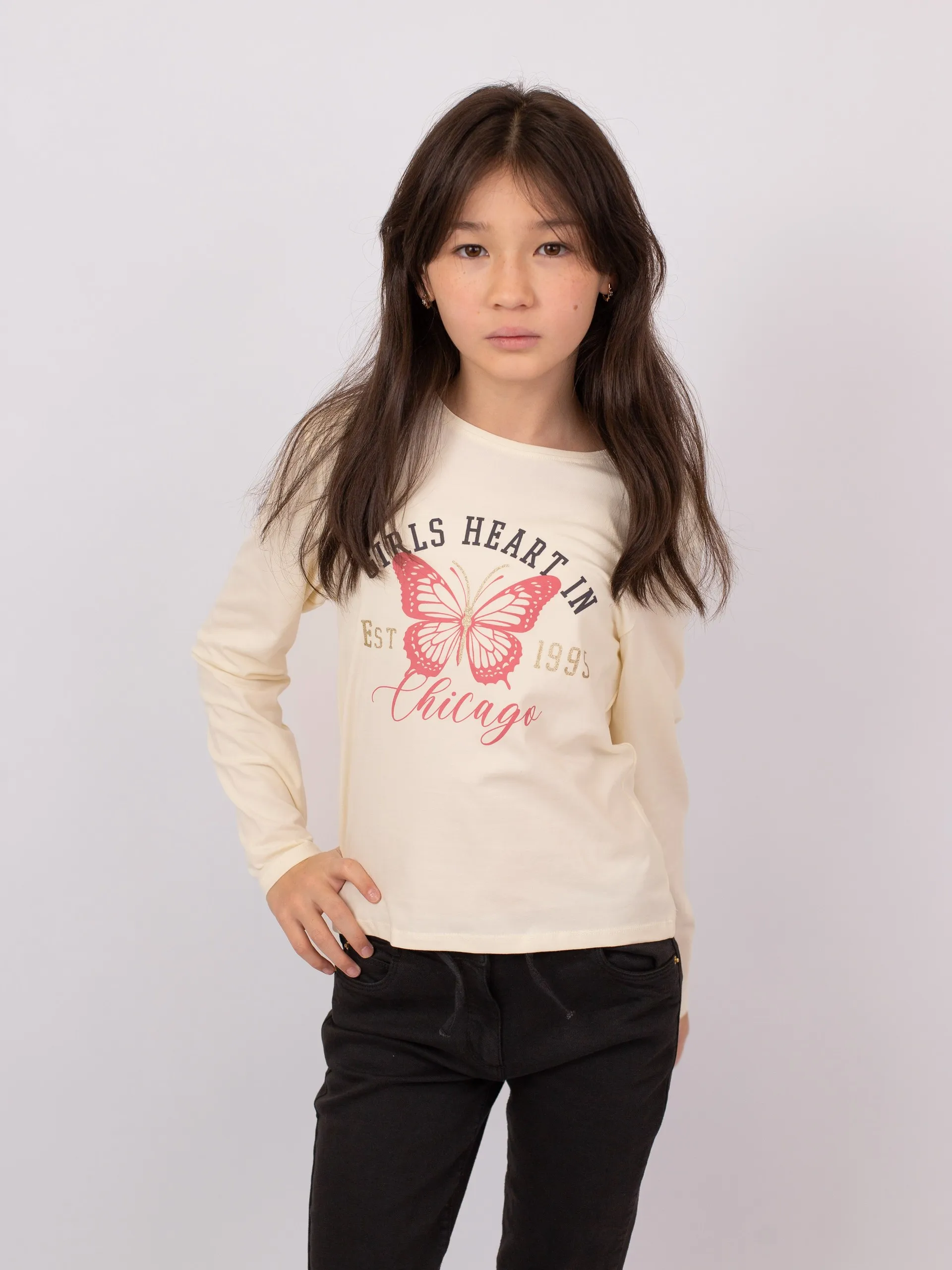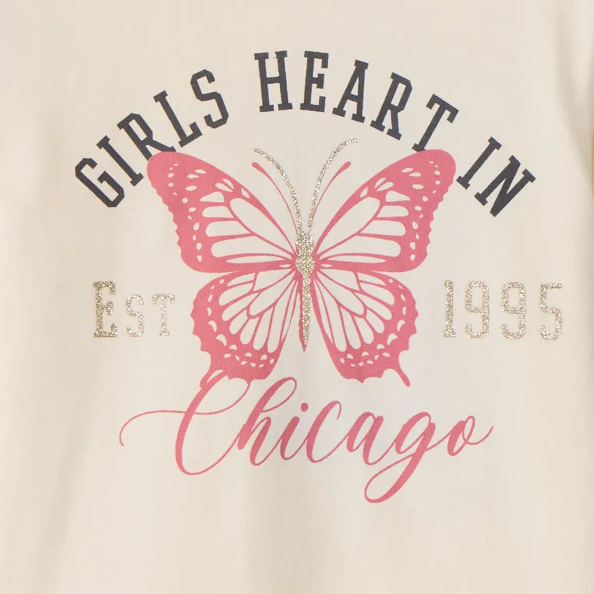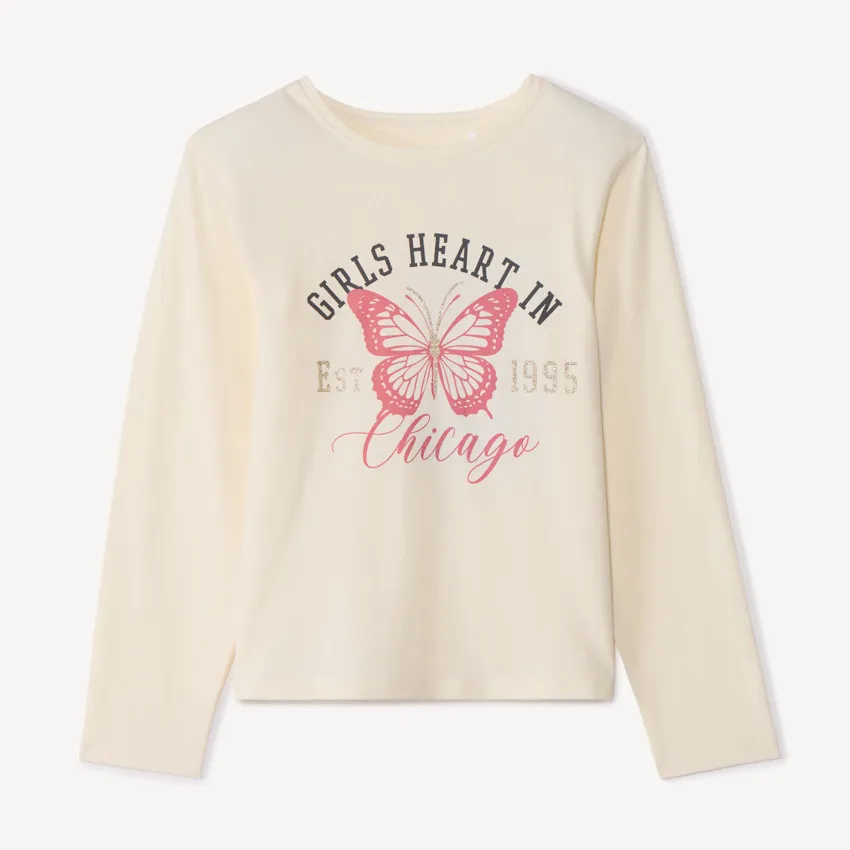 Футболка с длинными рукавами из трикотажа цвета экрю. Спереди украшена контрастным принтом с изображением бабочки и надписью с золотистыми блестящими деталями. Круглый вырез горловины, спинка однотонная.