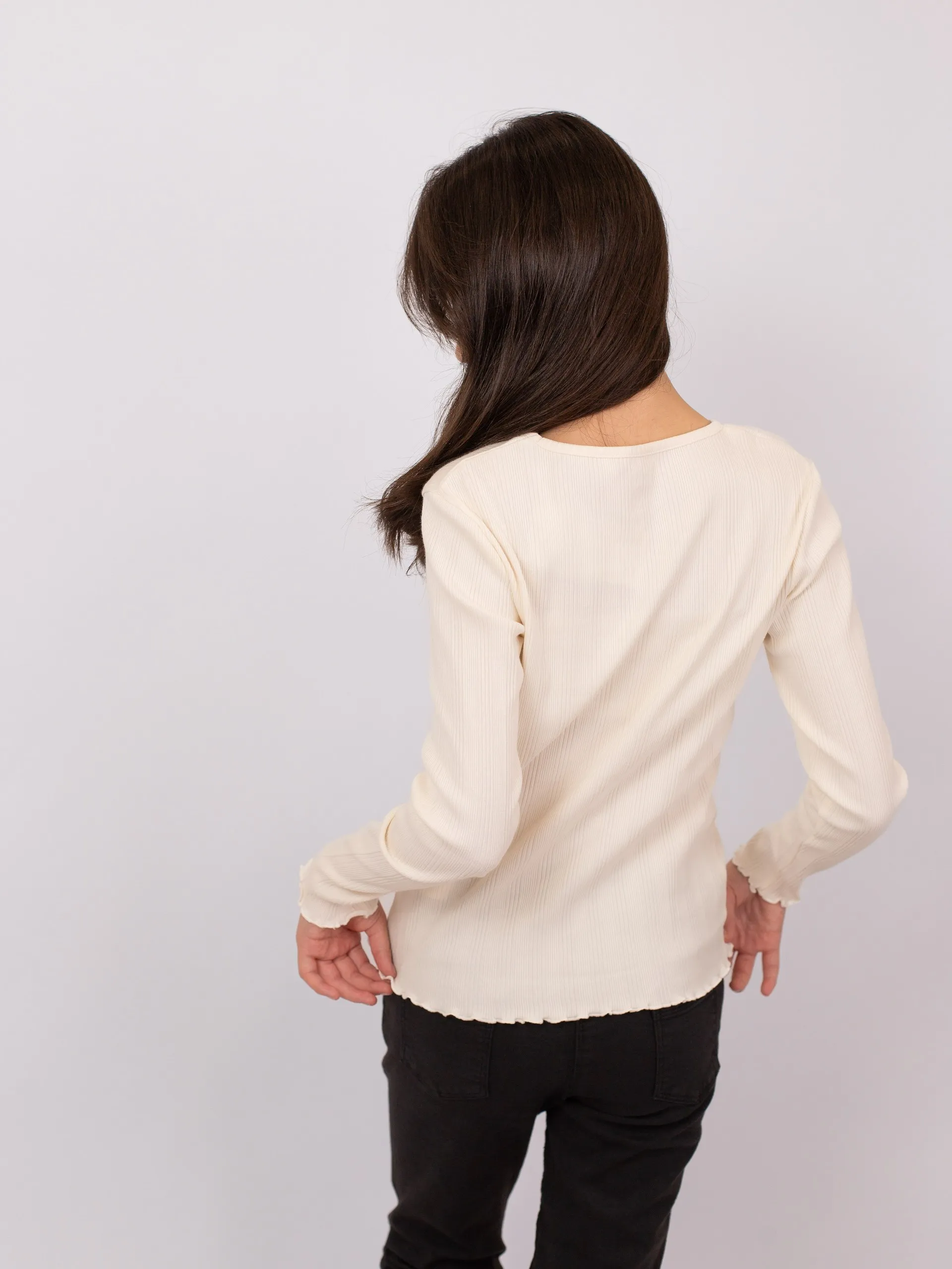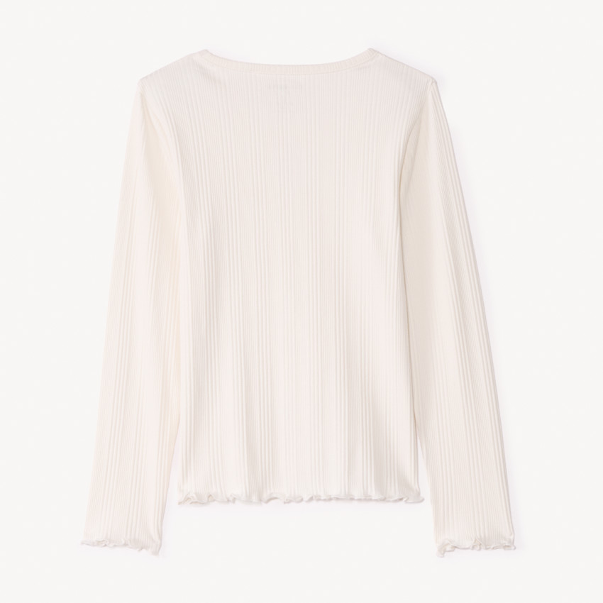 Футболка с длинными рукавами из мягкого трикотажа в рубчик. Однотонная модель украшена нежной вышивкой в виде сердечка на груди. Круглый вырез, манжеты и низ оформлены аккуратными воланами с декоративной строчкой. Спинка однотонная, модель смотрится элегантно и уютно.