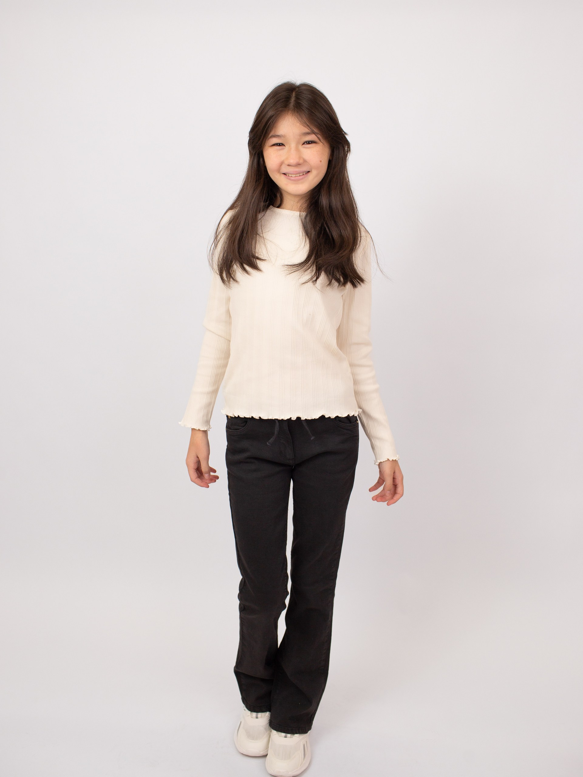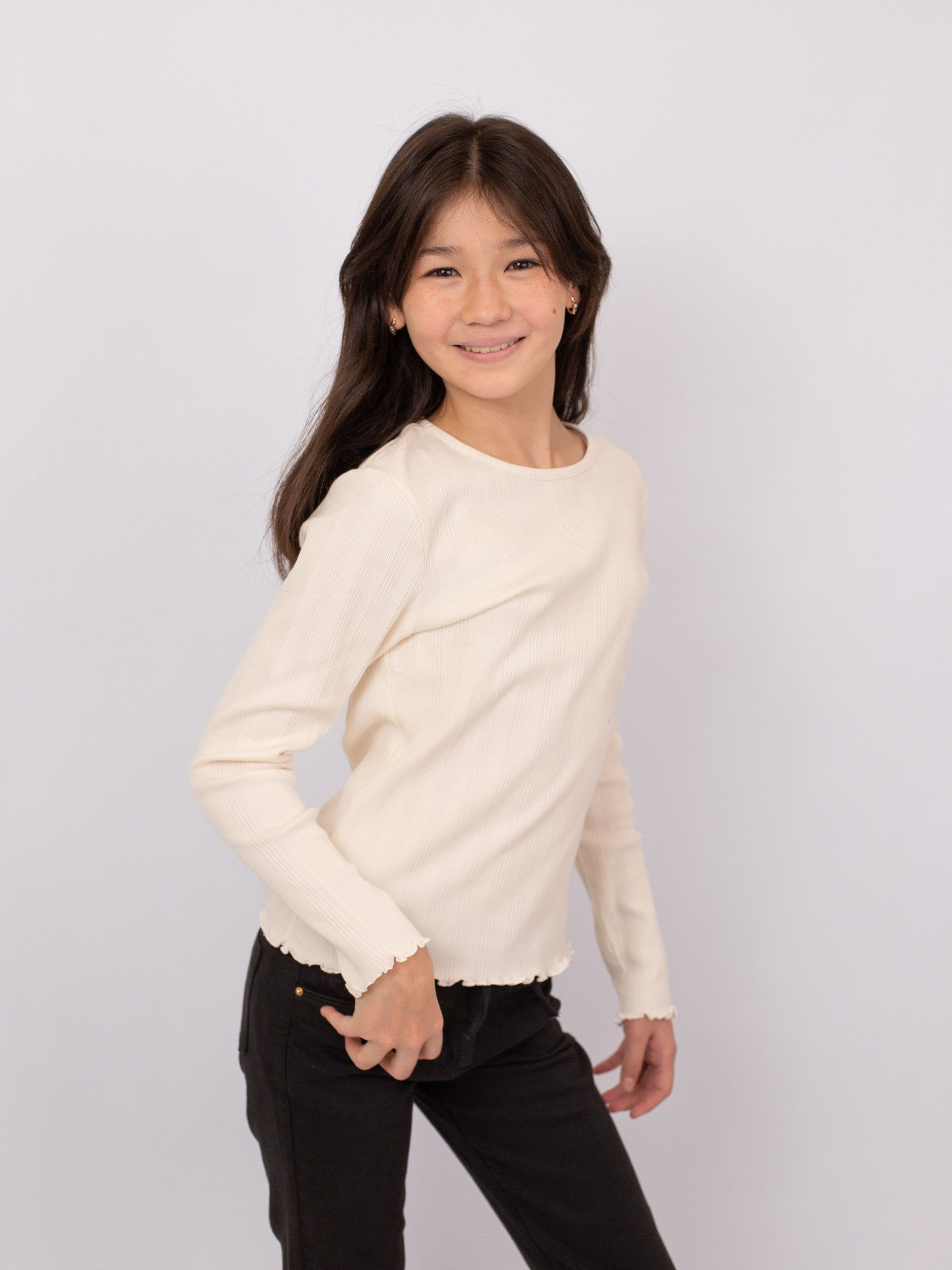 Футболка с длинными рукавами из мягкого трикотажа в рубчик. Однотонная модель украшена нежной вышивкой в виде сердечка на груди. Круглый вырез, манжеты и низ оформлены аккуратными воланами с декоративной строчкой. Спинка однотонная, модель смотрится элегантно и уютно.