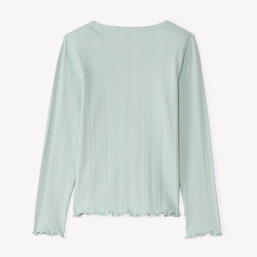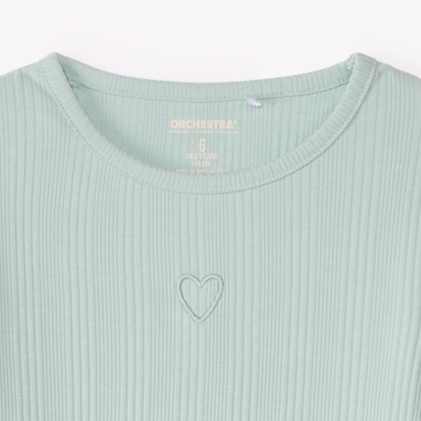 Футболка с длинными рукавами из мягкого трикотажа в рубчик. Однотонная, с нежной вышивкой в виде сердечка на груди. Круглый вырез, манжеты и низ украшены аккуратными воланами с декоративной строчкой. Спинка однотонная.