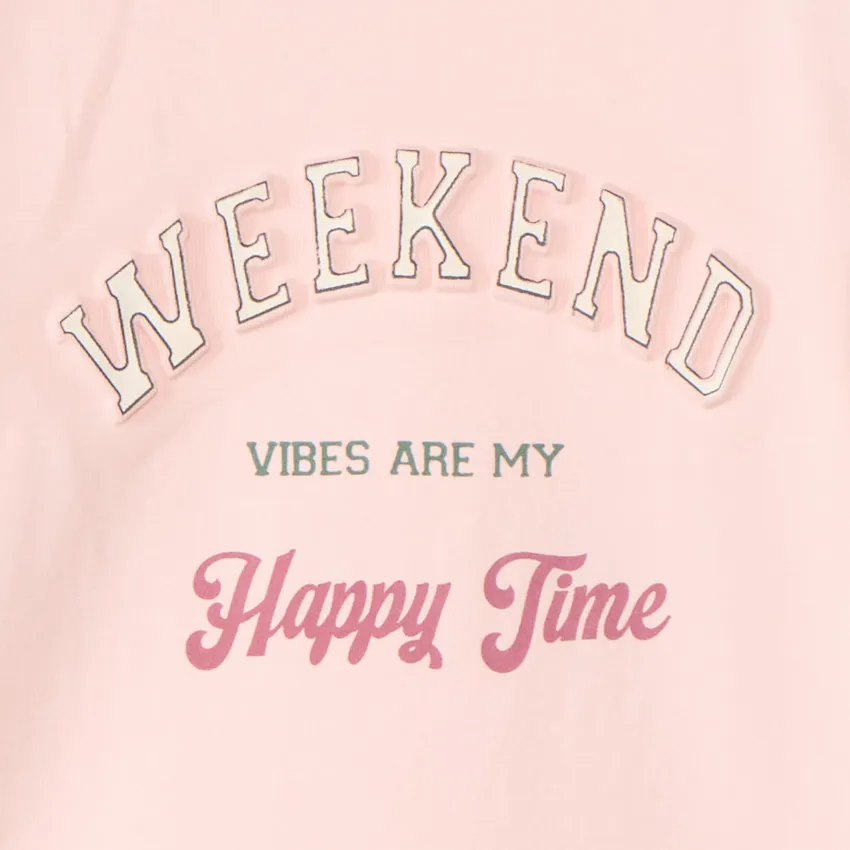 Футболка с длинными рукавами из мягкого трикотажа нежно-розового цвета. Круглый вырез горловины, спереди рельефный принт и декоративные надписи. Спинка однотонная, модель удобная и лёгкая для повседневной носки.