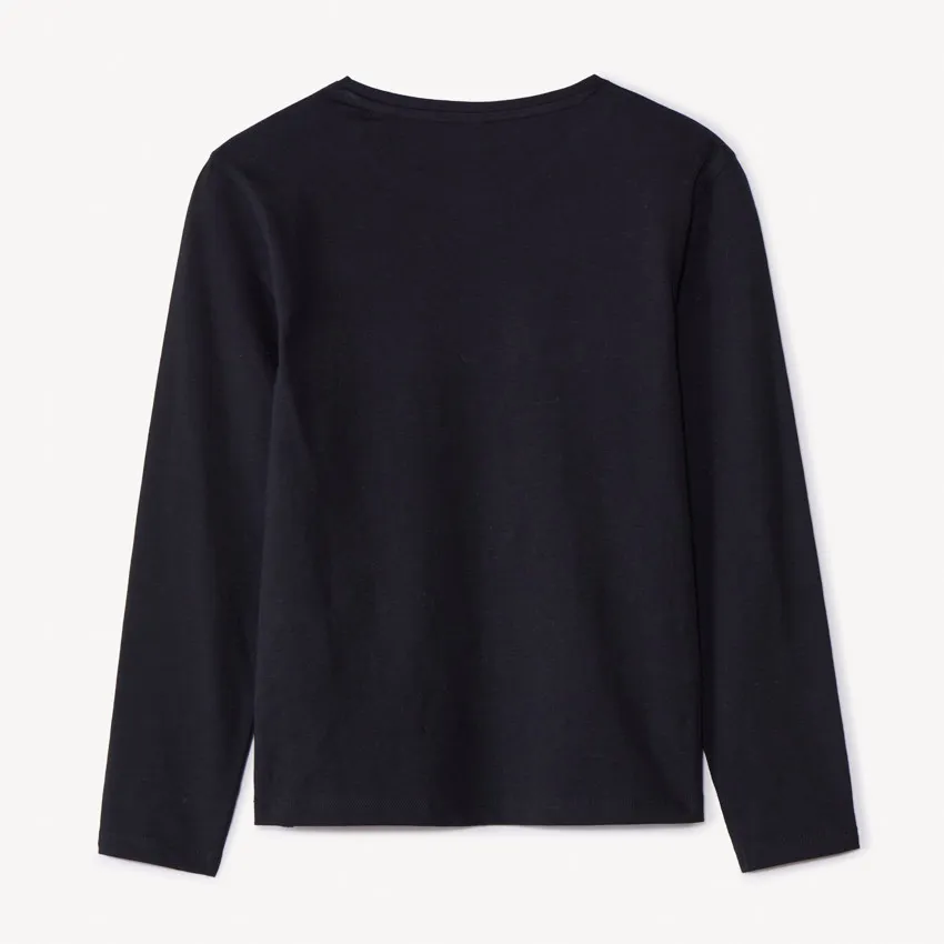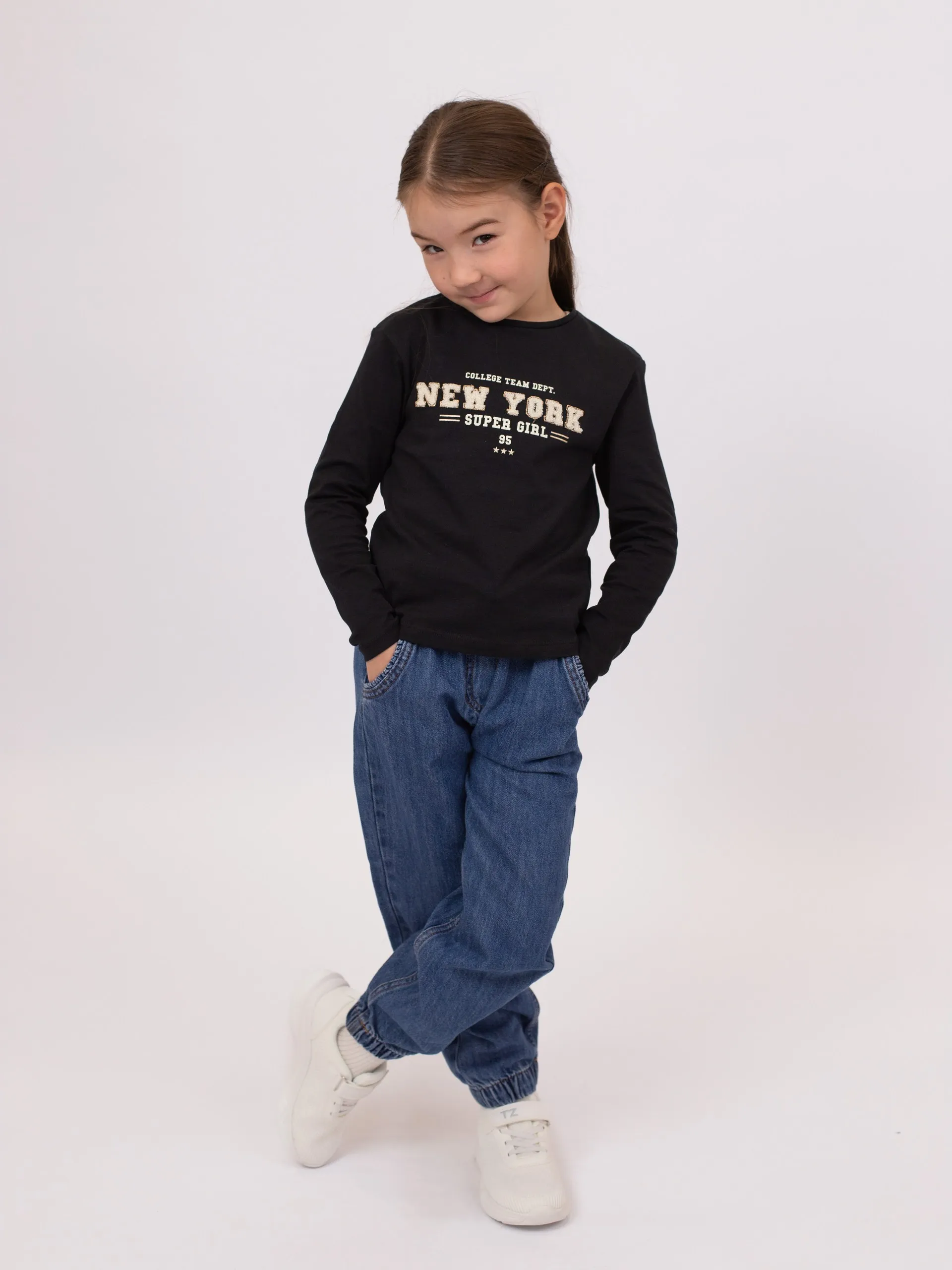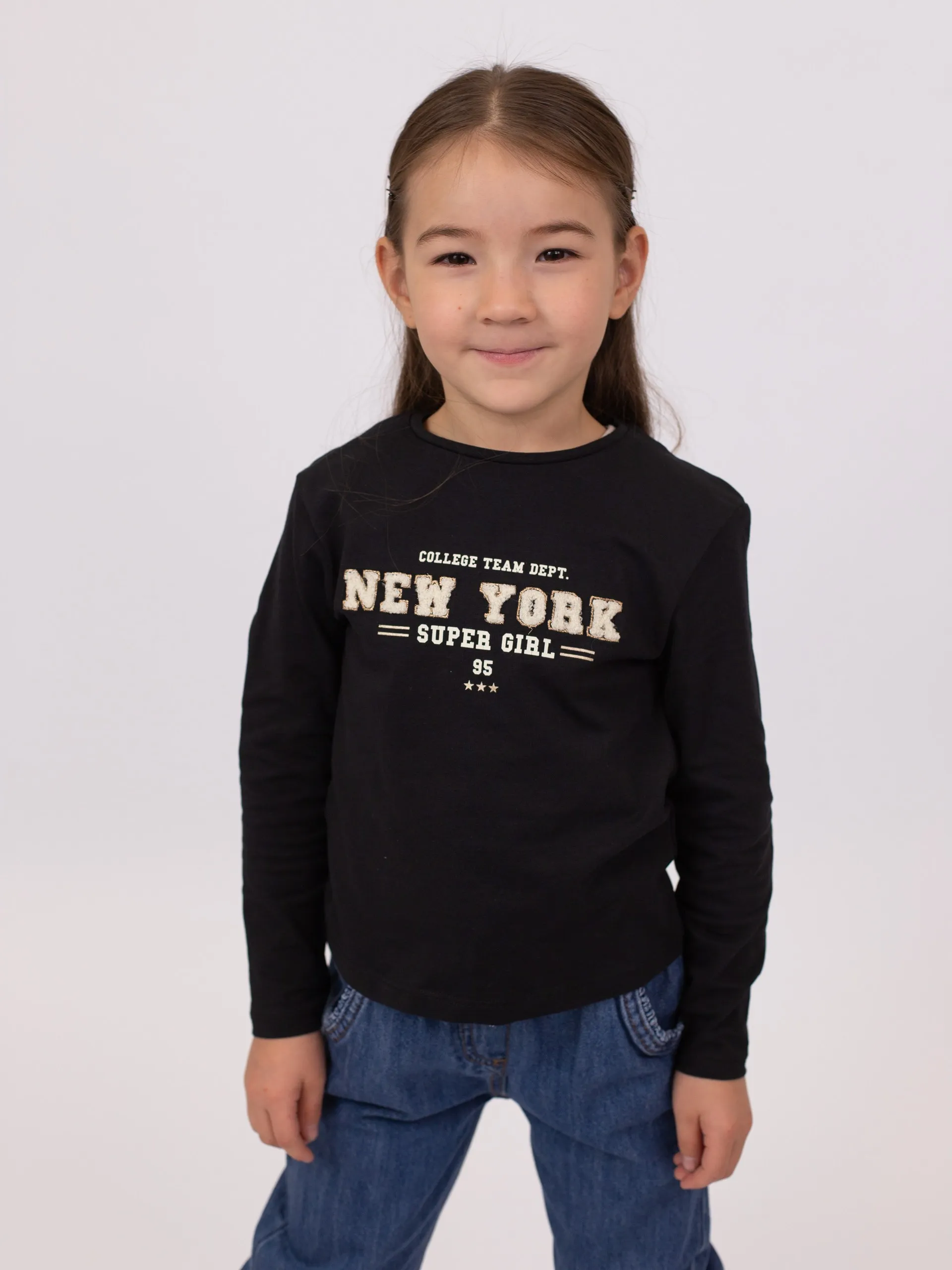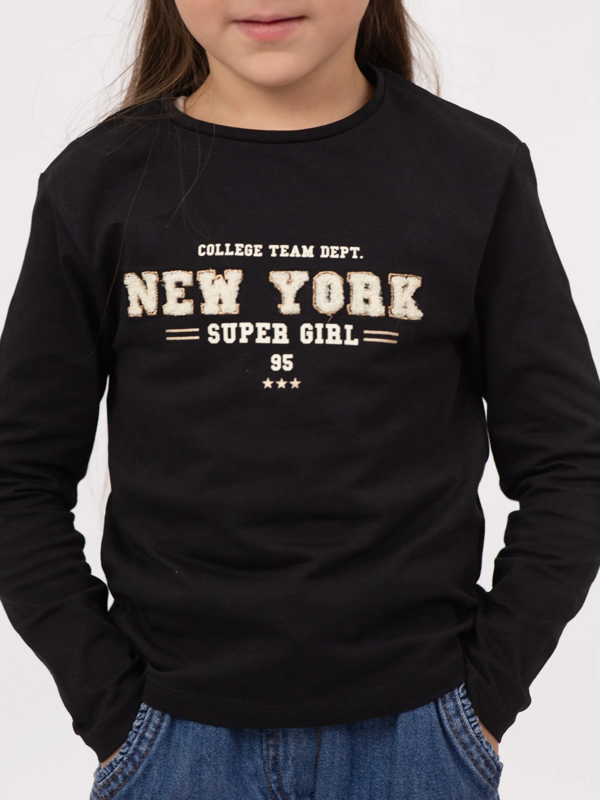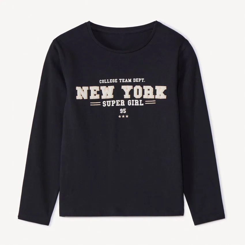 Футболка с длинными рукавами из мягкого трикотажа чёрного цвета. Модель с опущенными плечами и круглым вырезом. Спереди вышивка с надписью «New York» в объёмной текстуре. Спинка однотонная.