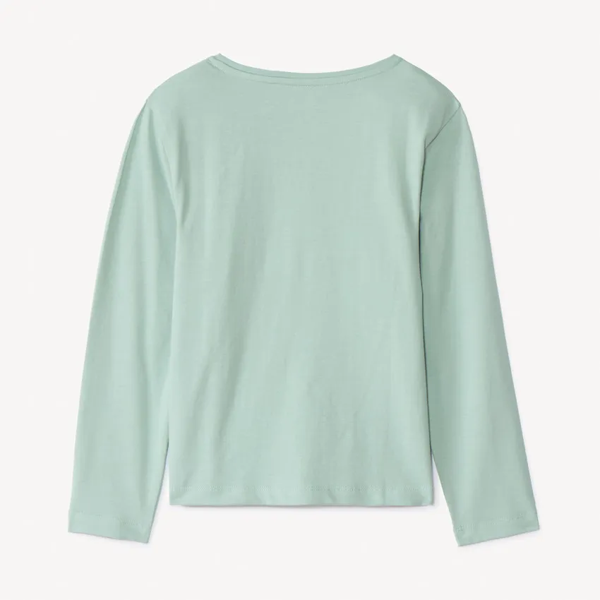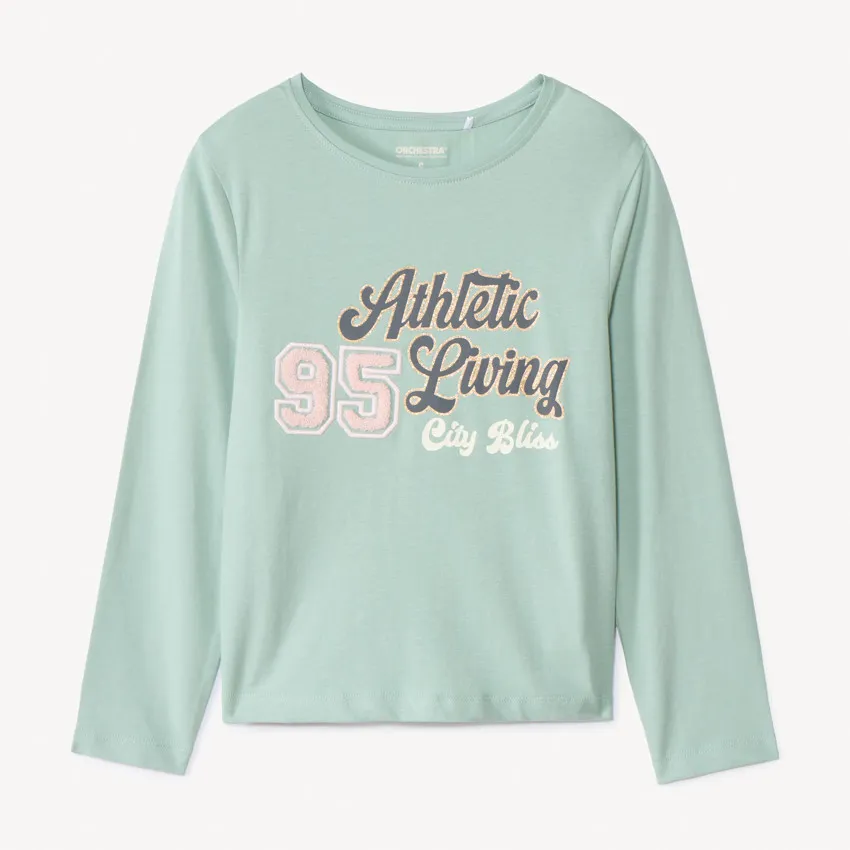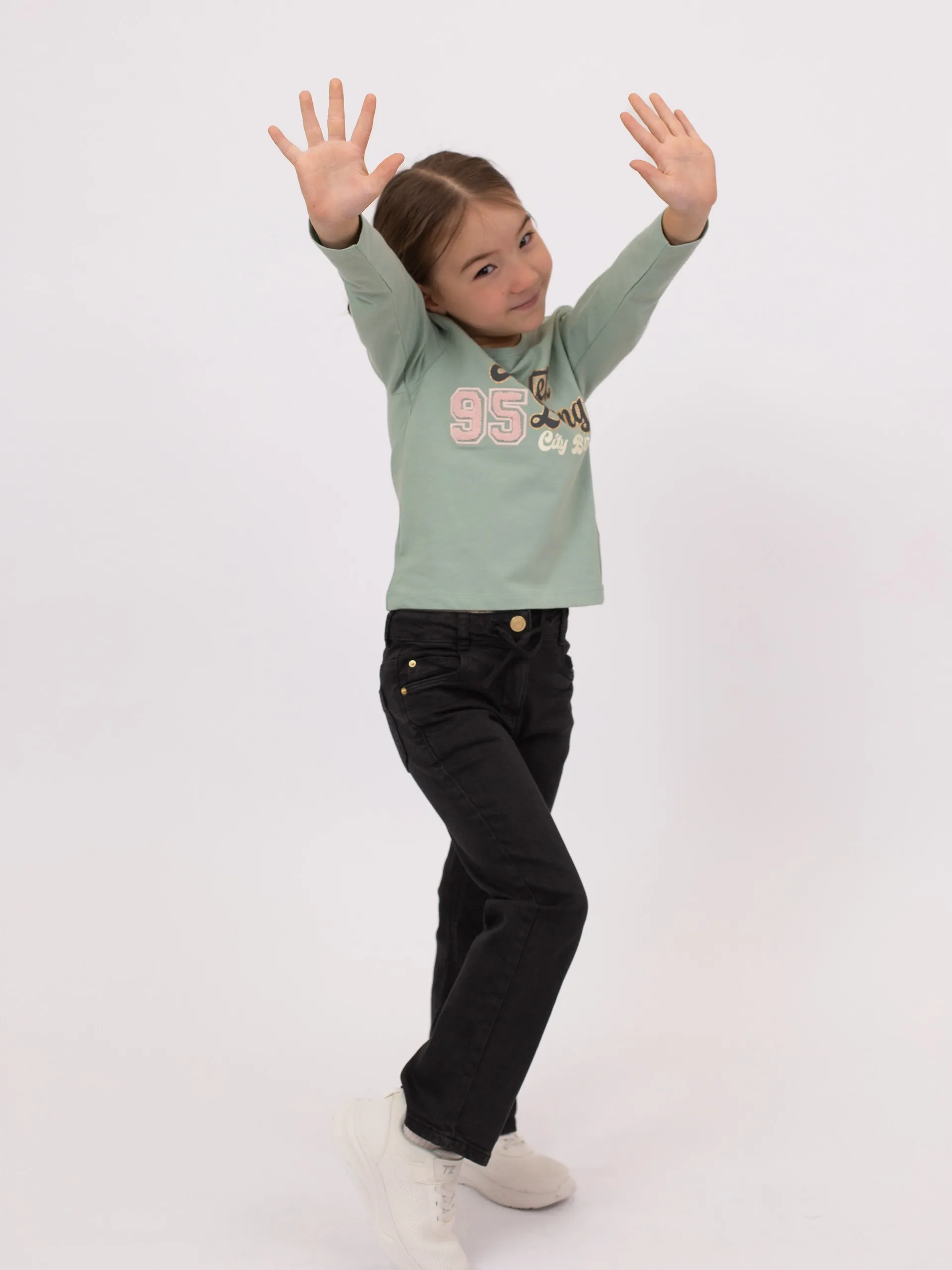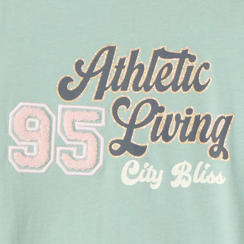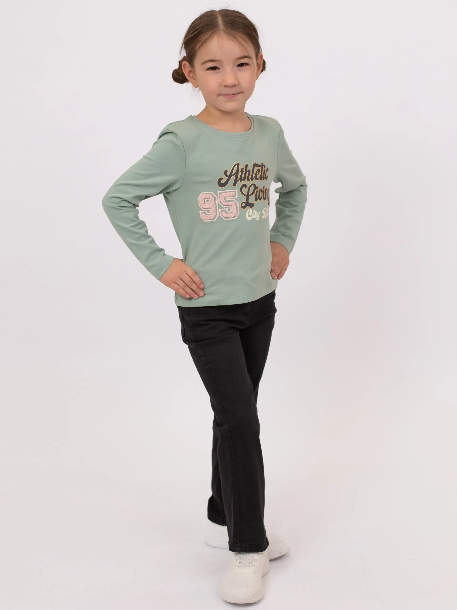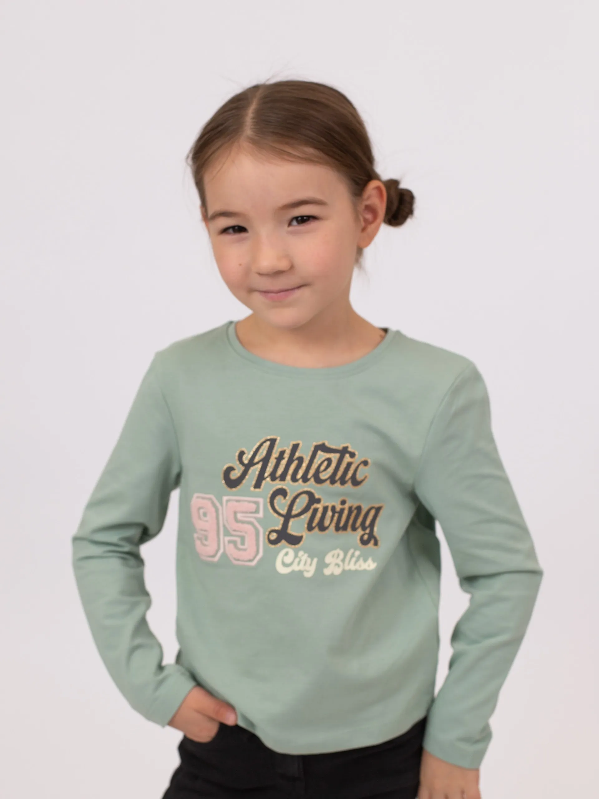 Футболка с длинными рукавами из мягкого трикотажа цвета зелёной лагуны. Круглый вырез, спереди блестящая надпись с объёмными вышитыми аппликациями. Спинка однотонная.