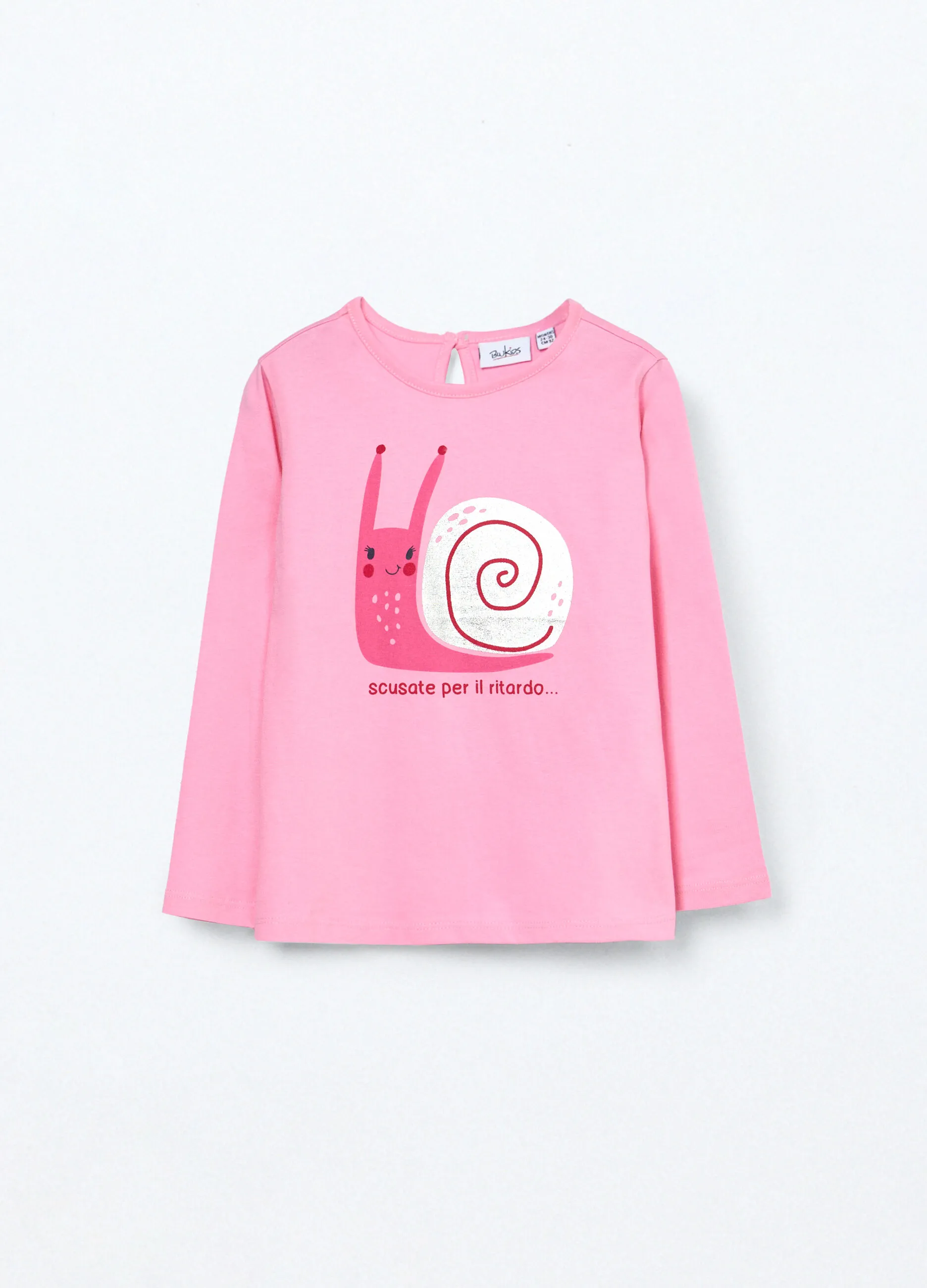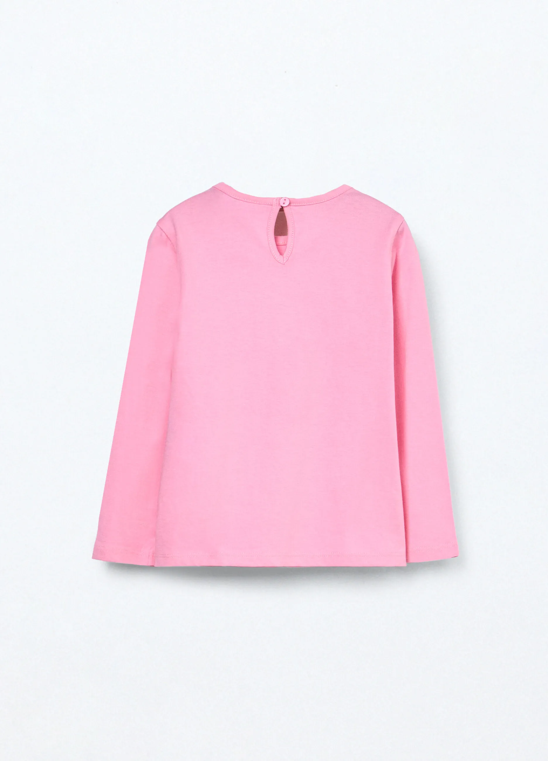 Футболка с длинными рукавами из мягкого хлопкового джерси. Спереди — нежный принт, сзади — вырез-капелька с застёжкой на пуговицу для удобства переодевания. Классический круглый вырез и натуральный материал обеспечивают комфорт на каждый день