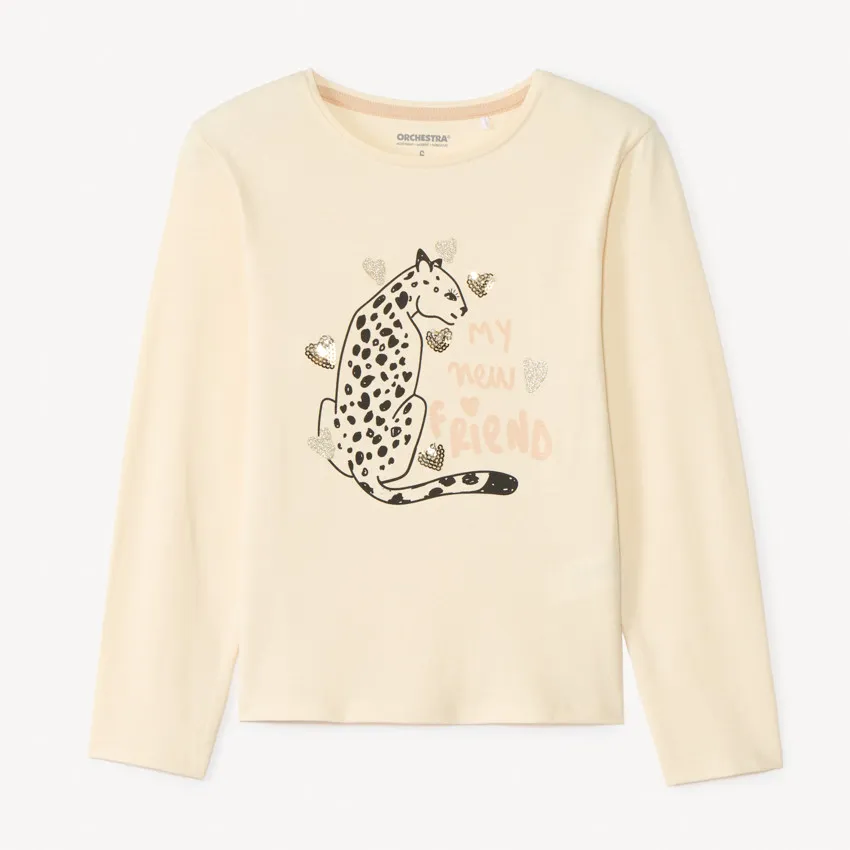 Футболка для девочки из мягкого хлопкового трикотажа с контрастным леопардовым принтом, украшенным блёстками и яркими надписями. Модель привлекает внимание стильным дизайном и отлично подходит для повседневных образов. Материал из 100% хлопка приятен к телу, дышащий и комфортный в носке.