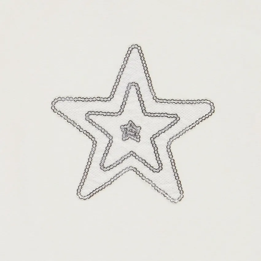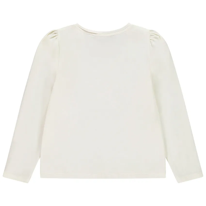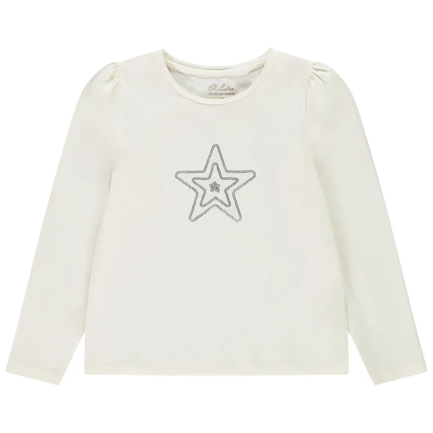 Футболка с длинным рукавом выполнена из мягкого джерси в светлом, кремовом оттенке. Передняя часть украшена звёздным мотивом из тюля и пайеток, создающим нежный и праздничный акцент. Спинка остаётся полностью однотонной, сохраняя чистый и аккуратный силуэт.