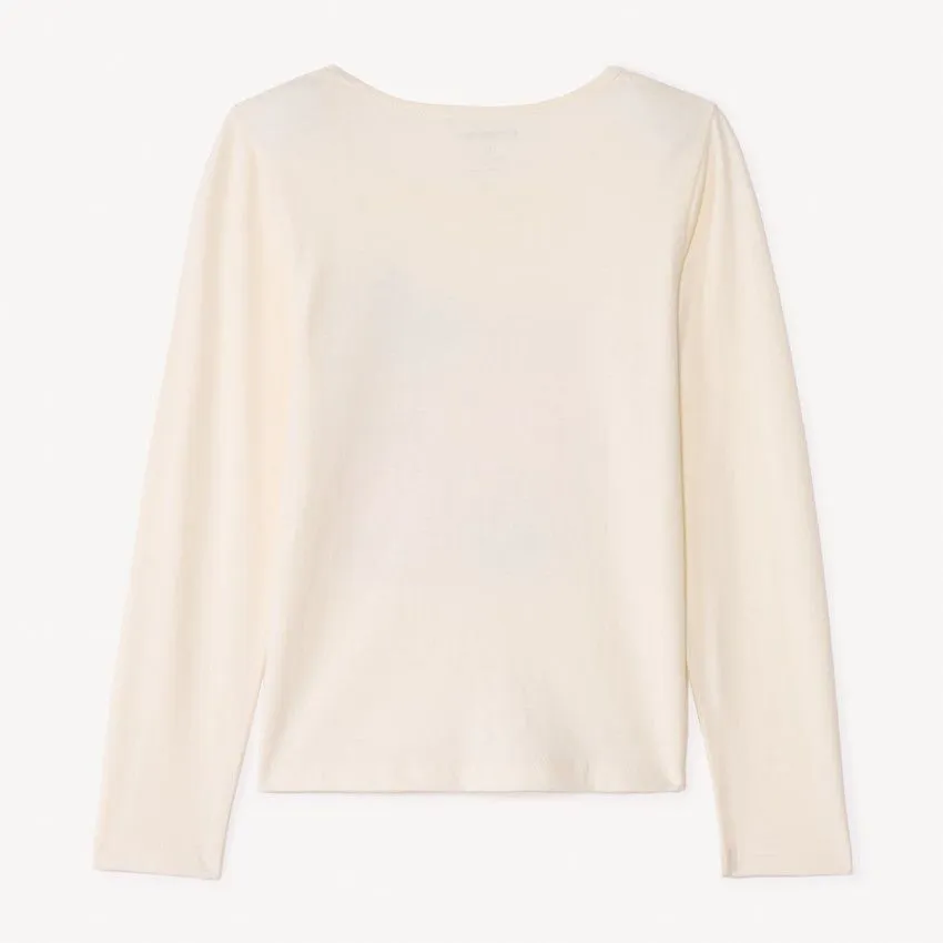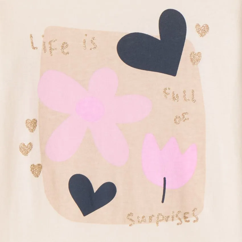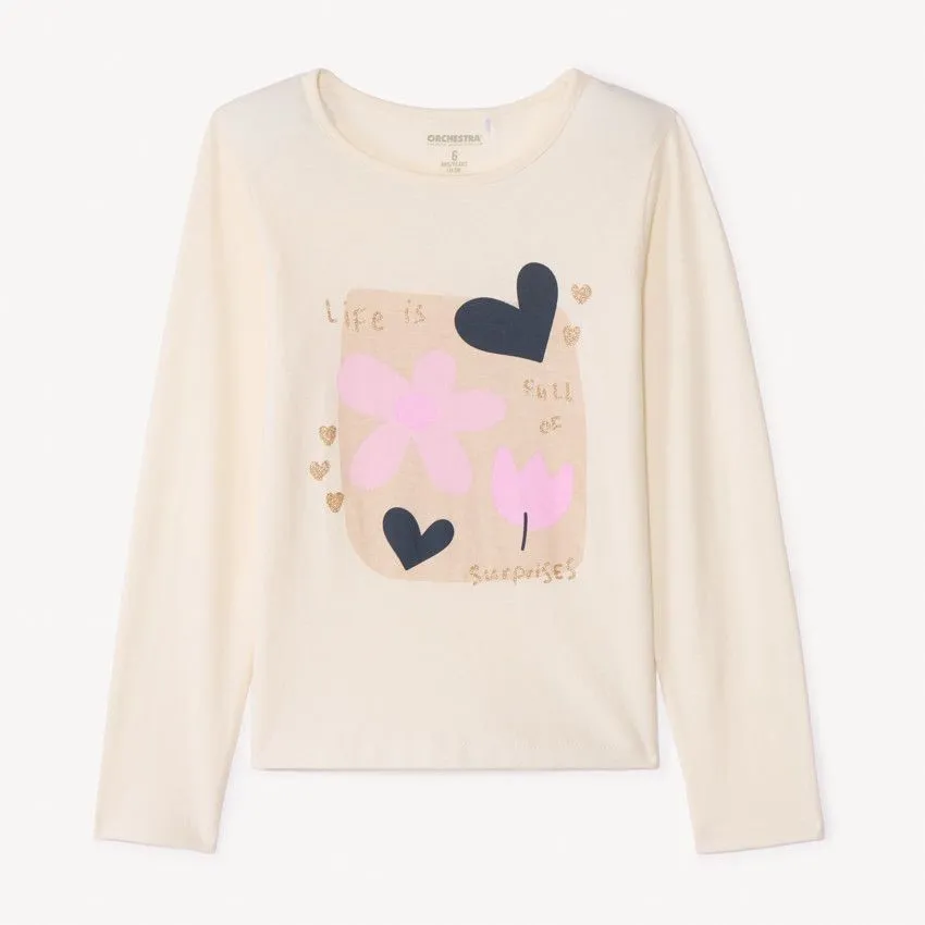В центральной части модели расположен выразительный принт с пайетками, который добавляет образу нарядный акцент и делает футболку особенно привлекательной для ребёнка. Длинные рукава повышают практичность и позволяют носить модель в прохладную погоду.