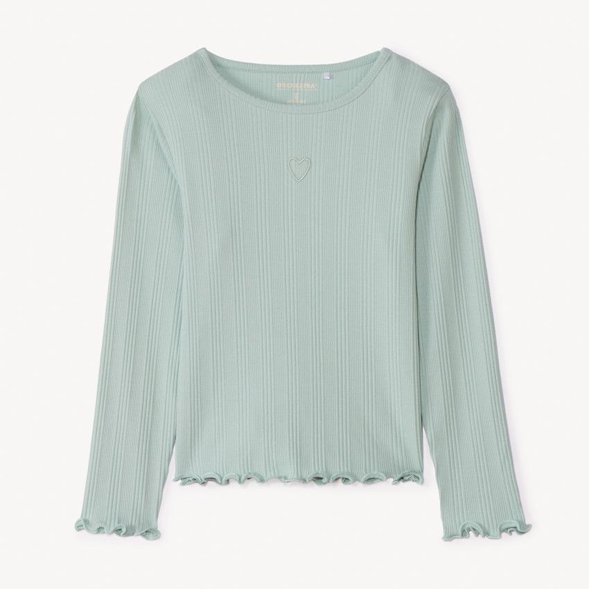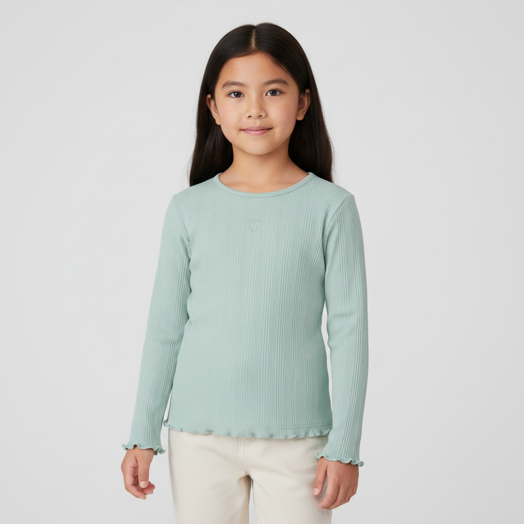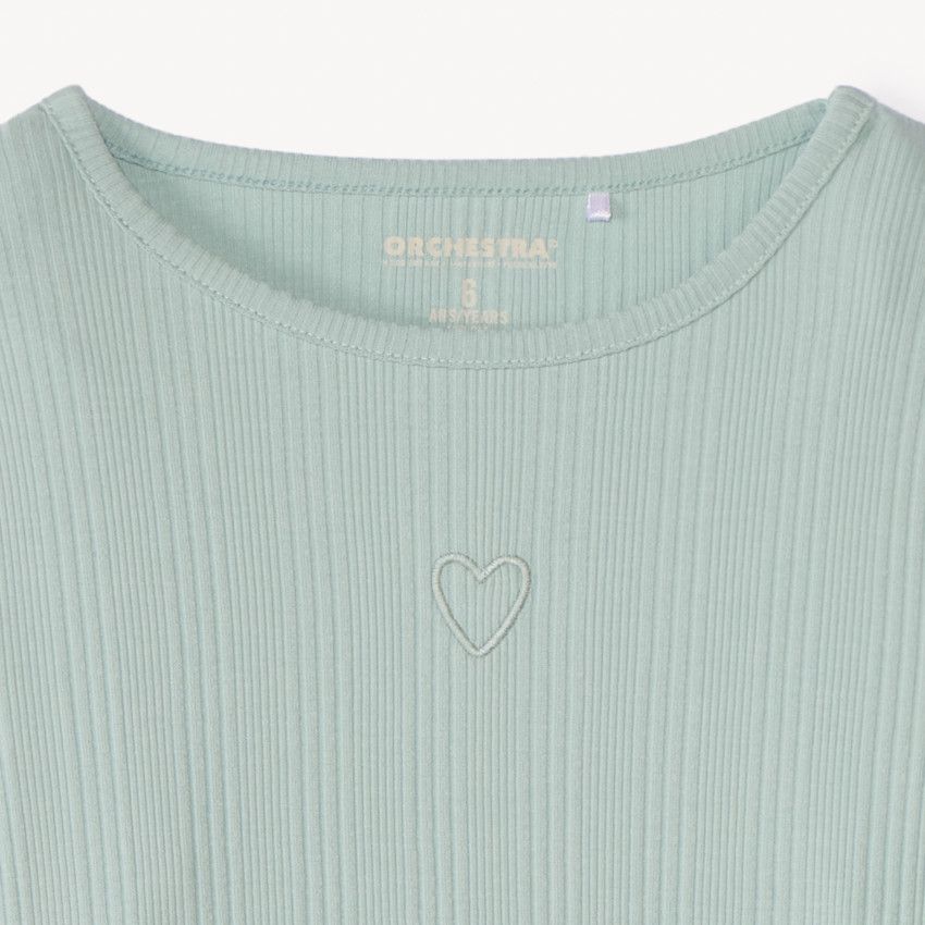 По центру груди расположено вышитое сердечко — лаконичный декоративный акцент, который делает модель более выразительной, сохраняя минималистичный дизайн. Длинные рукава повышают практичность и позволяют носить футболку в прохладную погоду.