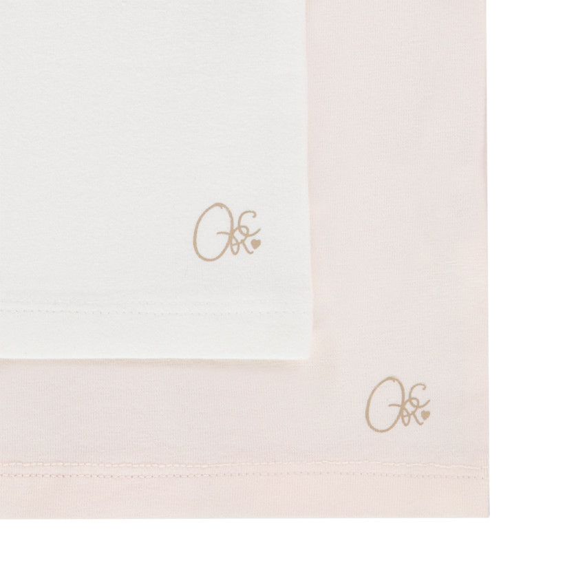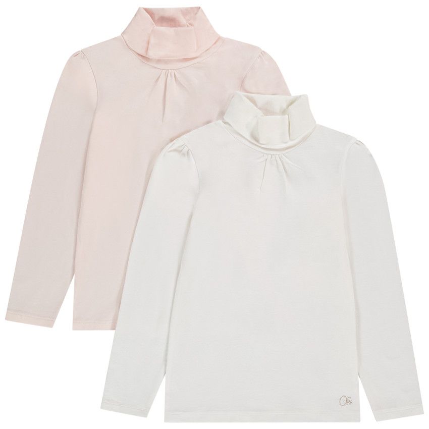 | Комплект из двух трикотажных водолазок для девочек. Модели с воротником-стойкой, легкой сборкой на плечах и под горловиной. Однотонные, украшены золотистым логотипом у нижнего края. Идеально подойдут для школы, прогулок и повседневных образов. |