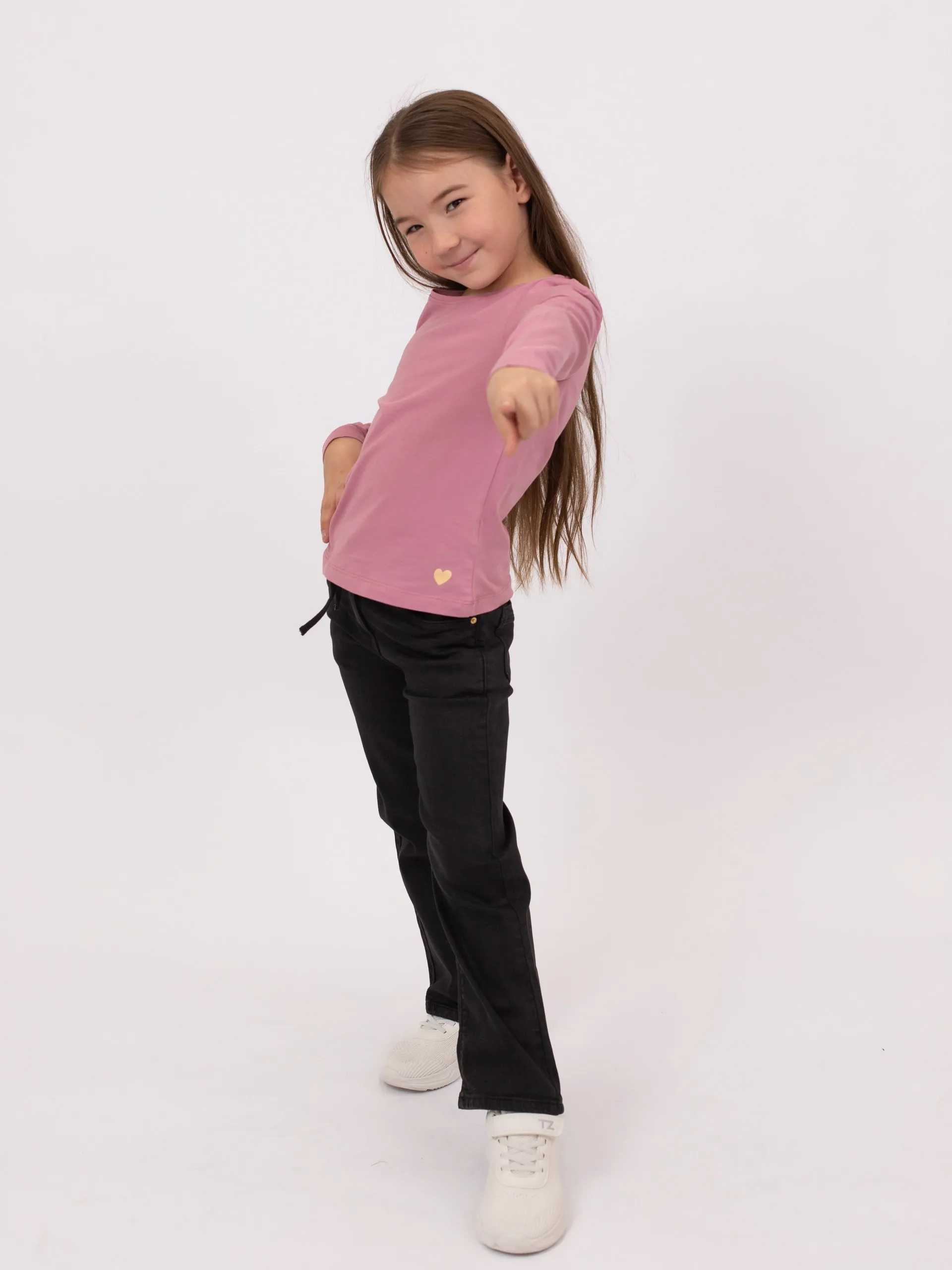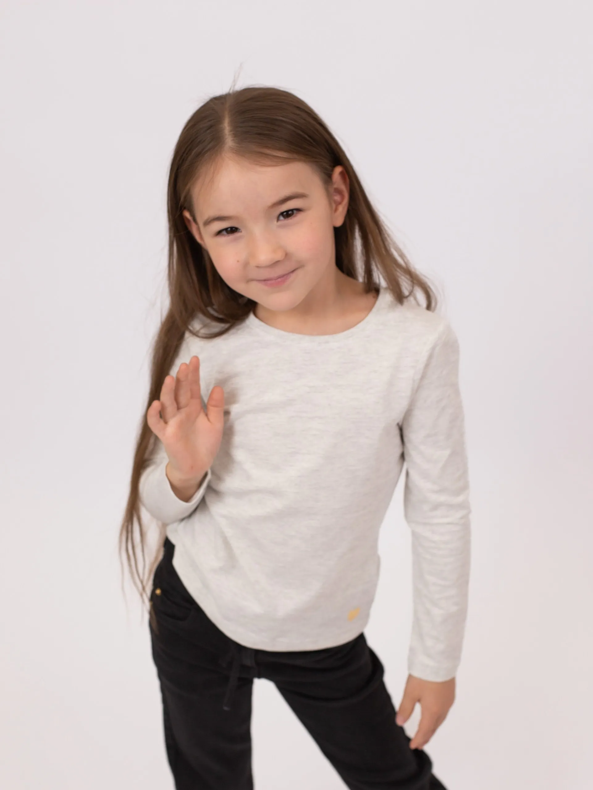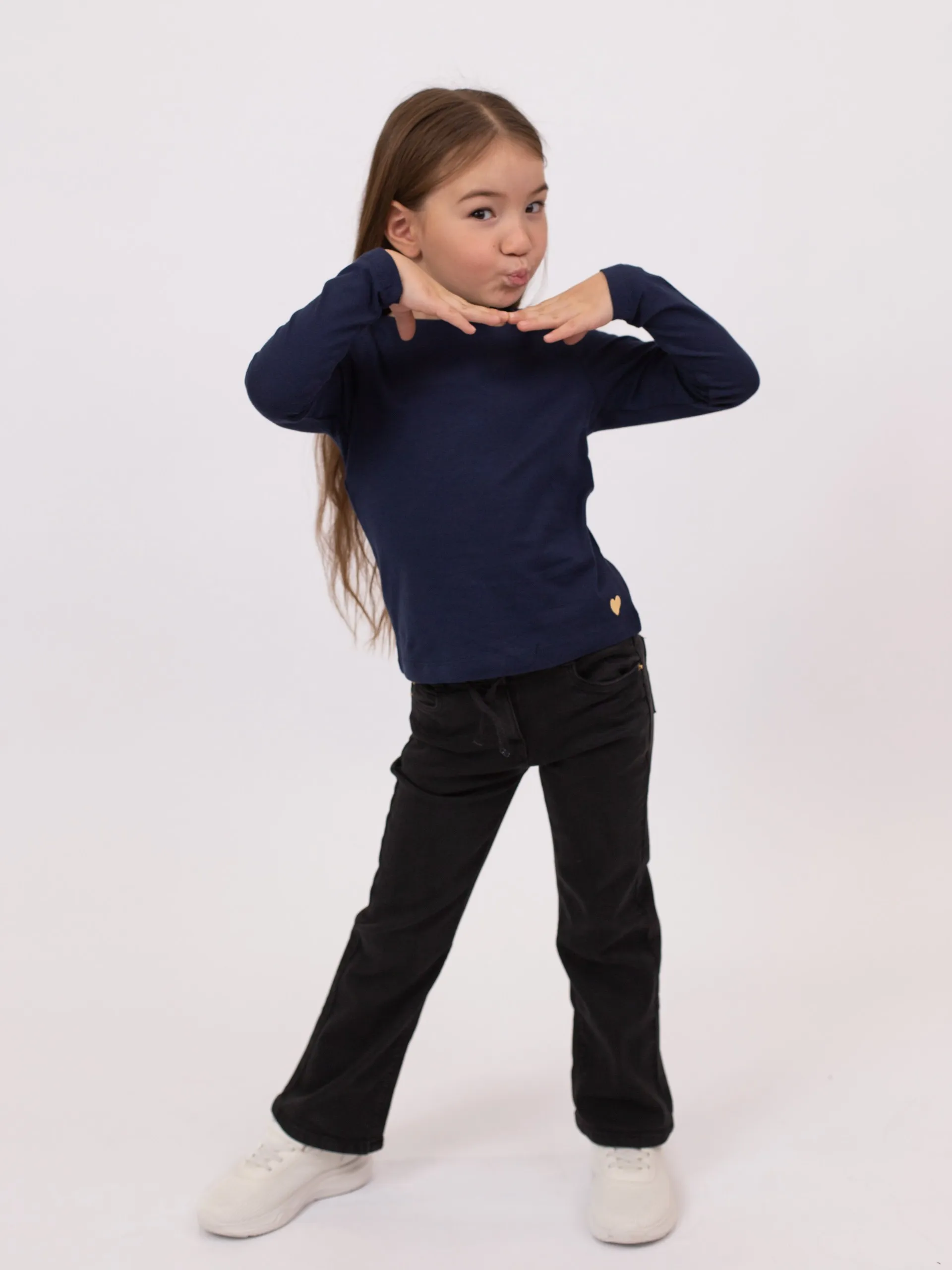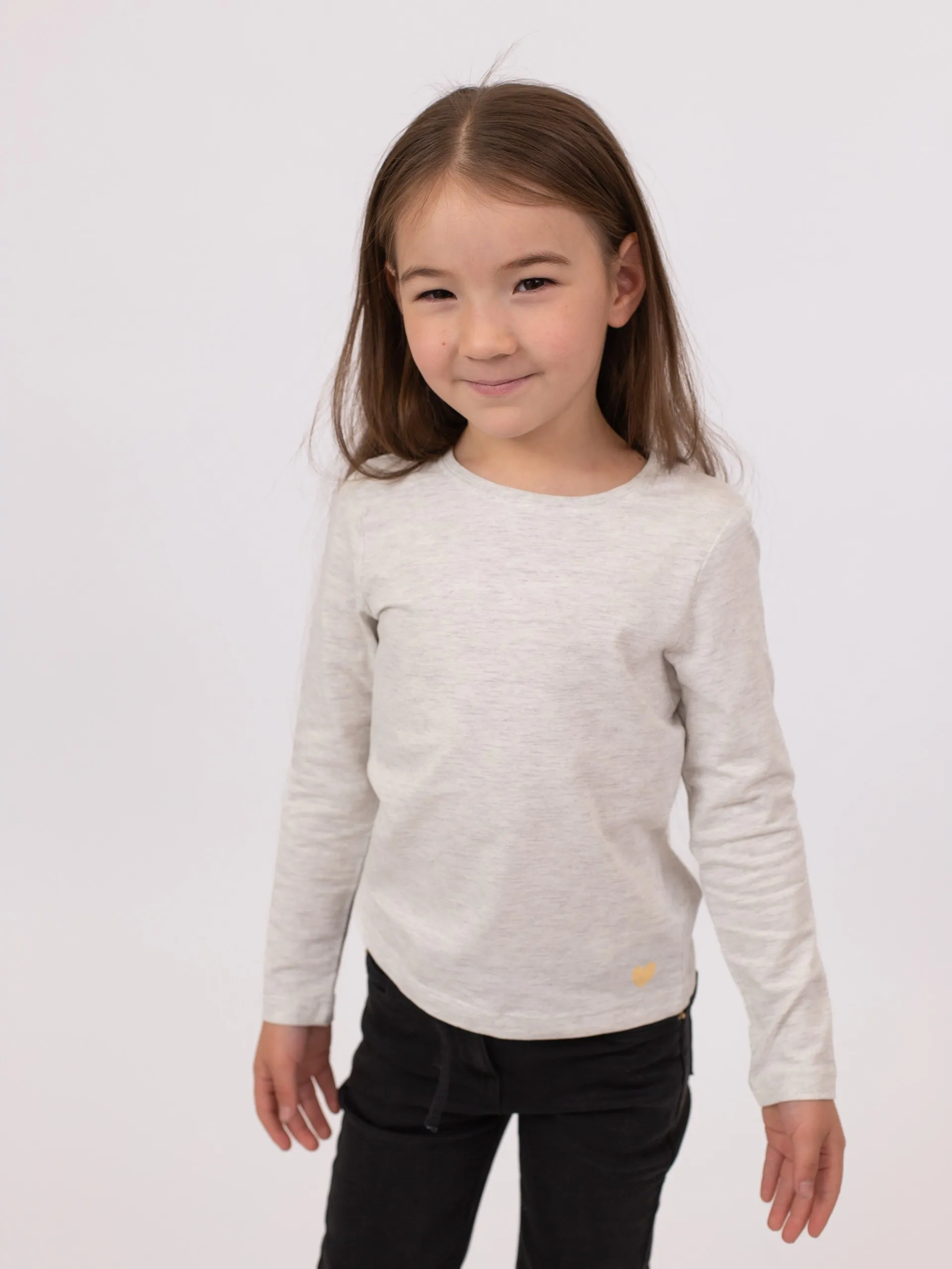 Набор из трёх футболок с длинными рукавами из мягкого трикотажа. Модели однотонные: розовая, тёмно-синяя и серо-меланжевая. Круглый вырез, спереди в одном из углов контрастное сердечко в печатном оформлении. Спинка однотонная.