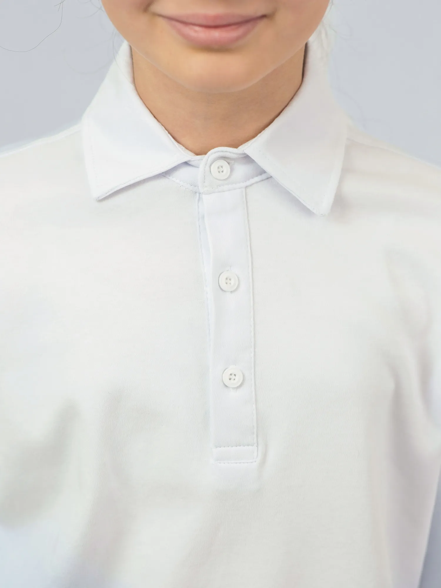 Модель оснащена воротником и застёжкой с пуговицами по центру на груди, что придаёт изделию аккуратный и стильный вид. Поло отлично сочетается с брюками и юбками, подходит для школьных будней и официальных мероприятий.