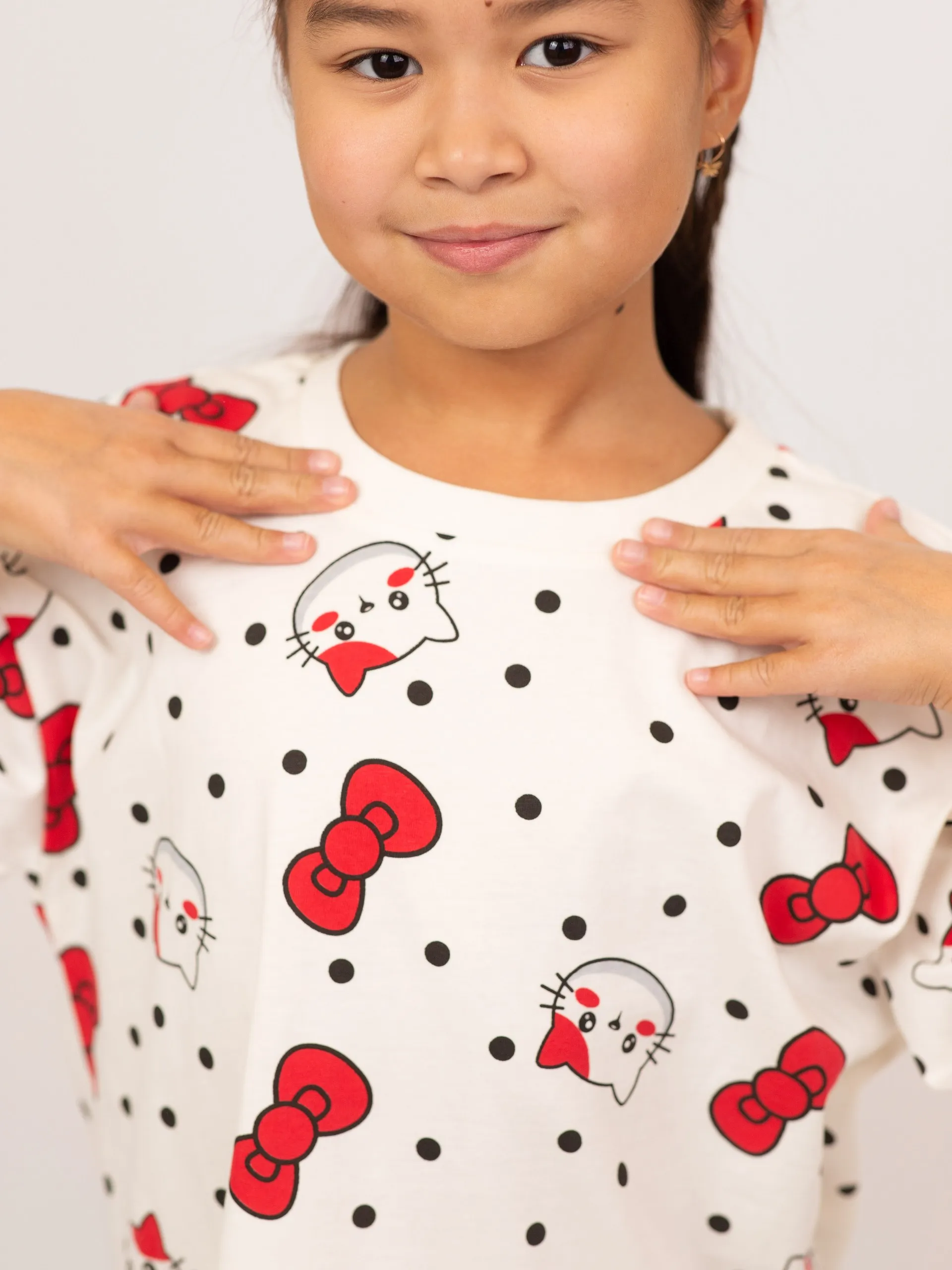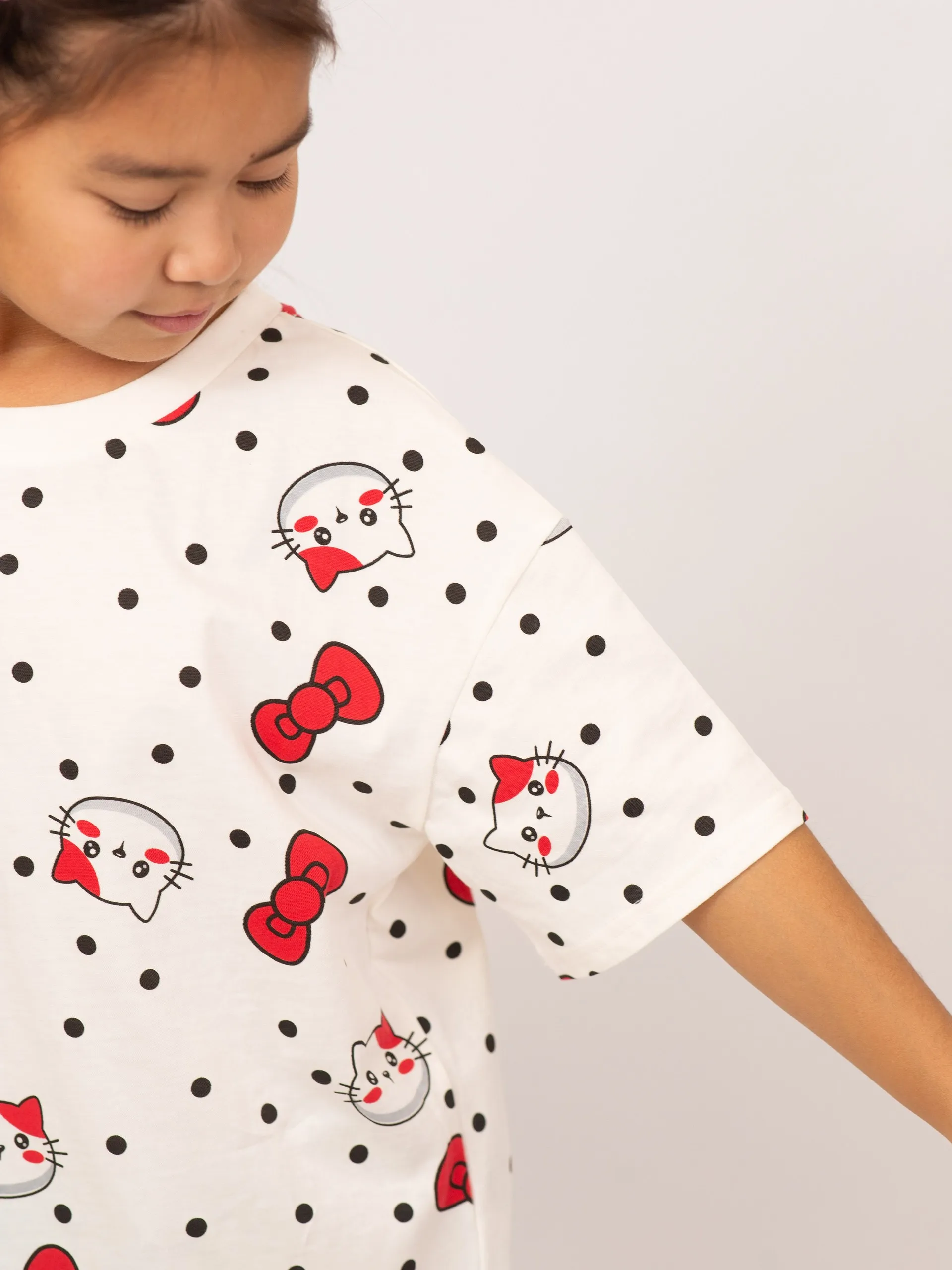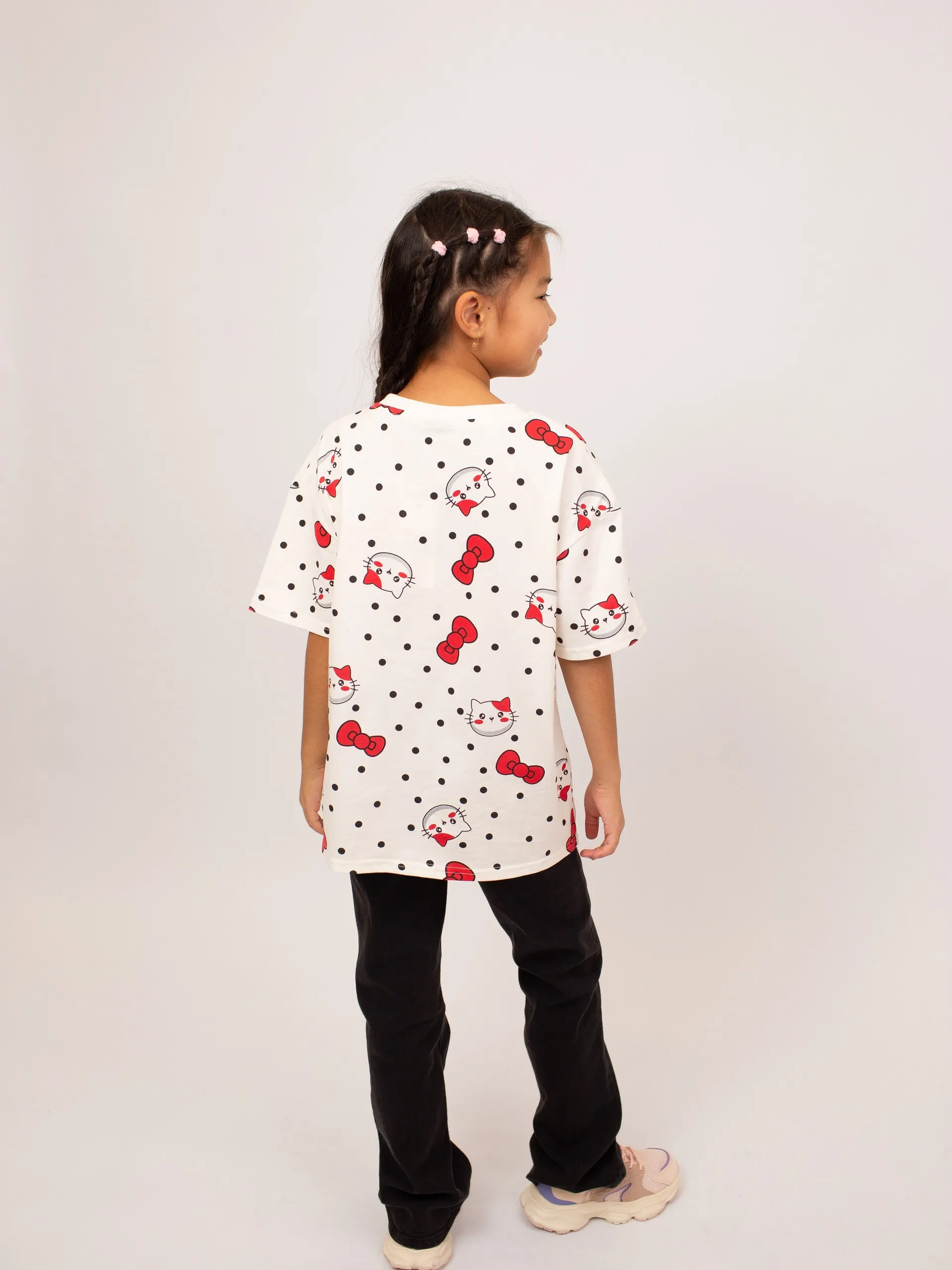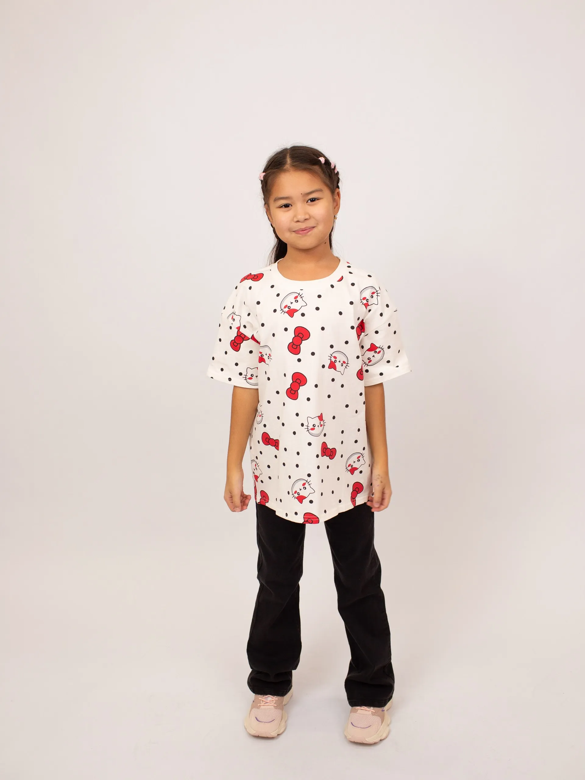 Футболка для девочки выполнена из мягкого хлопка, обеспечивающего комфорт и свободу движений в течение дня. Модель с короткими рукавами украшена ярким принтом с милыми бантиками и забавными мордочками на фоне гороха, что придаёт образу игривость и настроение. Классический прямой крой делает футболку удобной для повседневной носки и идеально сочетается с джинсами, шортами или юбками. Отличный выбор для активных и стильных девочек.