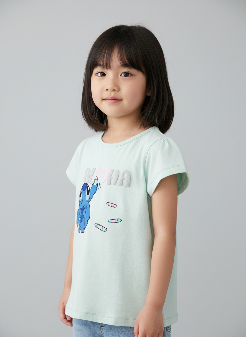 Модель украшена принтом Стича, расположенным по центру, который добавляет образу игривость и яркий акцент. Рукава-фонарики придают футболке аккуратный и нарядный вид, делая её отличным выбором как для повседневных, так и для более стильных образов.